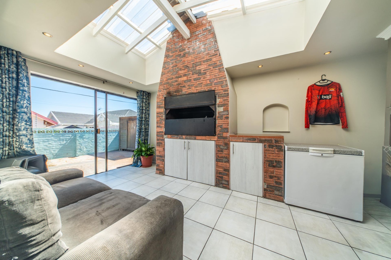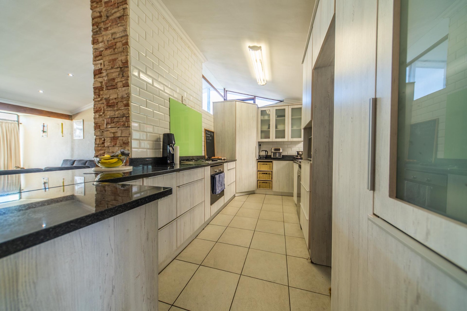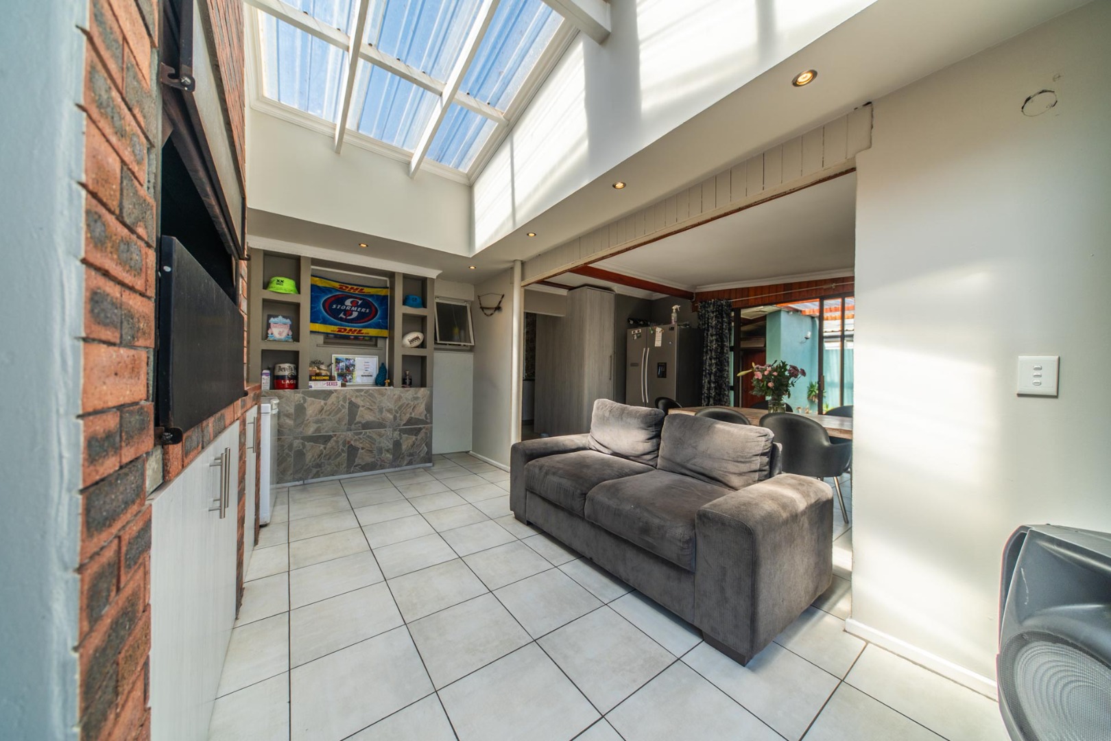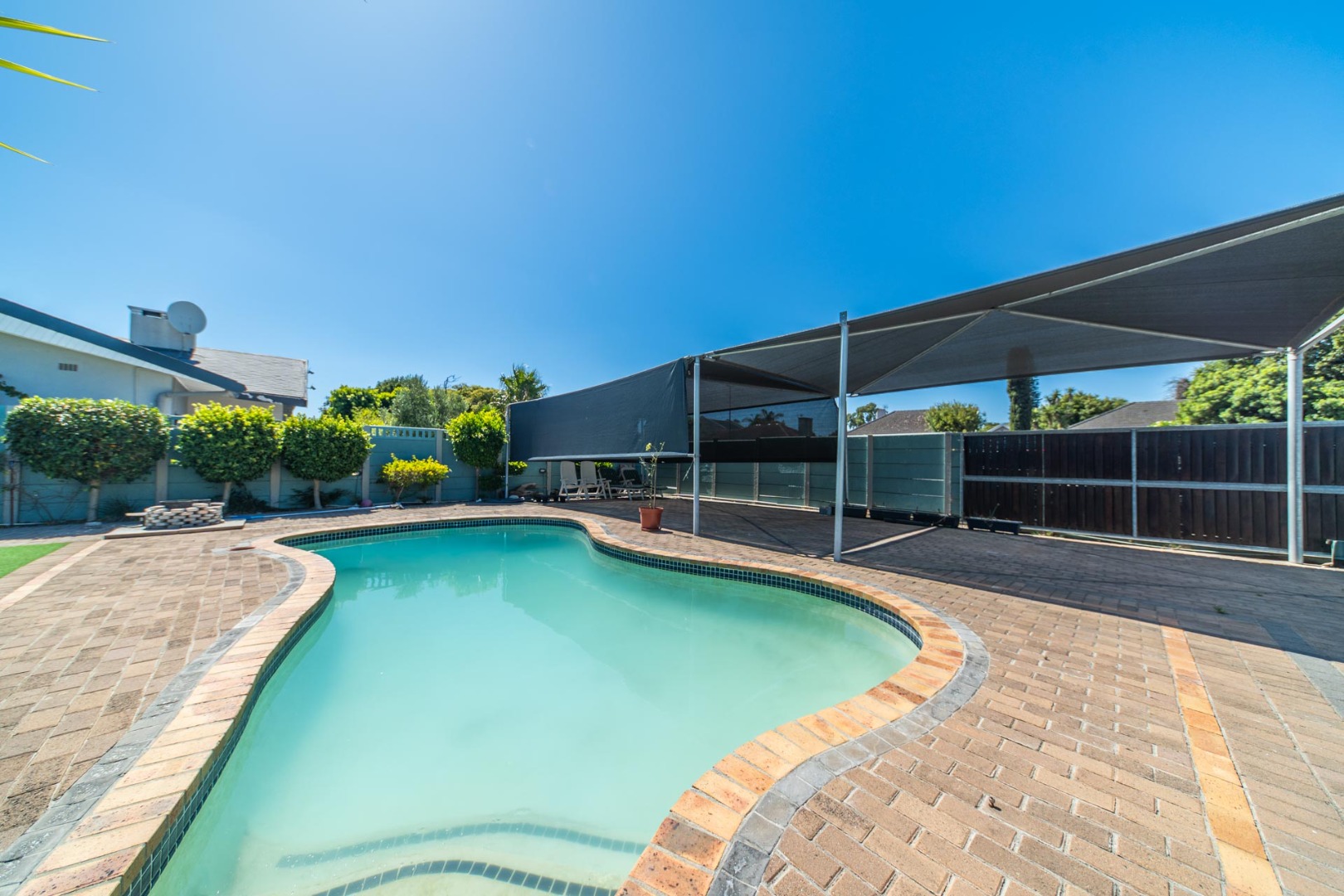 The main house features a large open-plan TV and living area with fireplace, opening via sliding doors to a sparkling swimming pool and garden. The open-plan kitchen flows into the living spaces, with a separate dining and braai room leading to the backyard.