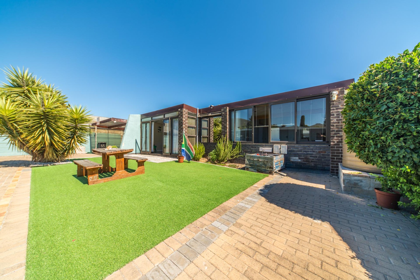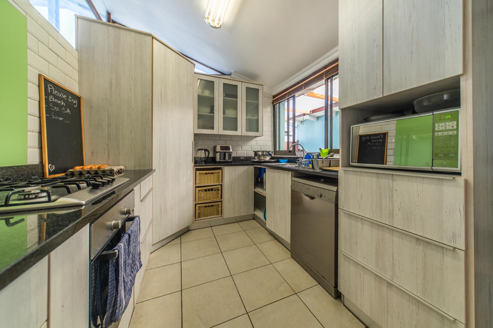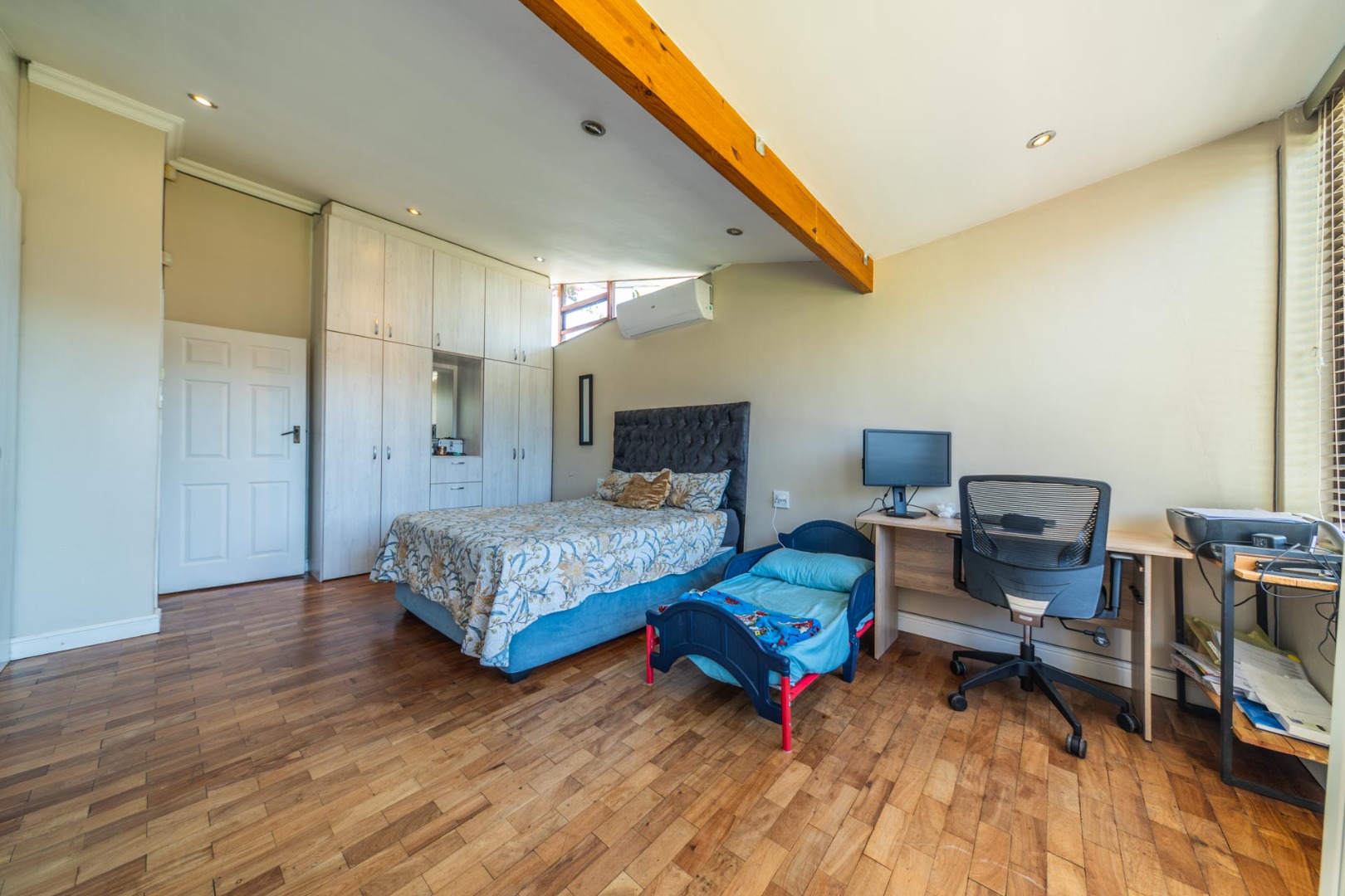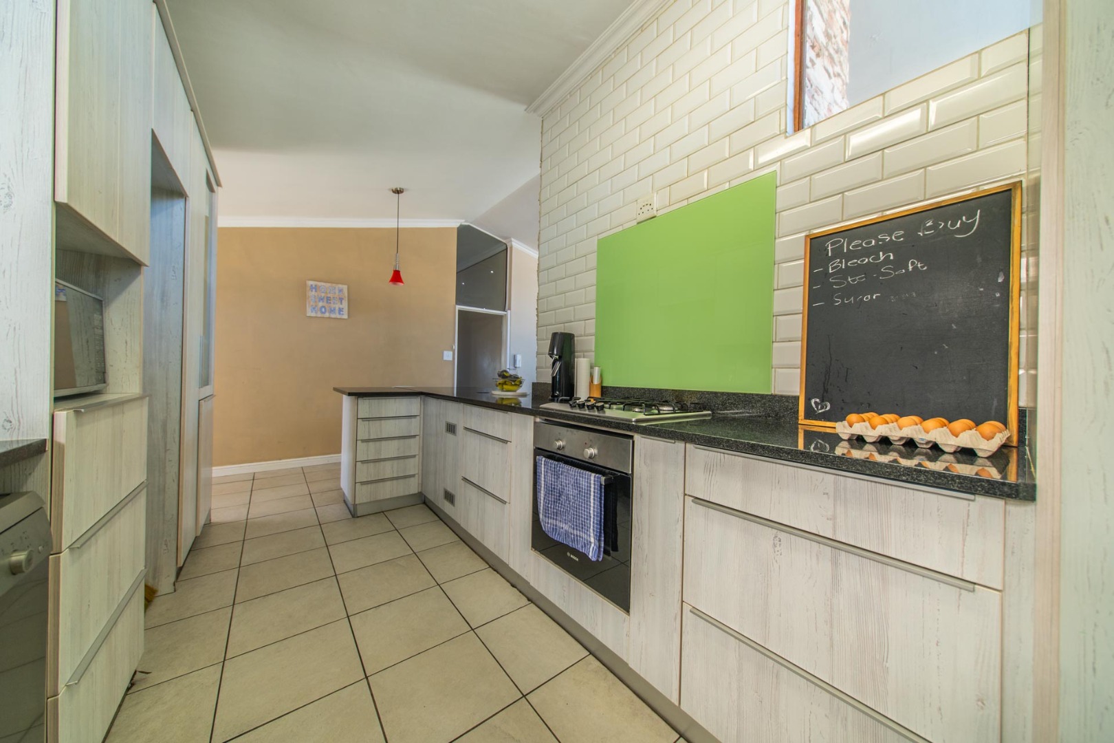 The main house features a large open-plan TV and living area with fireplace, opening via sliding doors to a sparkling swimming pool and garden. The open-plan kitchen flows into the living spaces, with a separate dining and braai room leading to the backyard.