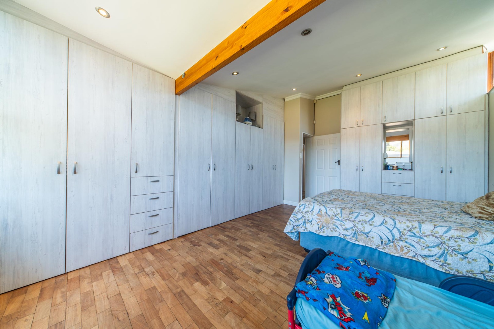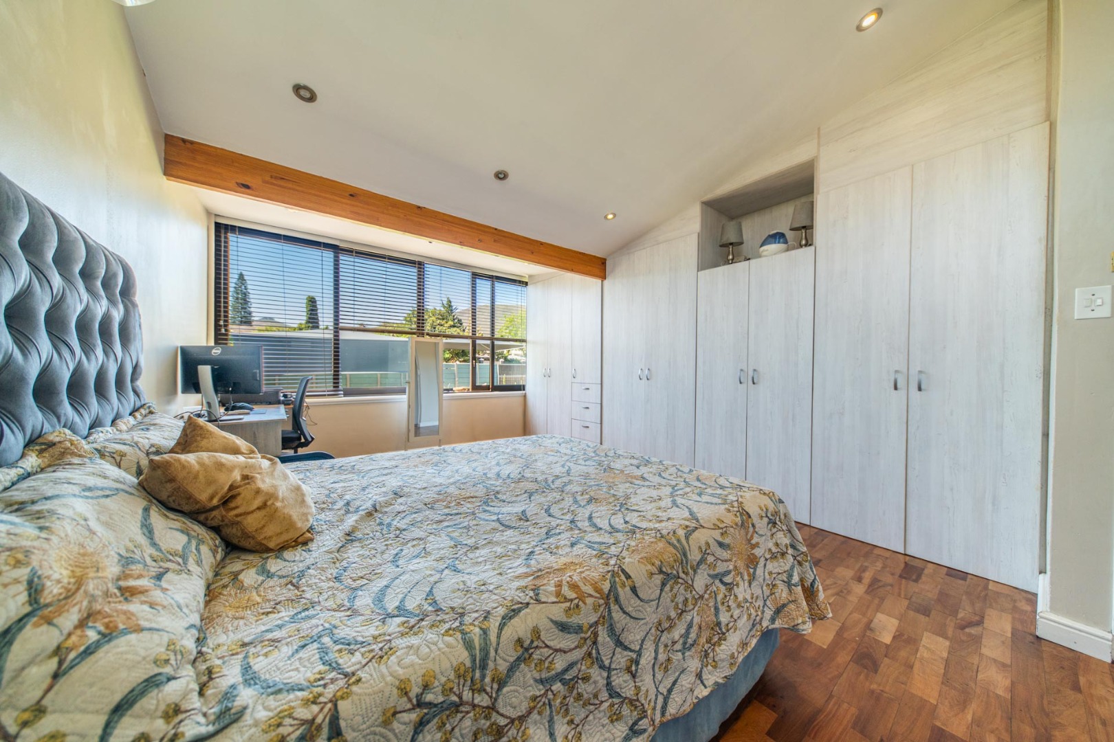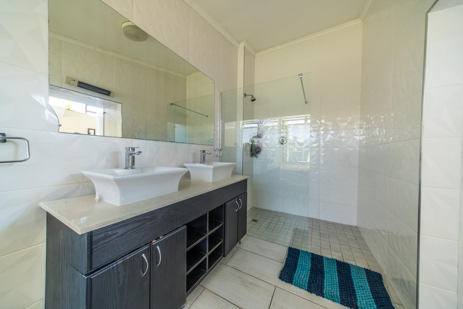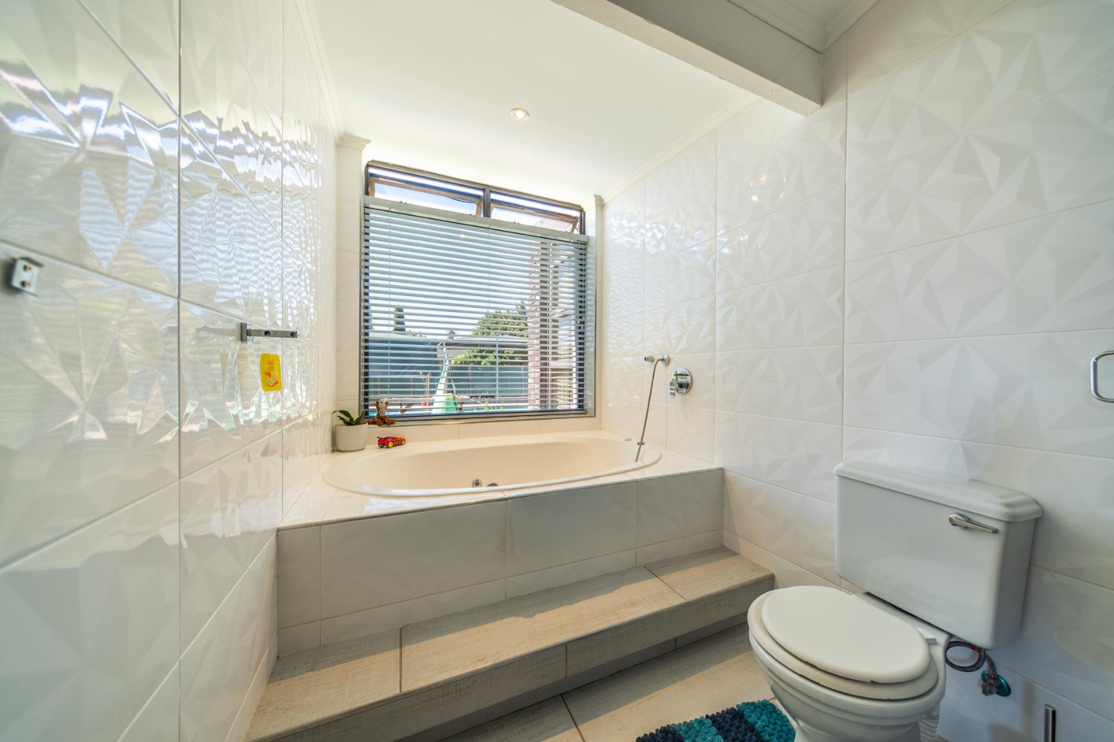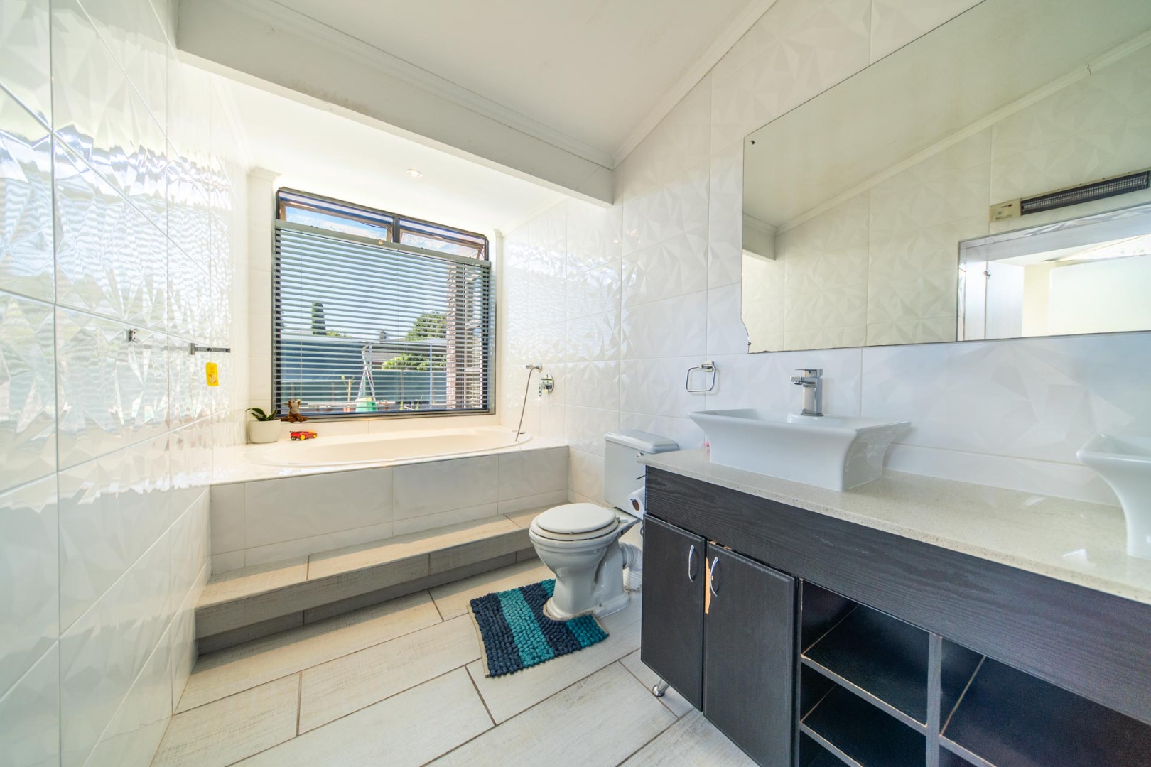The main bedroom offers ample built-in cupboards and pool views, with a full en-suite bathroom including a spa bath, double shower, and double basins. Two additional bedrooms are serviced by a separate bathroom and guest toilet.