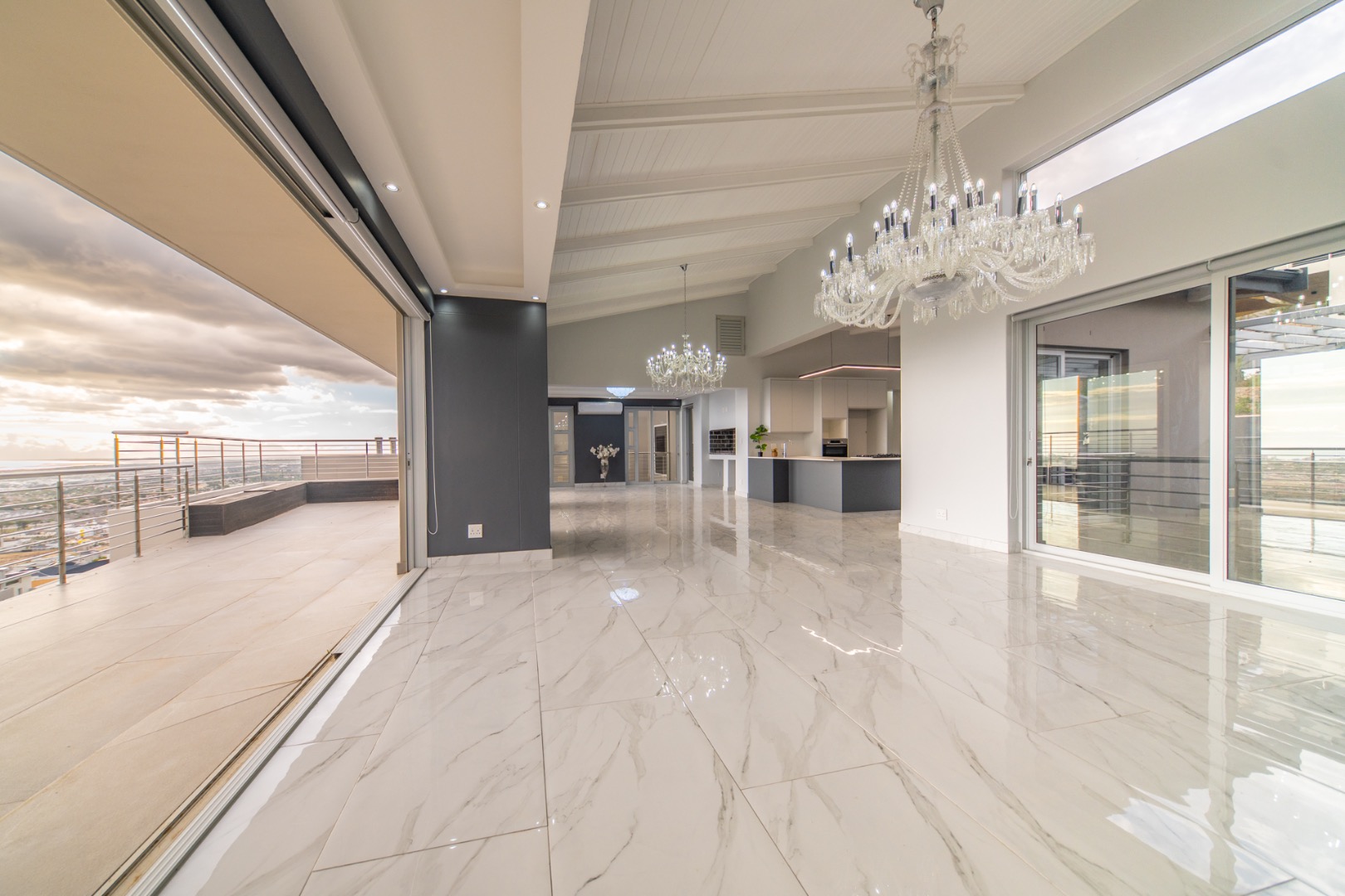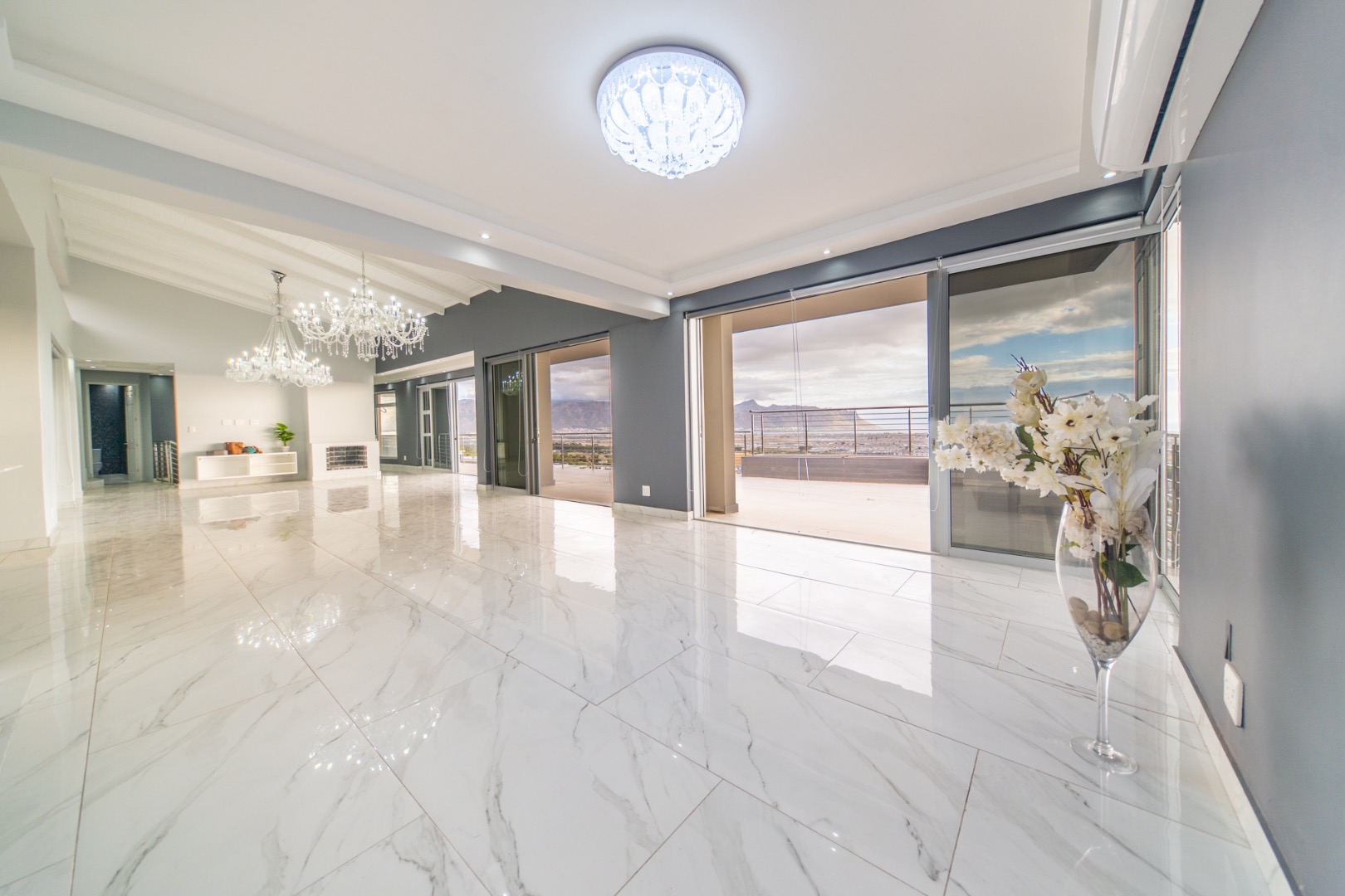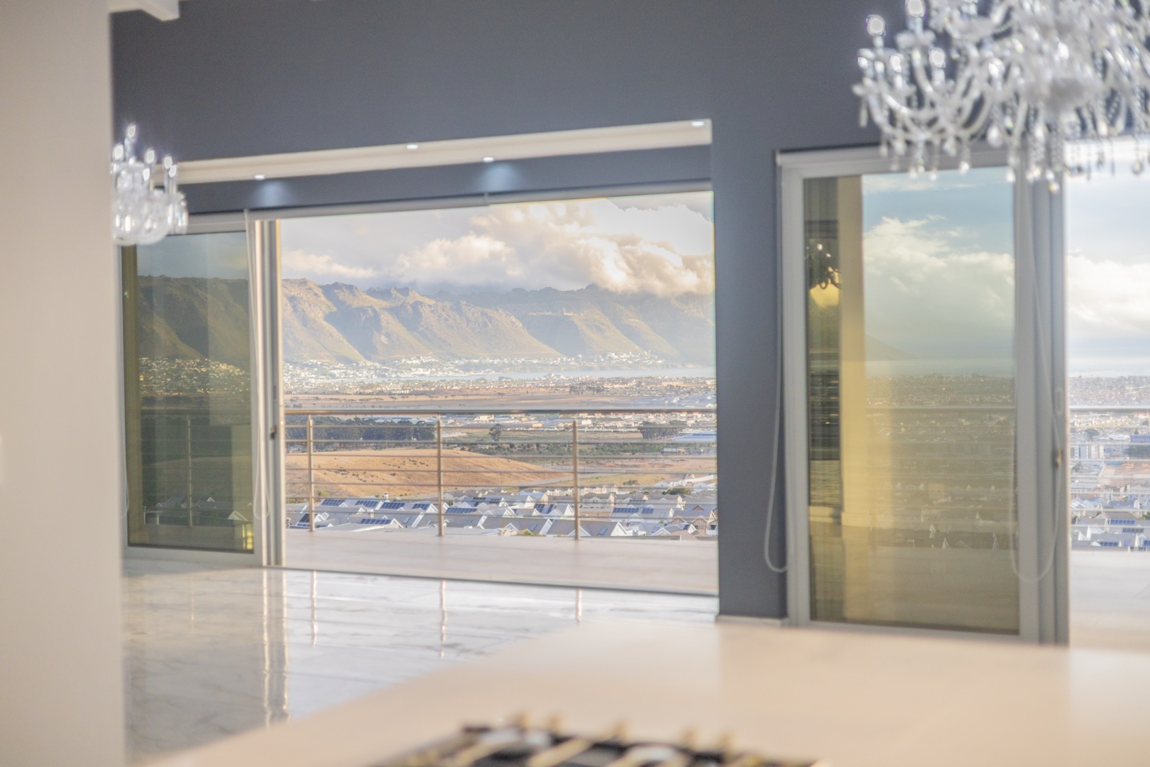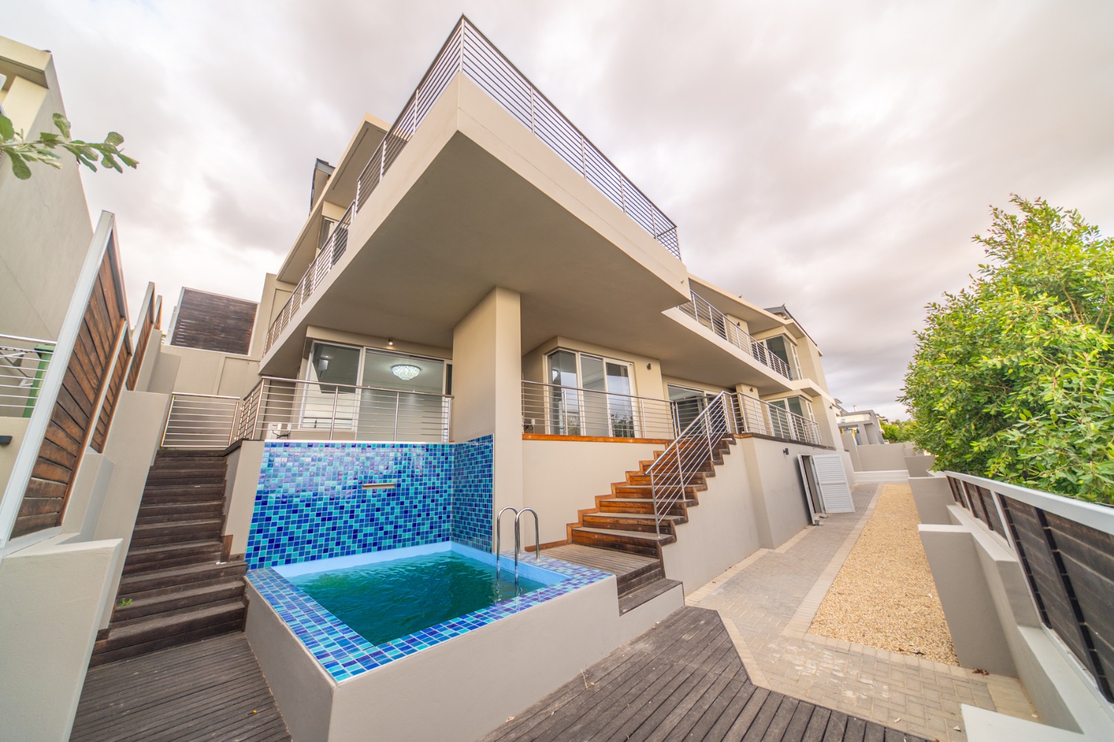 Discover contemporary living in this magnificent 5-bedroom residence nestled within the prestigious Fairhaven Country Estate in Somerset West. This modern, multi-level home boasts a striking architectural design with clean lines and an abundance of natural light, enhanced by large windows and sliding doors that frame scenic views. The expansive 654 sqm floor plan offers two spacious lounges and a dedicated dining room, all featuring high ceilings, elegant chandeliers, and sleek marble-look tiled flooring, creating an open and inviting atmosphere. A modern fireplace adds warmth and character, complemented by air conditioning for year-round comfort. The property features two state-of-the-art kitchens, each designed with modern aesthetics, sleek cabinetry, and integrated hobs on central islands, perfect for culinary enthusiasts and entertaining. With five well-appointed bedrooms and four bathrooms, including three en-suite, plus a convenient guest toilet, this home provides ample space and privacy for families. The master suite and additional bedrooms offer comfortable retreats. Outdoor living is a highlight, with multiple spacious balconies, a patio, and a deck providing extensive areas for relaxation and enjoying the panoramic vistas. A private plunge pool offers a refreshing escape, while the built-in braai is ideal for outdoor entertaining. Practical amenities include two garages and two additional parking spaces. The home is equipped with a battery inverter and benefits from fibre connectivity, ensuring modern convenience and efficiency. As part of a secure estate with 24-hour security and an access gate, residents enjoy peace of mind. Fairhaven Country Estate offers an exclusive lifestyle in Somerset West, a sought-after area known for its natural beauty and proximity to amenities. This estate provides a tranquil environment while being conveniently located. Key Features: * 5 Bedrooms, 4 Bathrooms (3 En-suite) * 2 Modern Kitchens with Integrated Hobs * 2 Spacious Lounges & Dining Room * Private Plunge Pool & Built-in Braai * Multiple Balconies, Patio & Deck * 2 Garages & 2 Parking Spaces * Battery Inverter & Fibre Connectivity * Secure Estate with 24-Hour Security * Air Conditioning & Fireplace