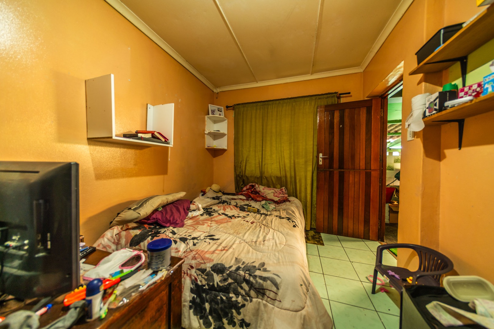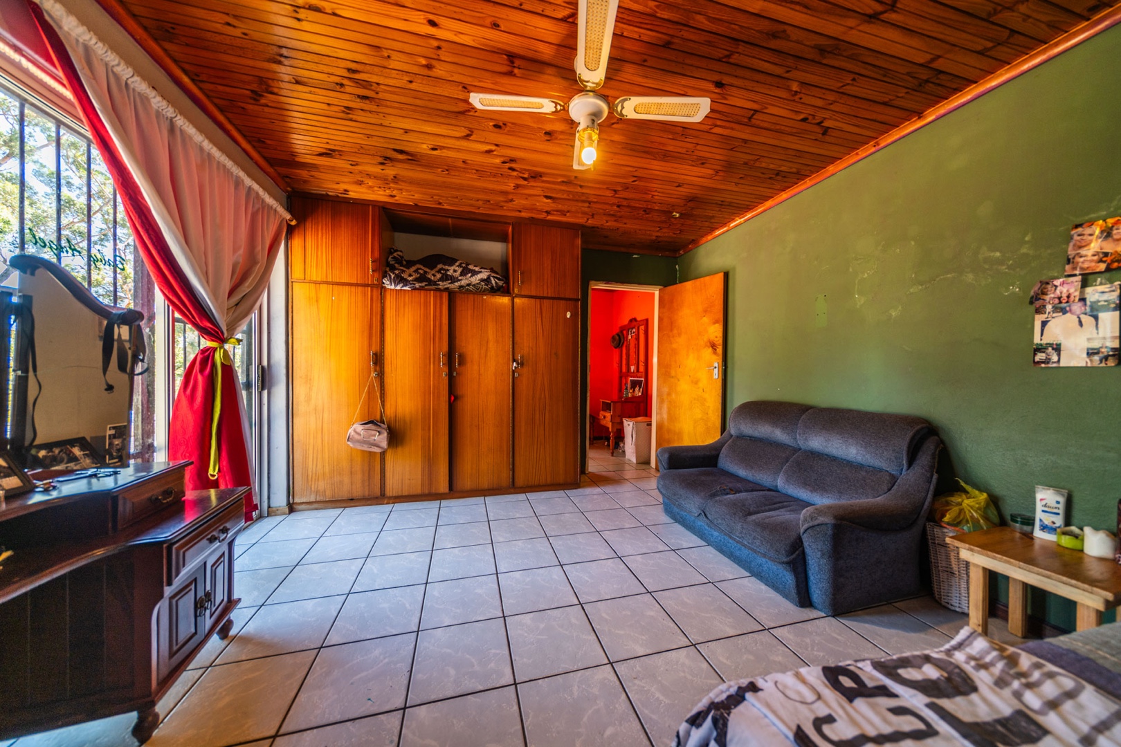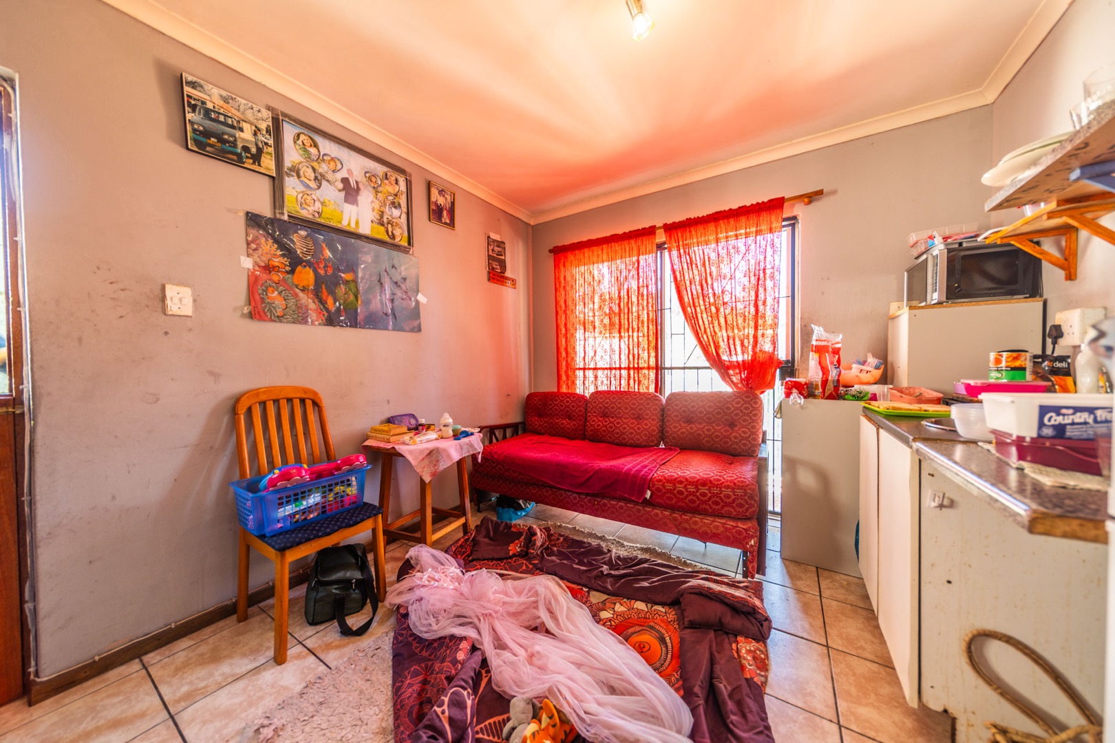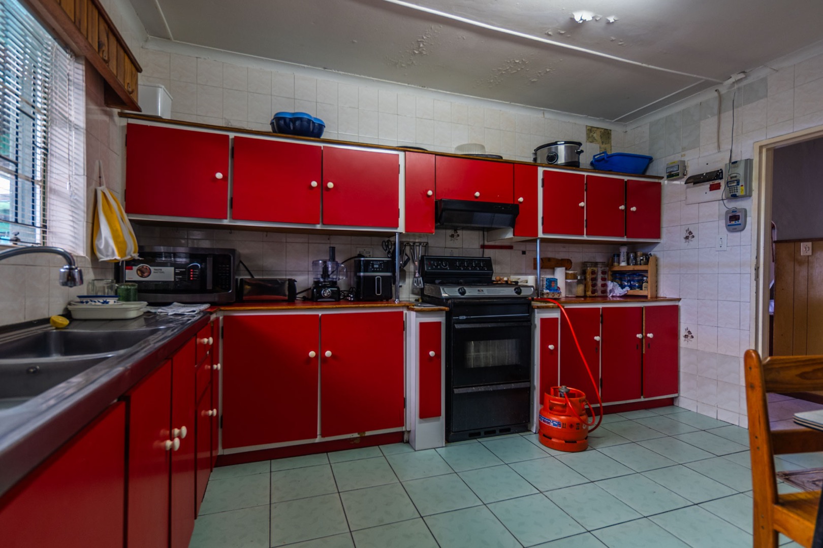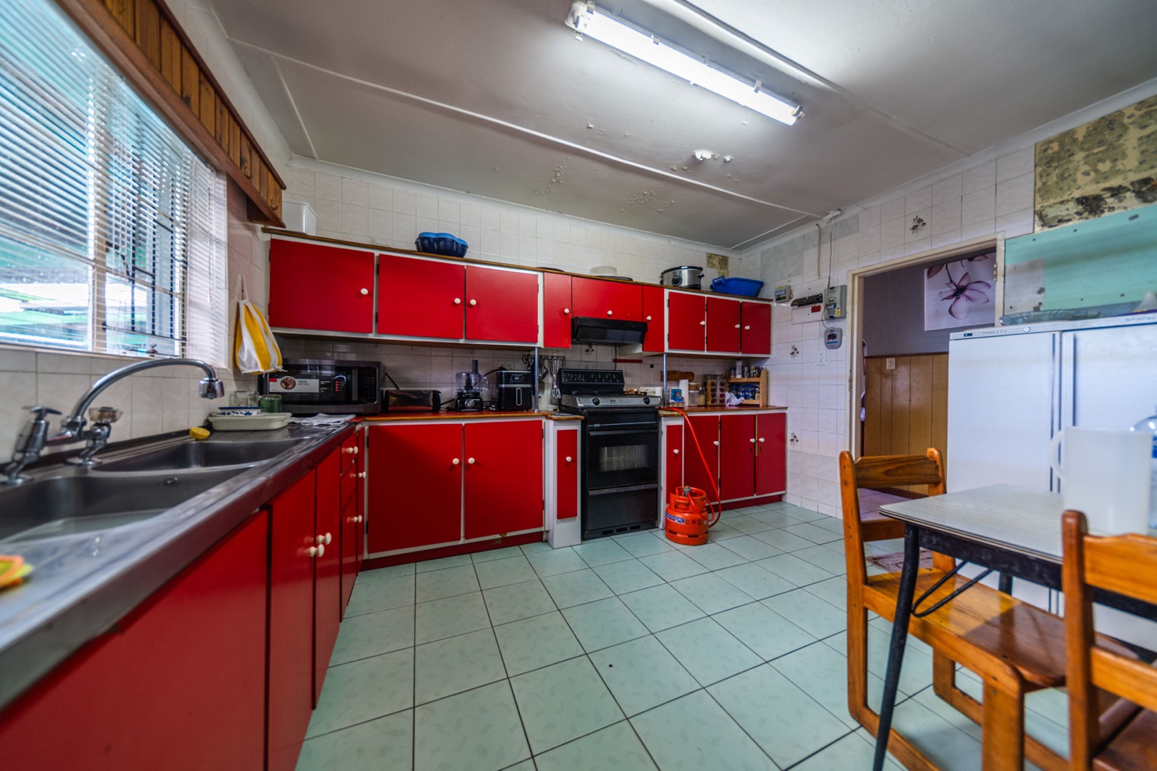 The kitchen, a central hub, features bright red cabinetry offering generous storage, a double sink, and tiled walls and floors for easy maintenance. A dedicated dining space within the kitchen benefits from natural light. While functional, the kitchen's aesthetic is dated and shows signs of wear, presenting an ideal canvas for a modern upgrade tailored to your taste.