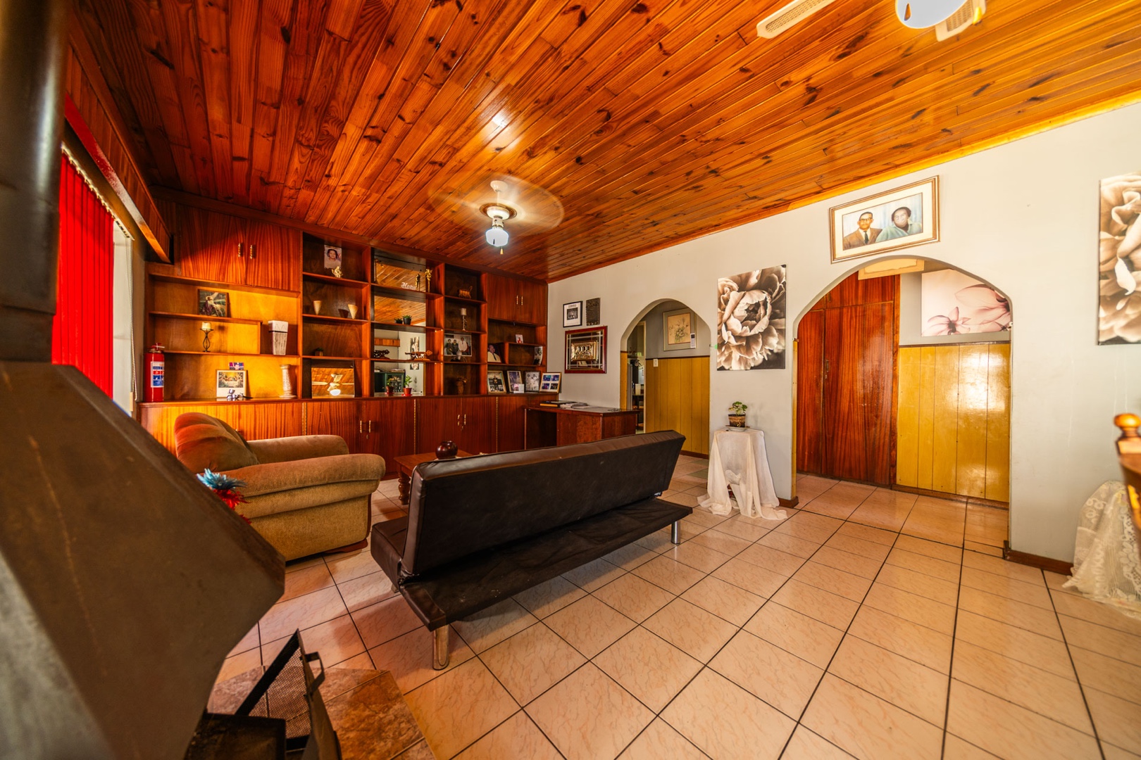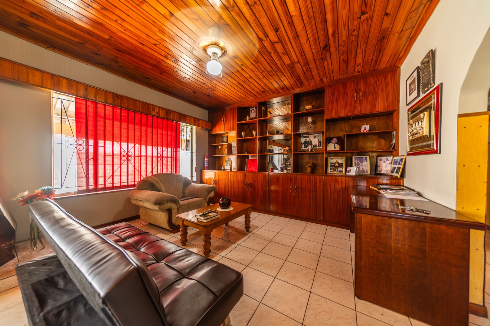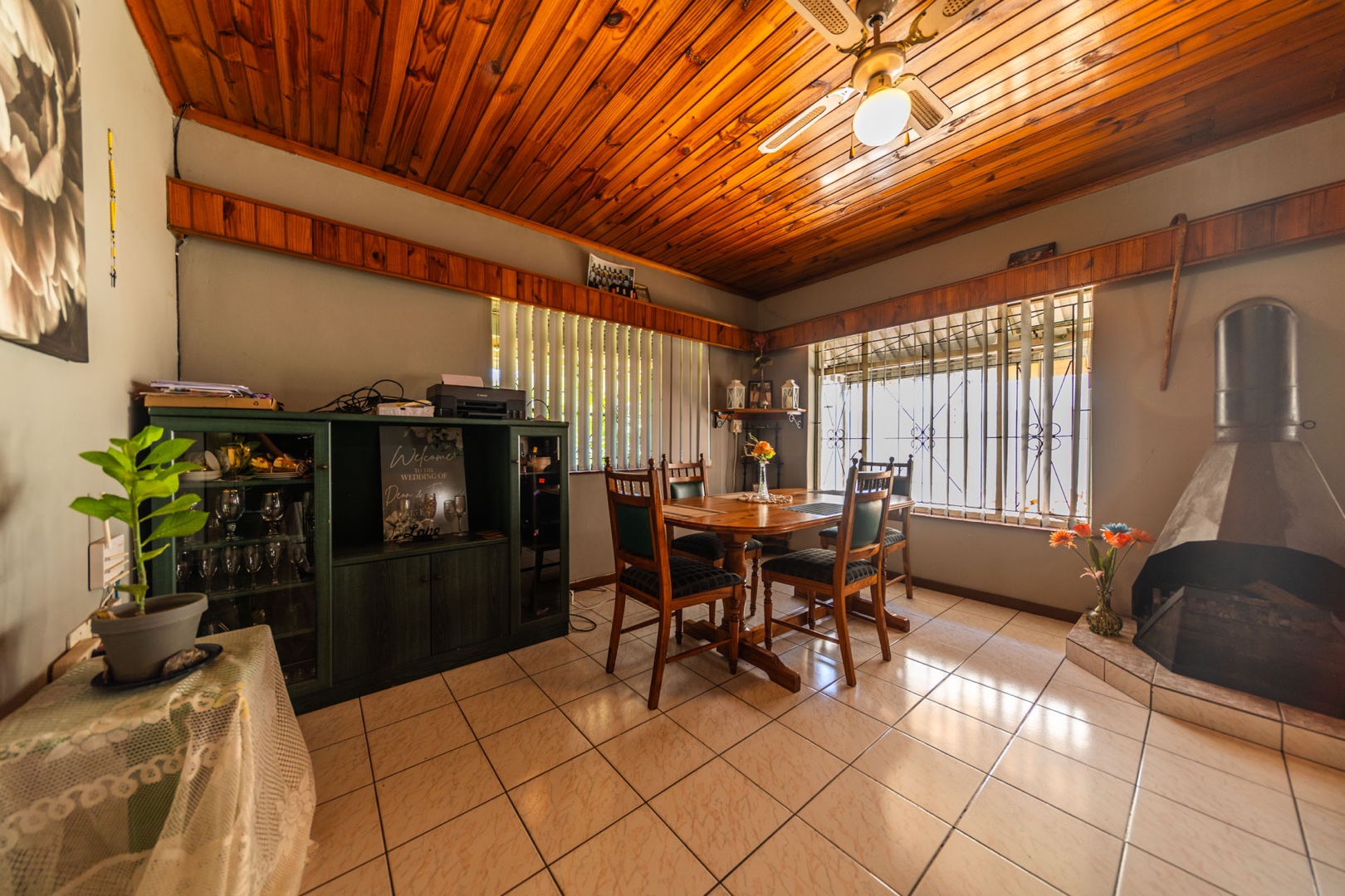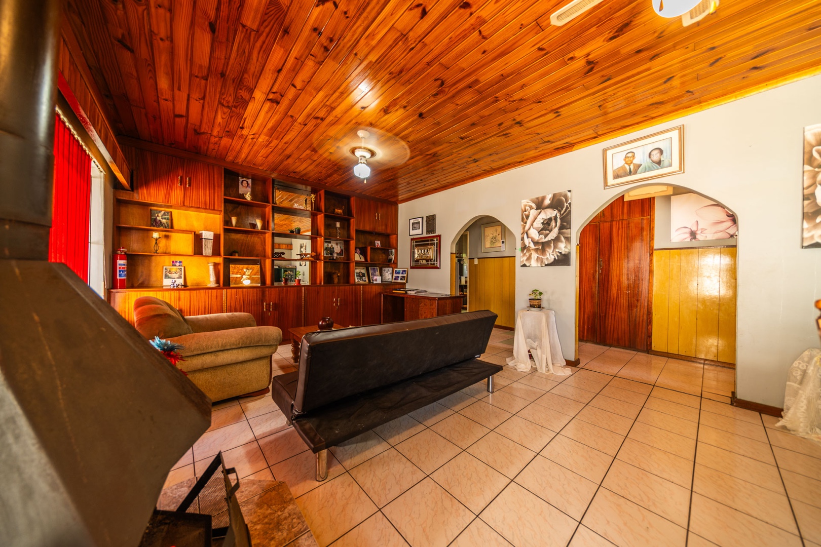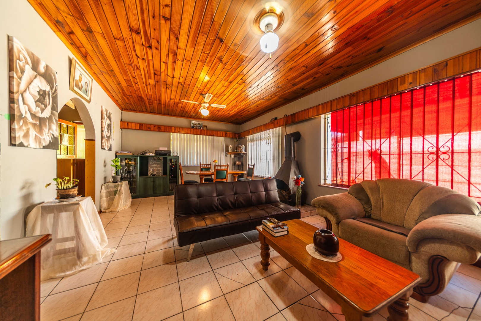 Inside, the home boasts a functional layout designed for comfortable living. The lounge and dining areas are characterized by warm wood-paneled ceilings and durable tiled flooring, creating a welcoming atmosphere. A wood-burning stove and a built-in fireplace/braai add to the home's appeal, perfect for cooler evenings. Extensive custom wood cabinetry and shelving provide ample storage and display options throughout these communal spaces.