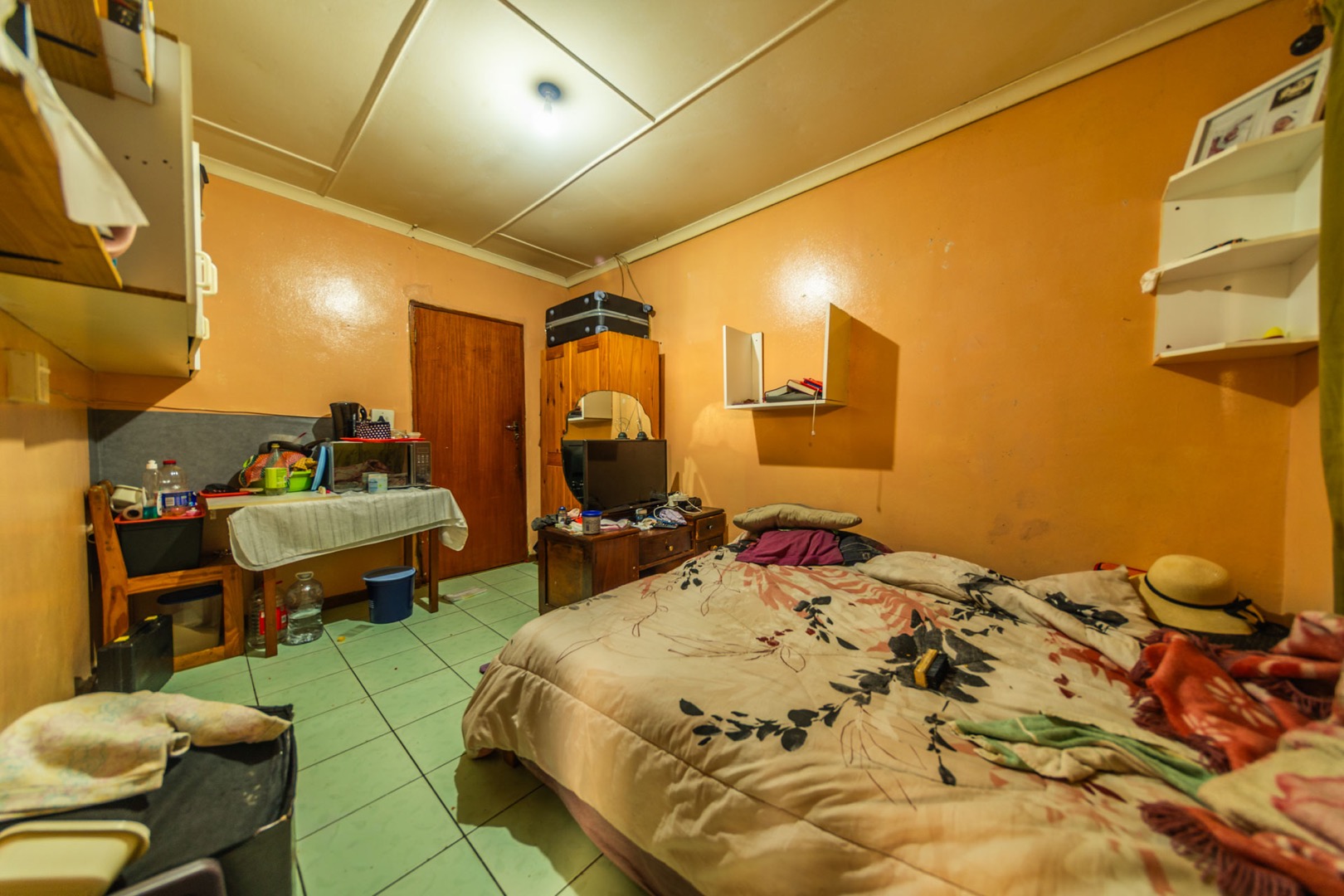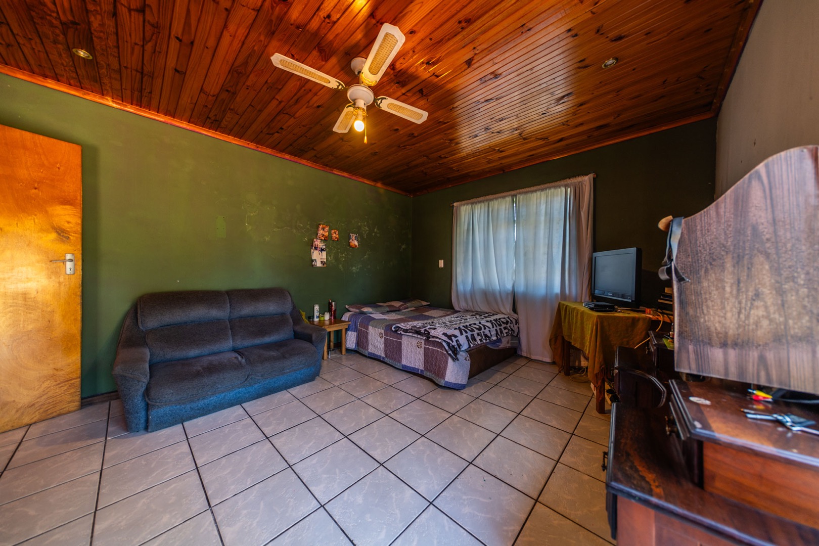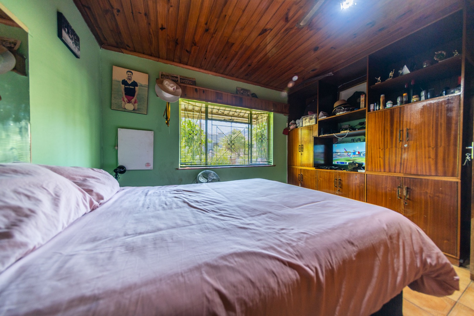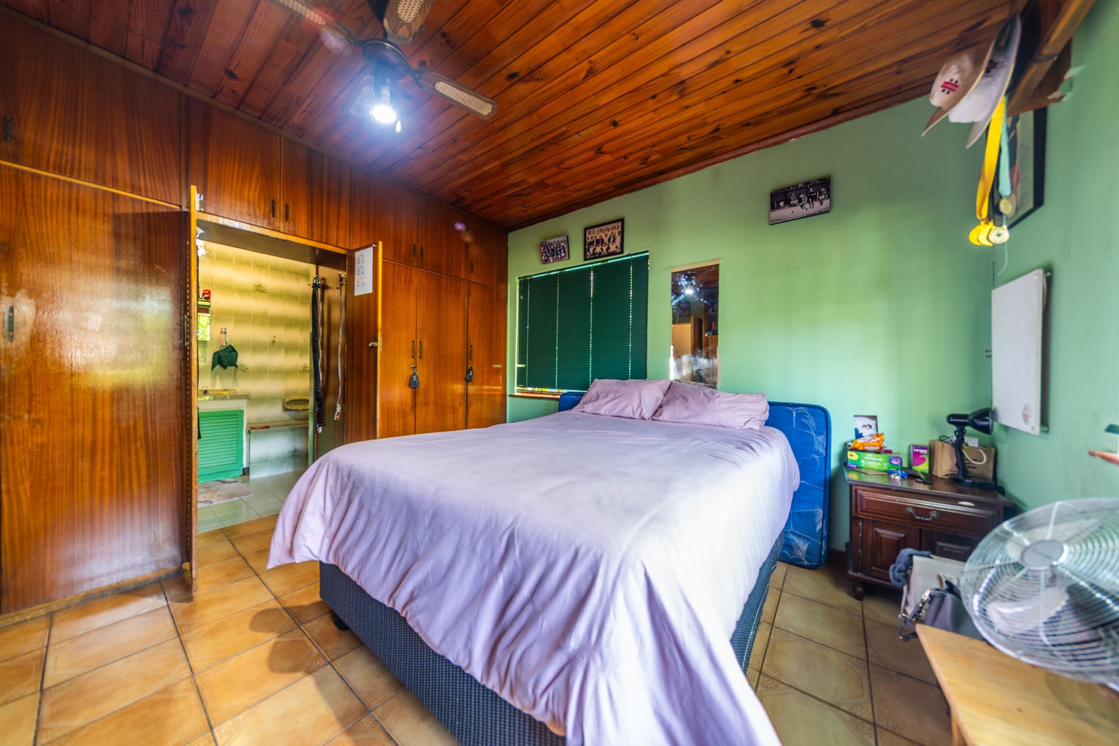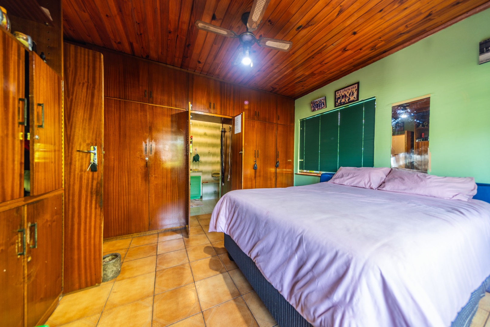Inside, the home boasts a functional layout designed for comfortable living. The lounge and dining areas are characterized by warm wood-paneled ceilings and durable tiled flooring, creating a welcoming atmosphere. A wood-burning stove and a built-in fireplace/braai add to the home's appeal, perfect for cooler evenings. Extensive custom wood cabinetry and shelving provide ample storage and display options throughout these communal spaces.