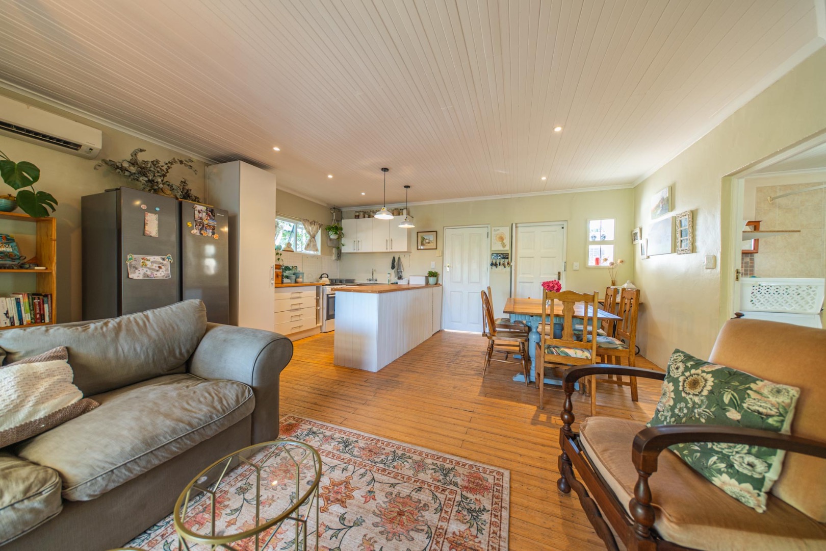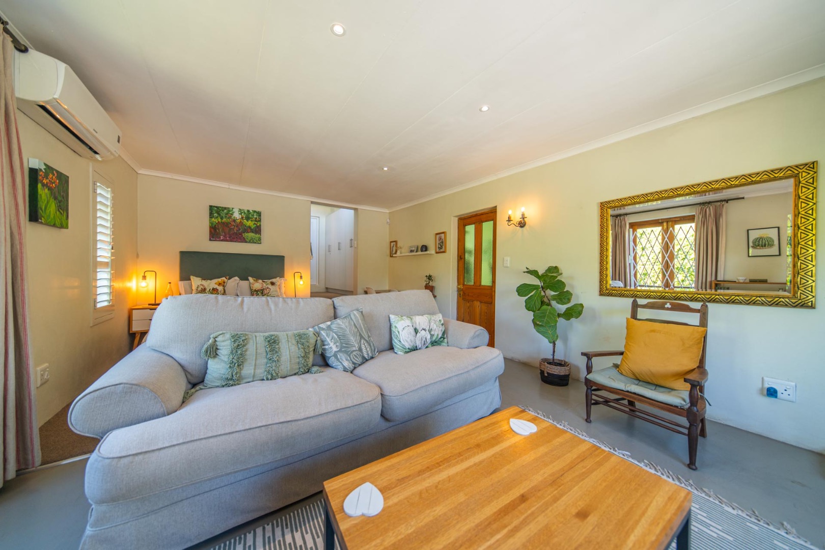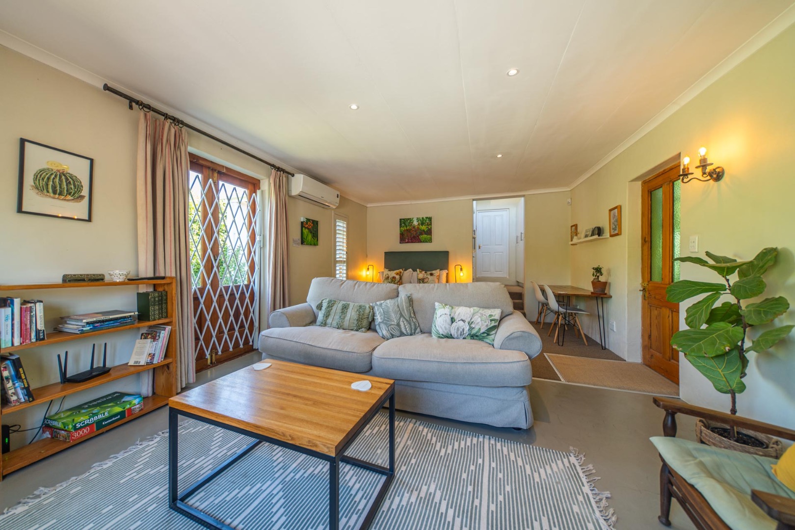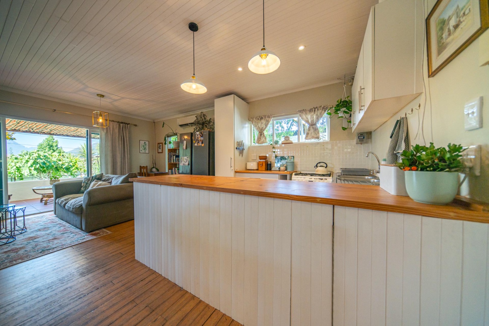 Open-plan kitchen and living room with airconditioner and fireplace leading onto a covered stoep overlooking the tranquil back garden