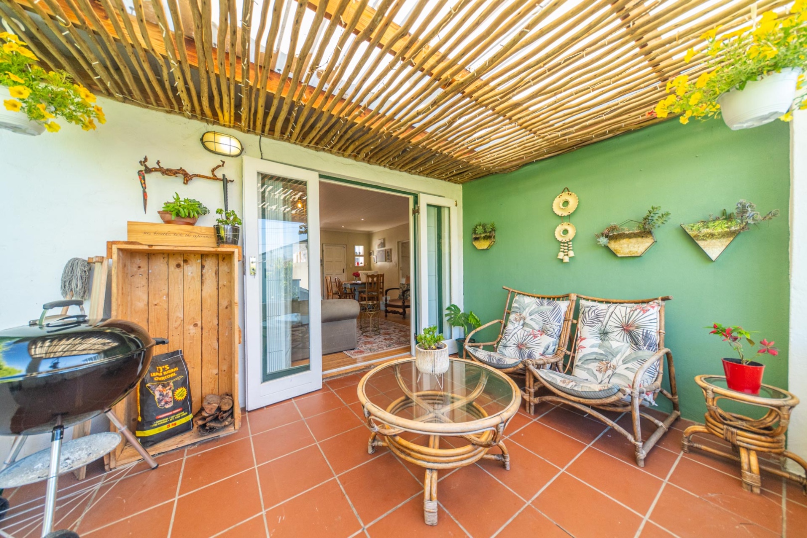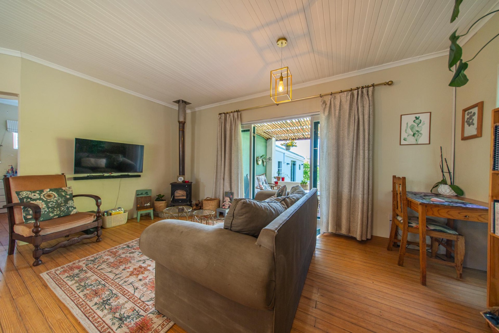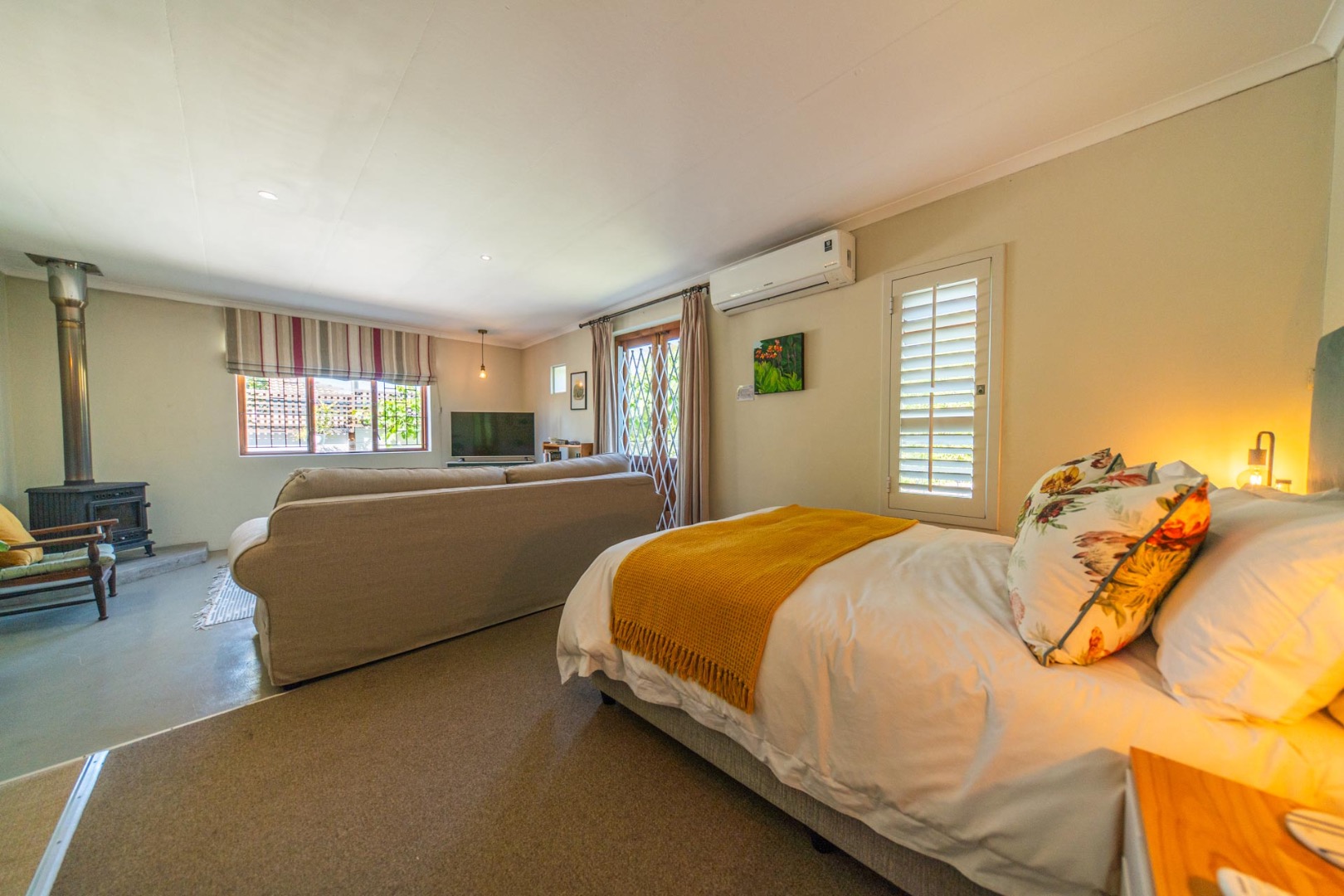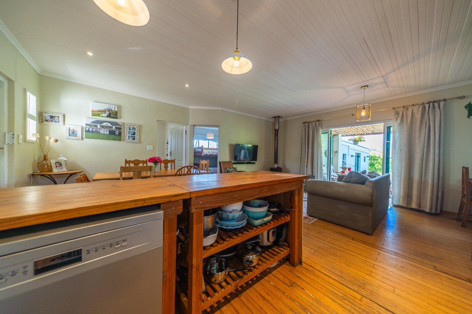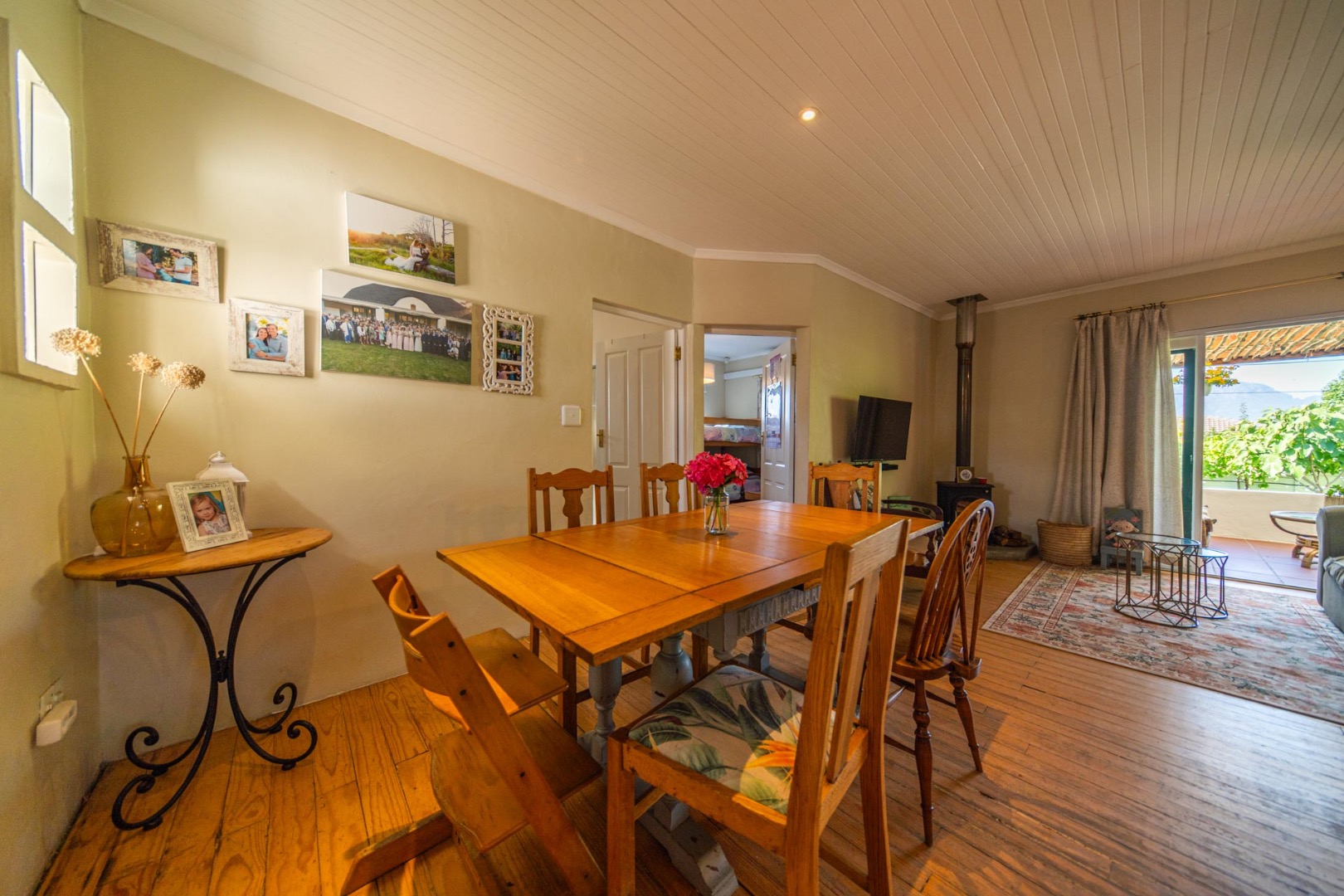 Open-plan kitchen and living room with airconditioner and fireplace leading onto a covered stoep overlooking the tranquil back garden
