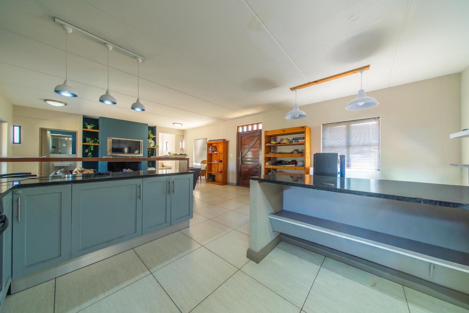 The open-plan living area features a cozy fireplace, flowing effortlessly to the dedicated braai area and large garden — perfect for entertaining or enjoying outdoor living. The kitchen connects seamlessly to the living space, making it ideal for busy family life or hosting guests.