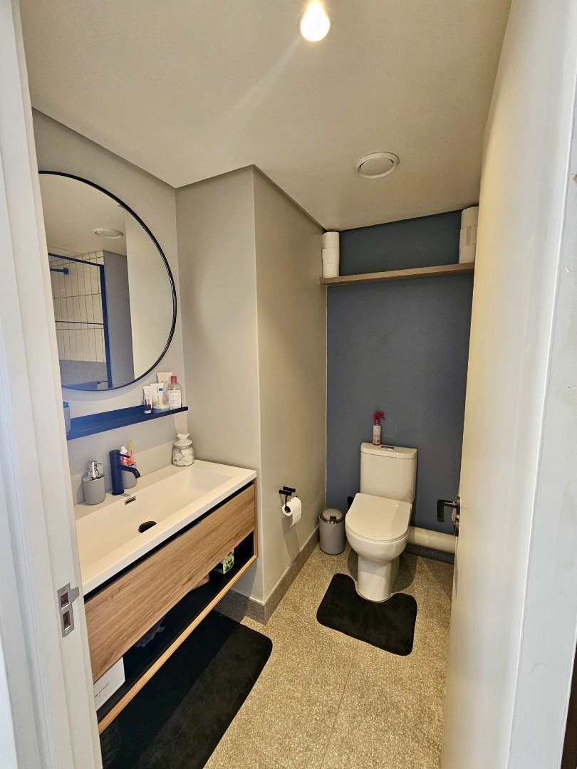 Step inside this thoughtfully designed apartment, where modern aesthetics meet functional living. The open-plan layout seamlessly integrates a sleek kitchen, boasting dark grey cabinetry and integrated appliances including an oven and fridge.