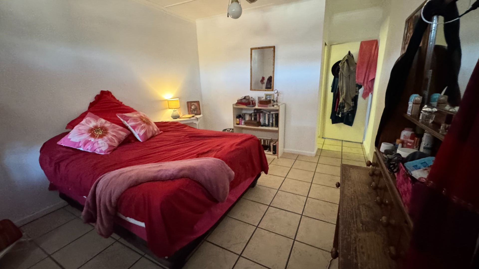 The bedroom is not only spacious but also offers a walk-in closet with lots of packing space.