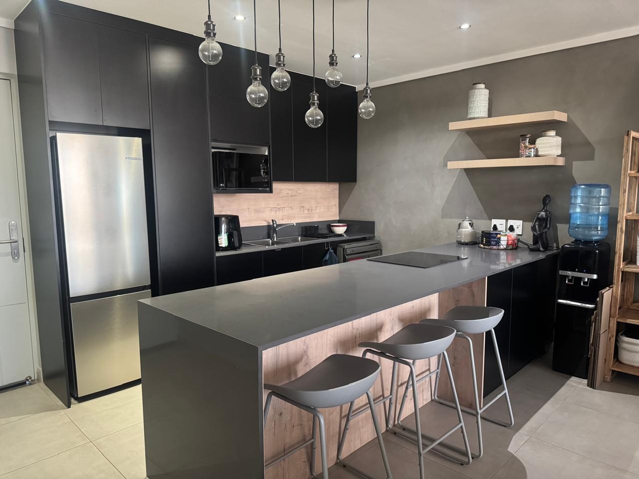 Open plan kitchen with induction stove and oven, built in microwave and incinerator underneath the sink