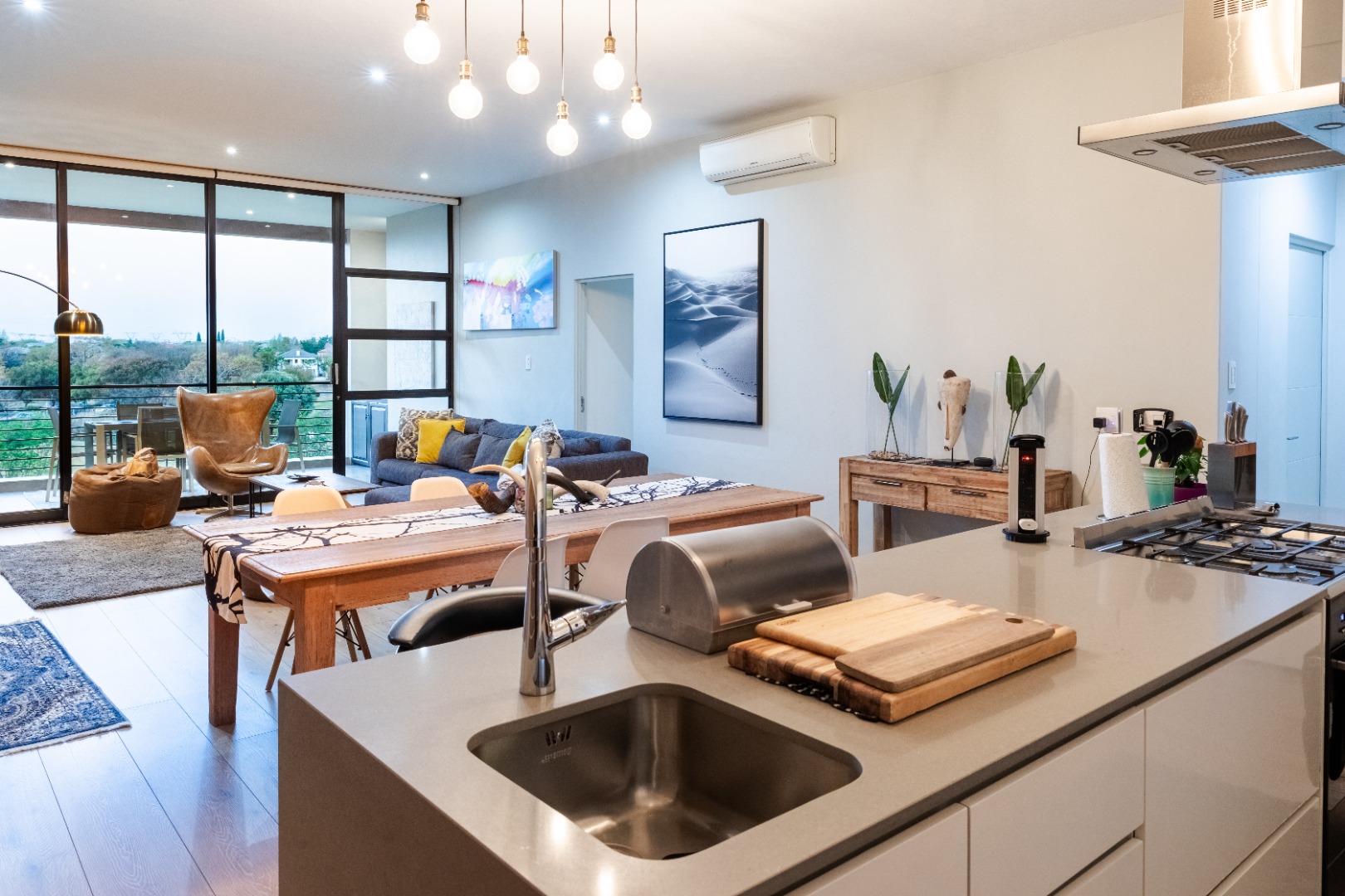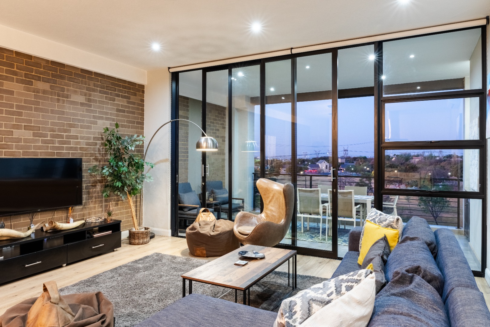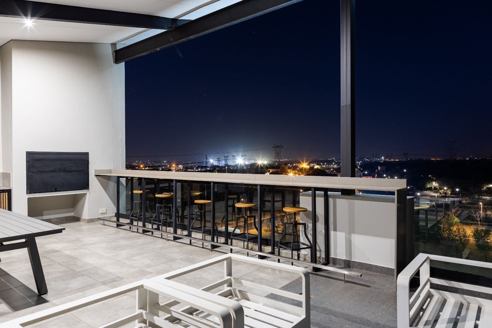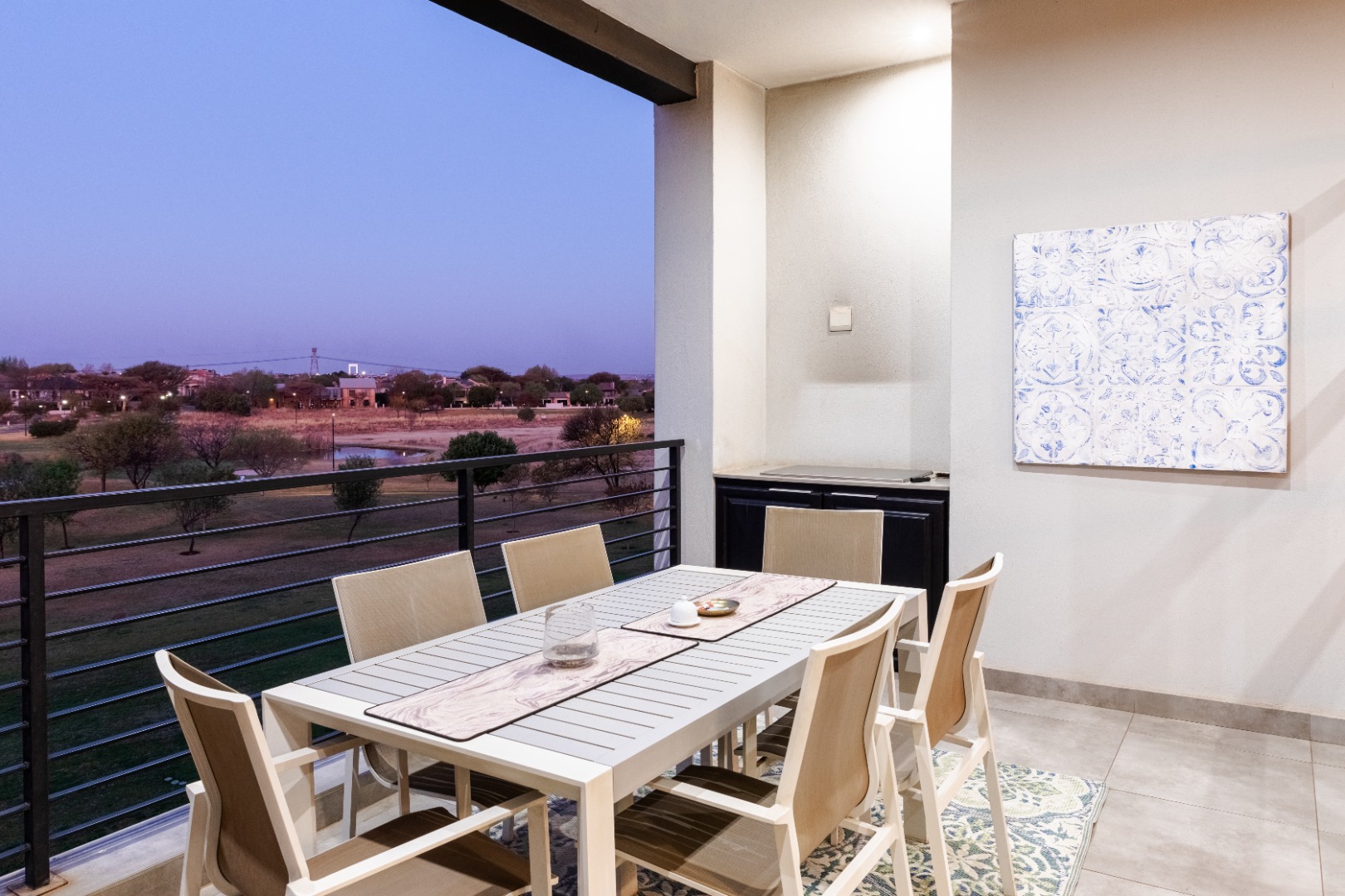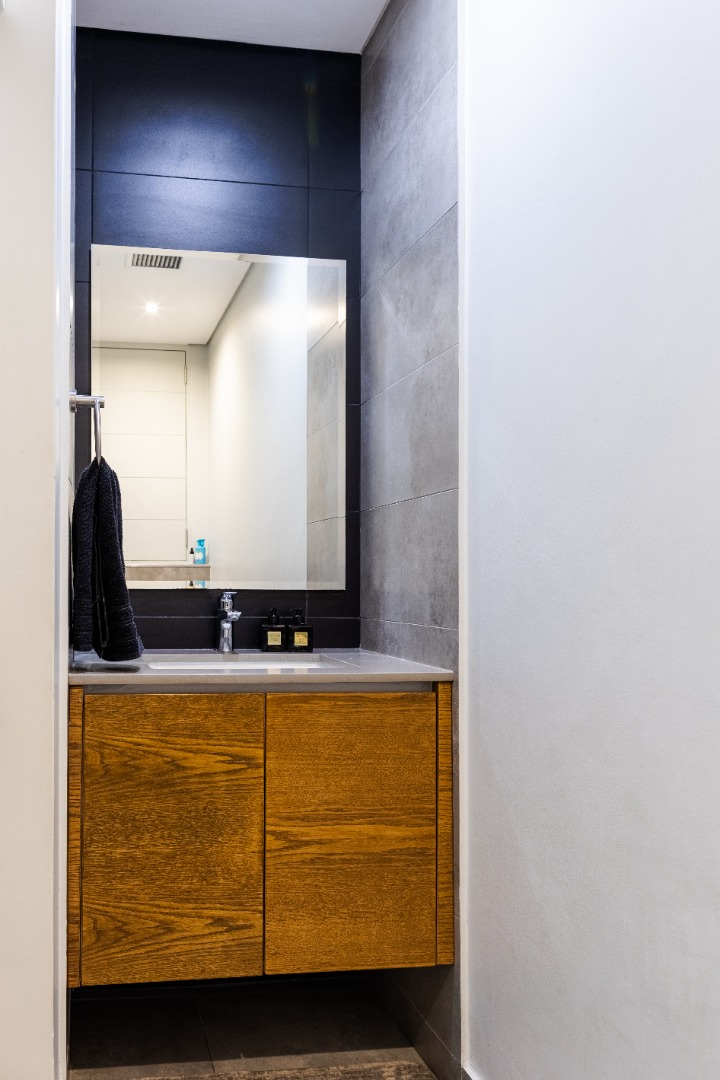 Situated within the esteemed Ascend to Midstream estate in Centurion, this residence offers an unparalleled lifestyle. The area is renowned for its secure, community-focused environment, providing access to premium amenities including golf and fishing facilities. This sophisticated 144 sqm apartment presents an exceptional rental opportunity for discerning individuals seeking modern comfort and convenience. The interior boasts an expansive open-plan design, seamlessly integrating the lounge, dining area, and a contemporary kitchen. The kitchen is a focal point, featuring sleek white cabinetry, a generous central island with breakfast bar seating, and high-end stainless steel appliances. A stylish teal subway tile backsplash and warm wood flooring enhance the aesthetic, complemented by a practical pantry. Large sliding glass doors invite abundant natural light and provide access to the outdoor living spaces. Accommodation comprises two well-appointed bedrooms, each benefiting from an en-suite bathroom, ensuring privacy and comfort. The bedrooms are designed with modern aesthetics, featuring hardwood flooring, air conditioning, and large windows, some offering panoramic views of the surrounding landscape. Blackout roller blinds are installed for optimal light control and privacy, creating serene retreats. Further enhancing the lifestyle is a spacious private balcony, ideal for outdoor entertaining, complete with a built-in braai and ample space for dining while enjoying scenic views. Residents of this security estate benefit from 24-hour security, access gates, and a security post. The estate also provides exclusive access to a gymnasium, swimming pool, and a clubhouse, fostering a vibrant community atmosphere. Key Features: * Two Bedrooms, Two En-suite Bathrooms * Modern Open-Plan Living Area * Contemporary Kitchen with Island and Pantry * Private Balcony with Built-in Braai * Air Conditioning Throughout * Two Garages * Fibre Connectivity * Access to Estate Gym, Pool, and Clubhouse * 24-Hour Security Estate