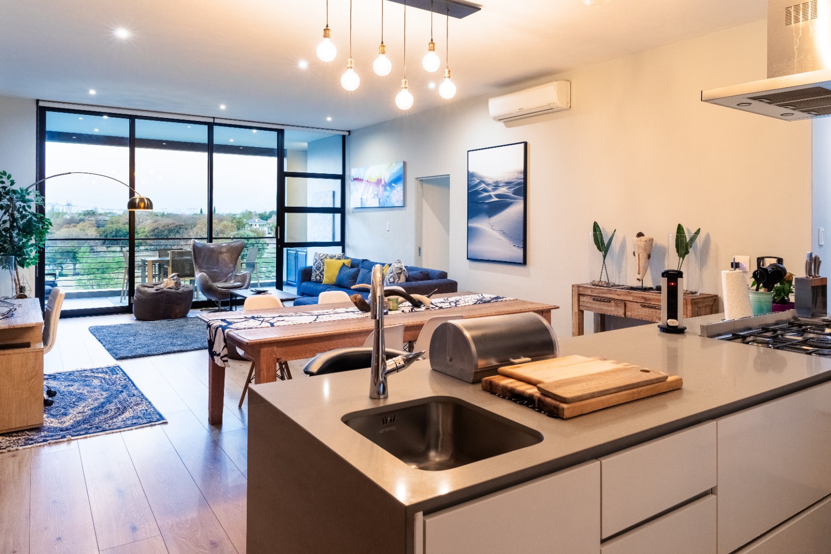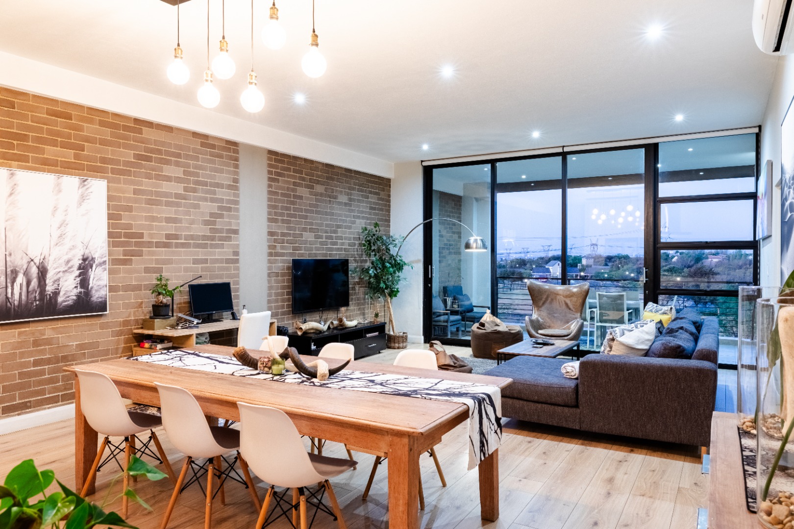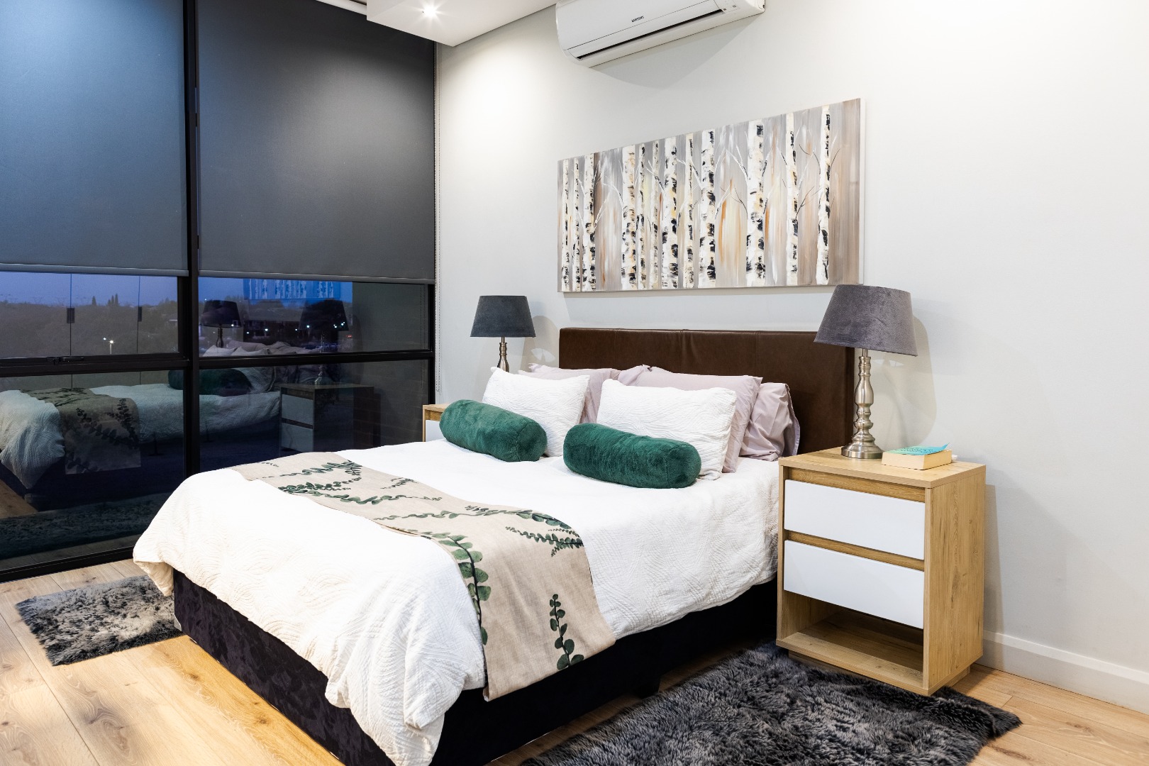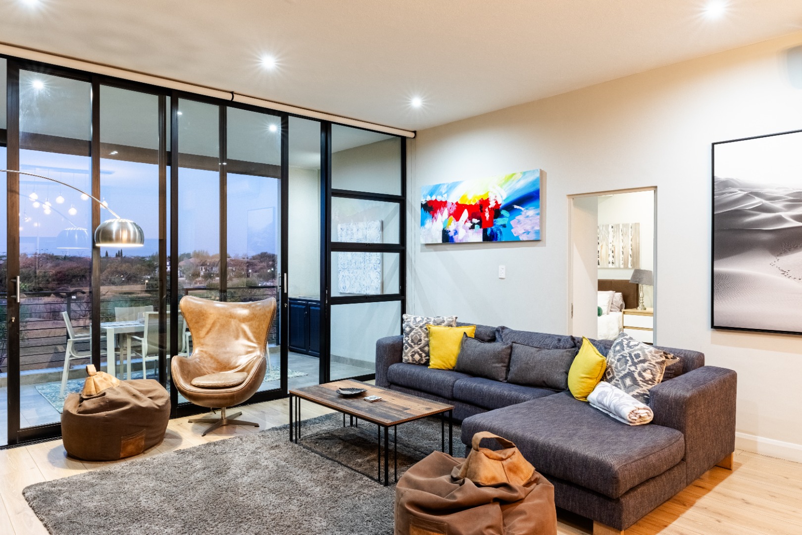 Situated within the esteemed Ascend to Midstream estate in Centurion, this residence offers an unparalleled lifestyle. The area is renowned for its secure, community-focused environment, providing access to premium amenities including golf and fishing facilities. This sophisticated 144 sqm apartment presents an exceptional rental opportunity for discerning individuals seeking modern comfort and convenience. The interior boasts an expansive open-plan design, seamlessly integrating the lounge, dining area, and a contemporary kitchen. The kitchen is a focal point, featuring sleek white cabinetry, a generous central island with breakfast bar seating, and high-end stainless steel appliances. A stylish teal subway tile backsplash and warm wood flooring enhance the aesthetic, complemented by a practical pantry. Large sliding glass doors invite abundant natural light and provide access to the outdoor living spaces. Accommodation comprises two well-appointed bedrooms, each benefiting from an en-suite bathroom, ensuring privacy and comfort. The bedrooms are designed with modern aesthetics, featuring hardwood flooring, air conditioning, and large windows, some offering panoramic views of the surrounding landscape. Blackout roller blinds are installed for optimal light control and privacy, creating serene retreats. Further enhancing the lifestyle is a spacious private balcony, ideal for outdoor entertaining, complete with a built-in braai and ample space for dining while enjoying scenic views. Residents of this security estate benefit from 24-hour security, access gates, and a security post. The estate also provides exclusive access to a gymnasium, swimming pool, and a clubhouse, fostering a vibrant community atmosphere. Key Features: * Two Bedrooms, Two En-suite Bathrooms * Modern Open-Plan Living Area * Contemporary Kitchen with Island and Pantry * Private Balcony with Built-in Braai * Air Conditioning Throughout * Two Garages * Fibre Connectivity * Access to Estate Gym, Pool, and Clubhouse * 24-Hour Security Estate