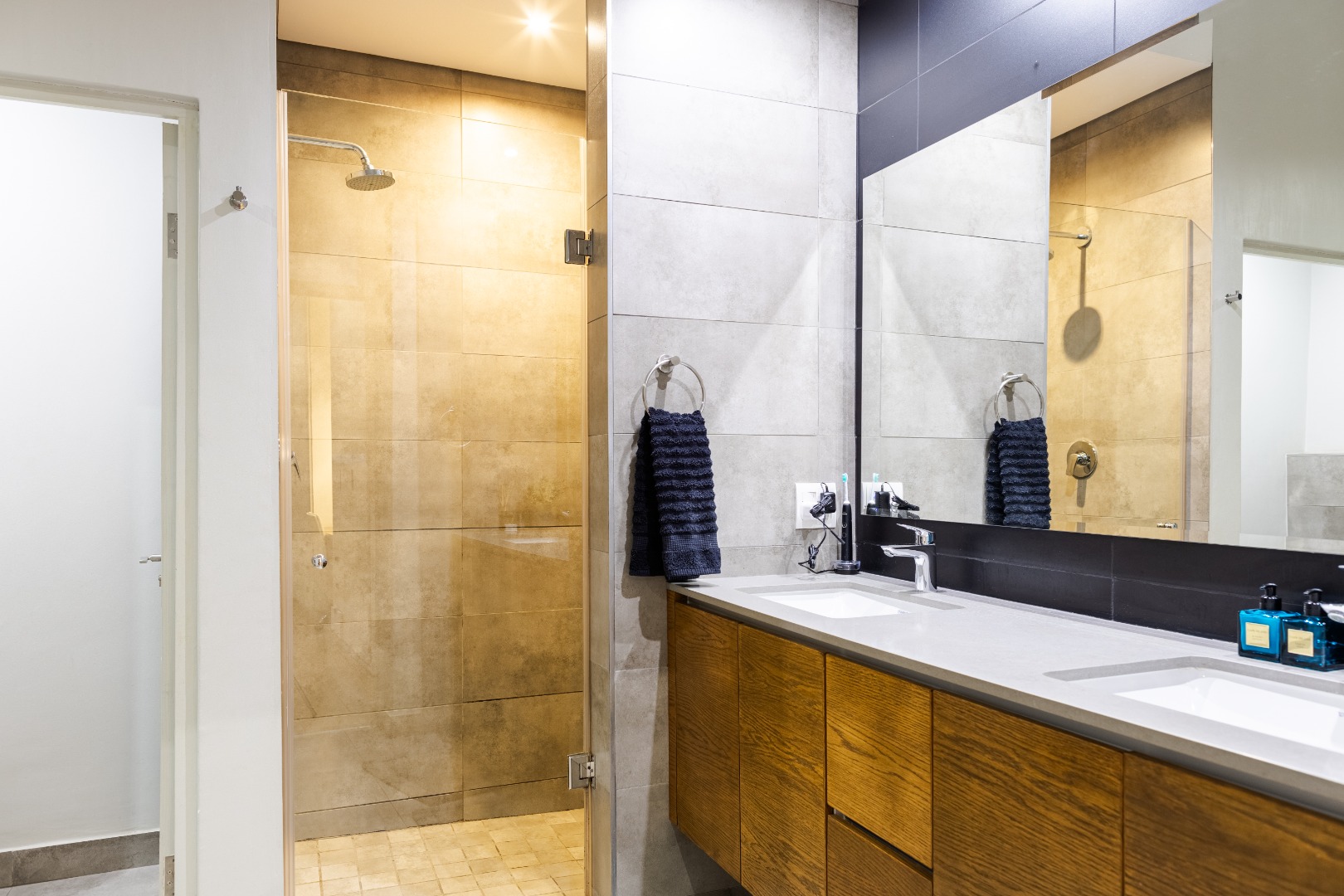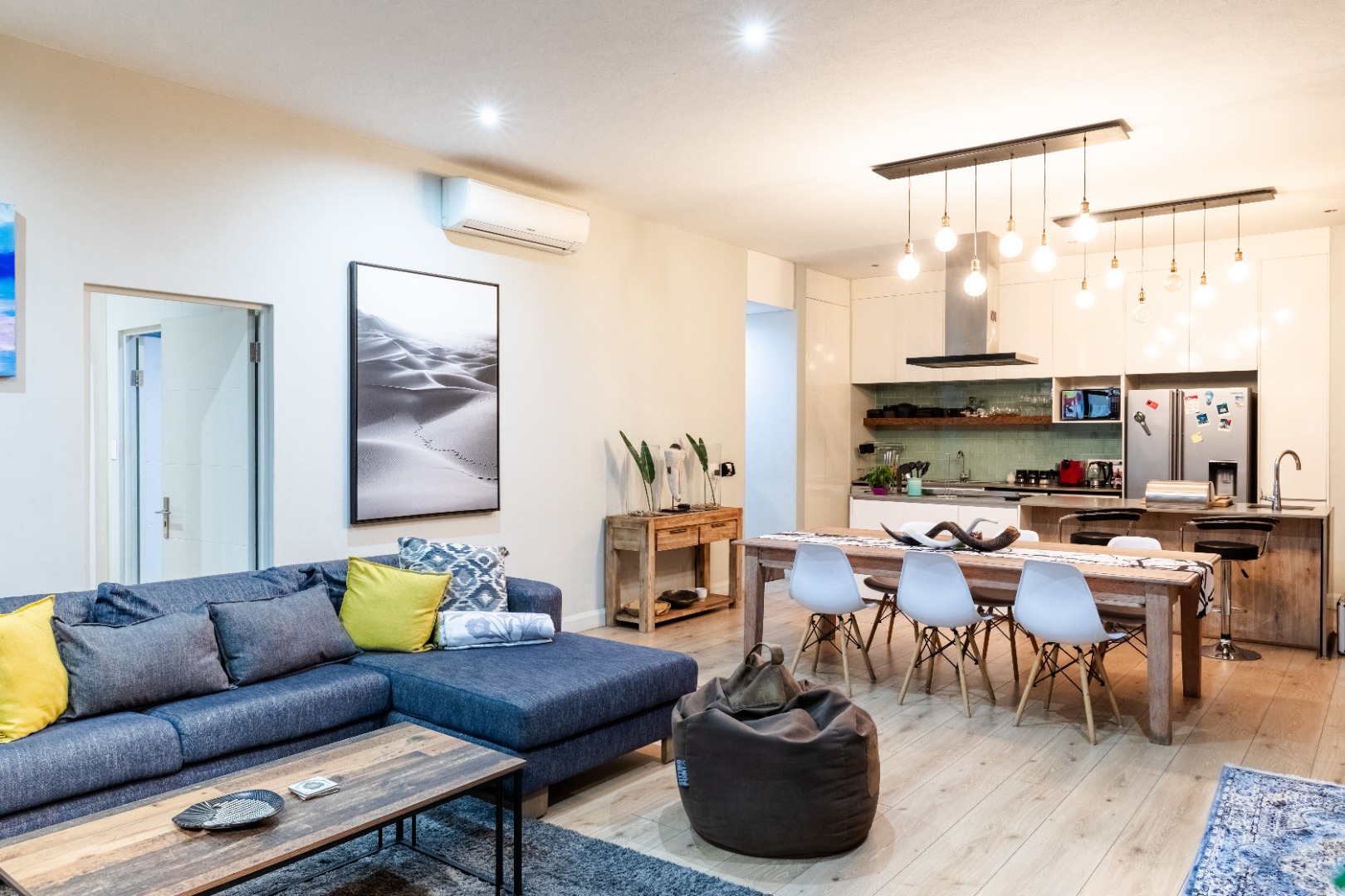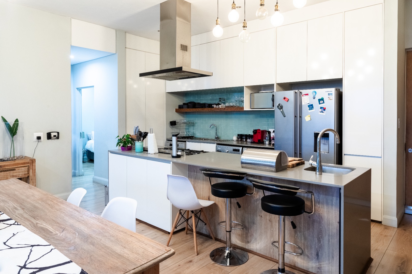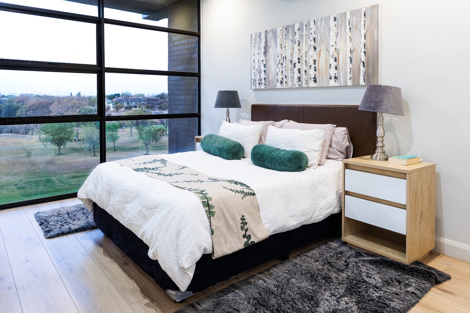 Situated within the esteemed Ascend to Midstream estate in Centurion, this residence offers an unparalleled lifestyle. The area is renowned for its secure, community-focused environment, providing access to premium amenities including golf and fishing facilities. This sophisticated 144 sqm apartment presents an exceptional rental opportunity for discerning individuals seeking modern comfort and convenience. The interior boasts an expansive open-plan design, seamlessly integrating the lounge, dining area, and a contemporary kitchen. The kitchen is a focal point, featuring sleek white cabinetry, a generous central island with breakfast bar seating, and high-end stainless steel appliances. A stylish teal subway tile backsplash and warm wood flooring enhance the aesthetic, complemented by a practical pantry. Large sliding glass doors invite abundant natural light and provide access to the outdoor living spaces. Accommodation comprises two well-appointed bedrooms, each benefiting from an en-suite bathroom, ensuring privacy and comfort. The bedrooms are designed with modern aesthetics, featuring hardwood flooring, air conditioning, and large windows, some offering panoramic views of the surrounding landscape. Blackout roller blinds are installed for optimal light control and privacy, creating serene retreats. Further enhancing the lifestyle is a spacious private balcony, ideal for outdoor entertaining, complete with a built-in braai and ample space for dining while enjoying scenic views. Residents of this security estate benefit from 24-hour security, access gates, and a security post. The estate also provides exclusive access to a gymnasium, swimming pool, and a clubhouse, fostering a vibrant community atmosphere. Key Features: * Two Bedrooms, Two En-suite Bathrooms * Modern Open-Plan Living Area * Contemporary Kitchen with Island and Pantry * Private Balcony with Built-in Braai * Air Conditioning Throughout * Two Garages * Fibre Connectivity * Access to Estate Gym, Pool, and Clubhouse * 24-Hour Security Estate