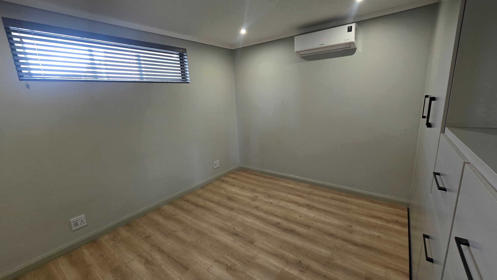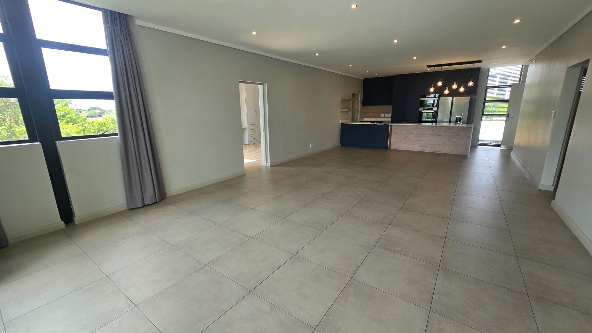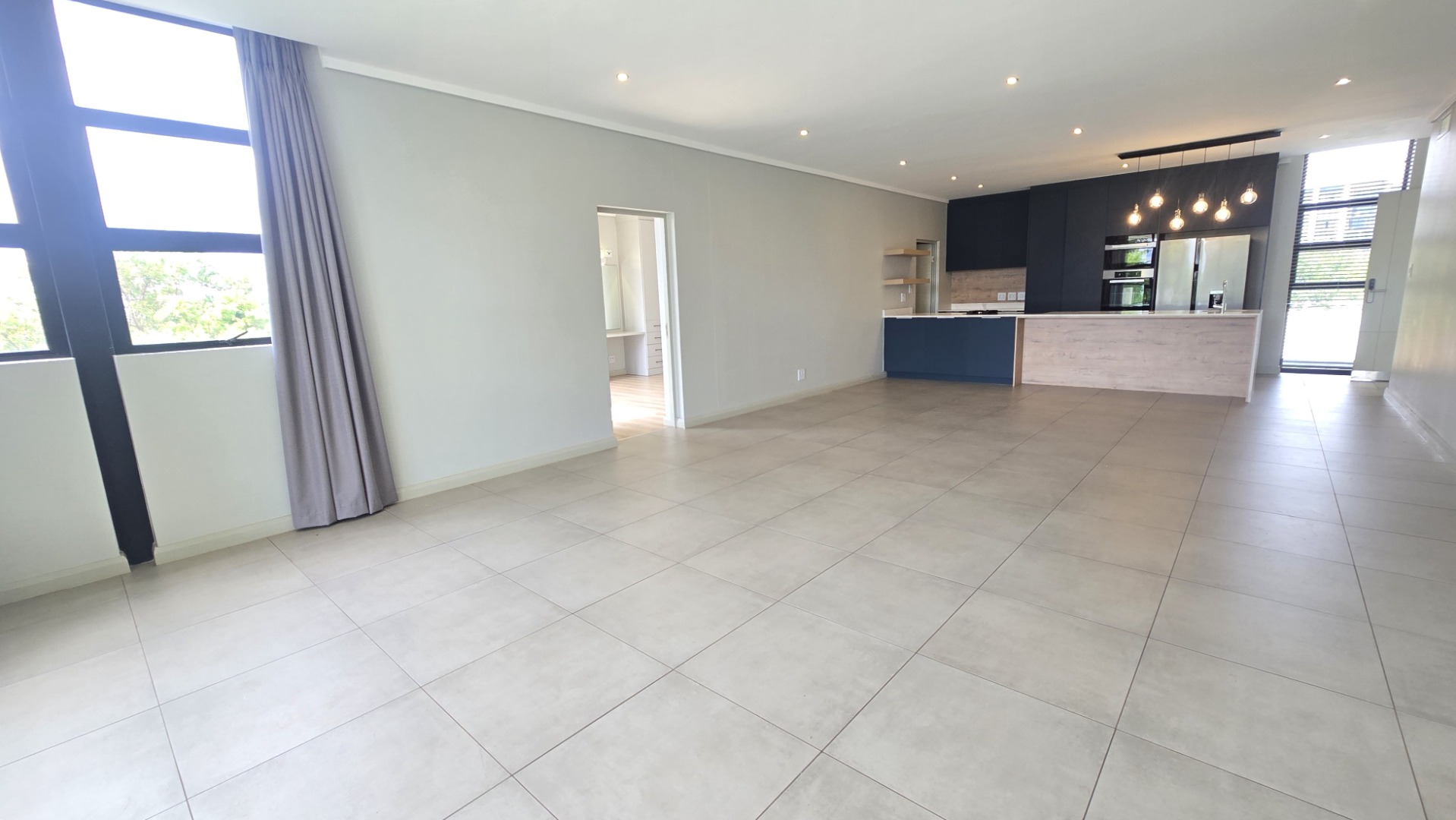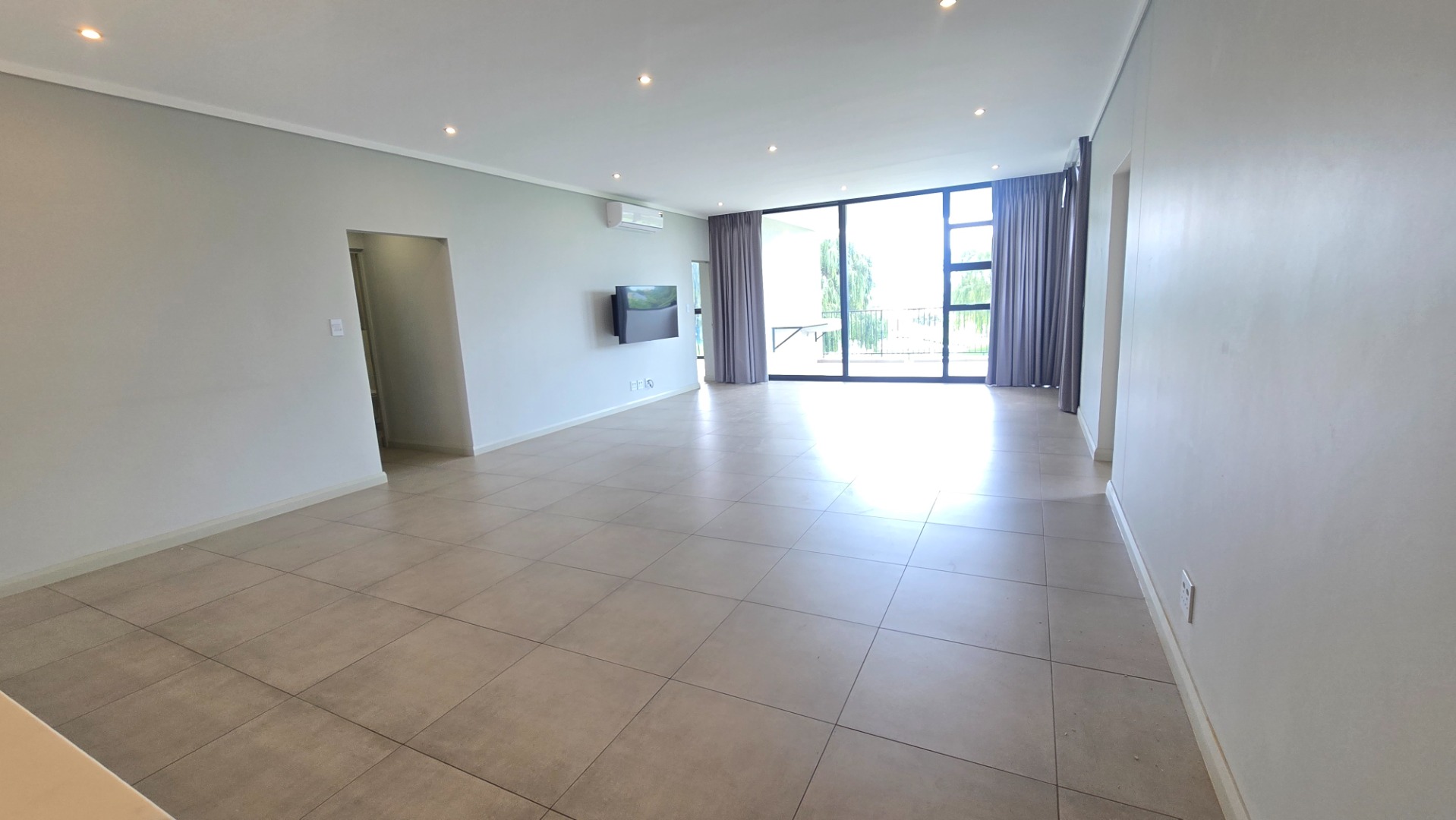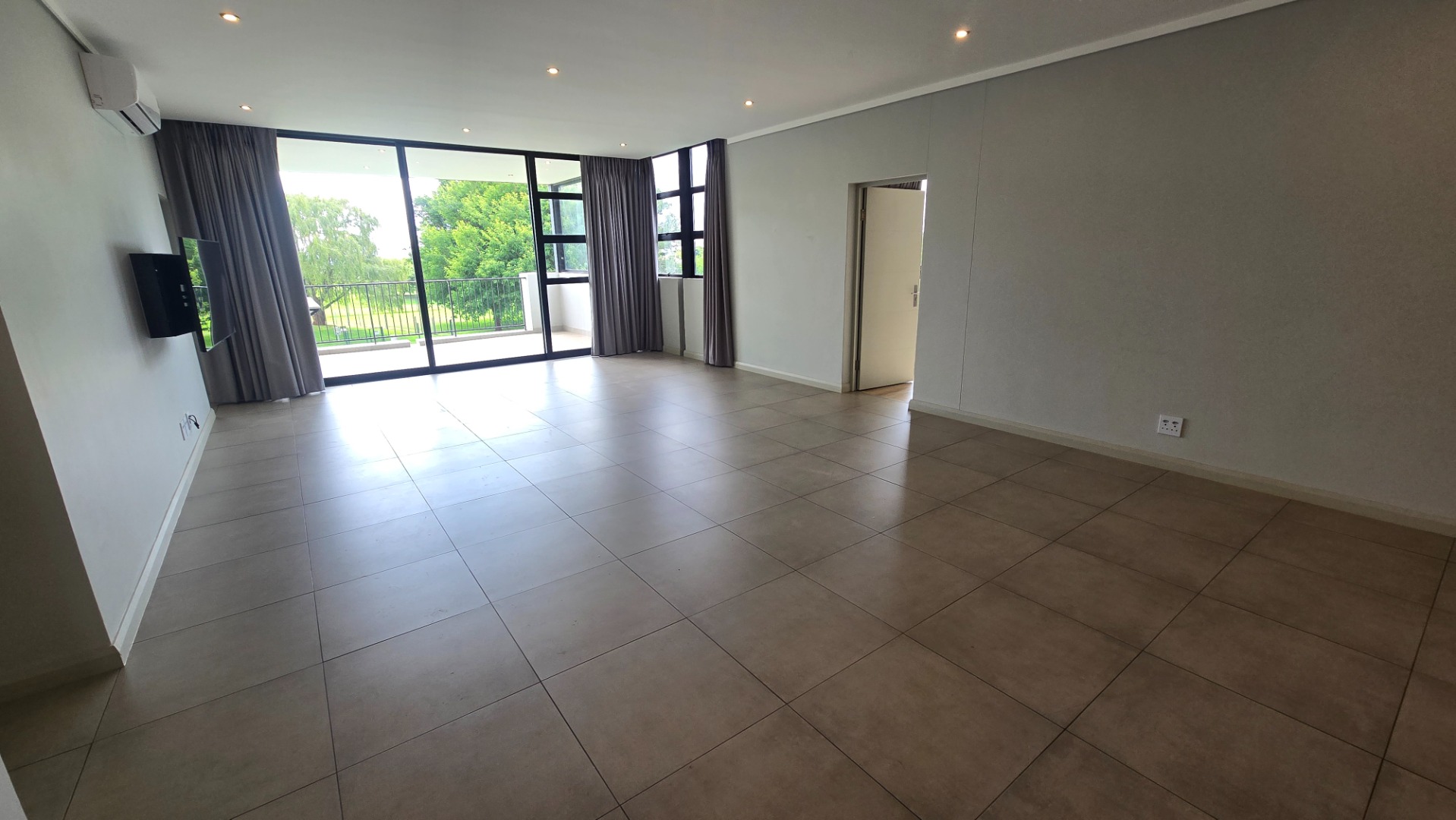 * Open plan living and dining space with an aircon and curtains