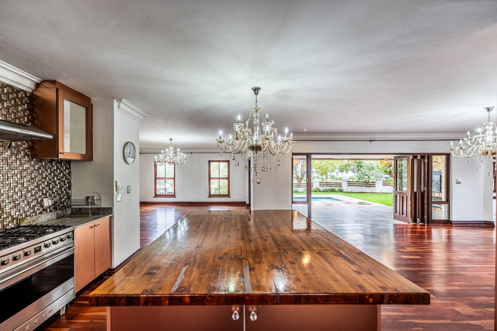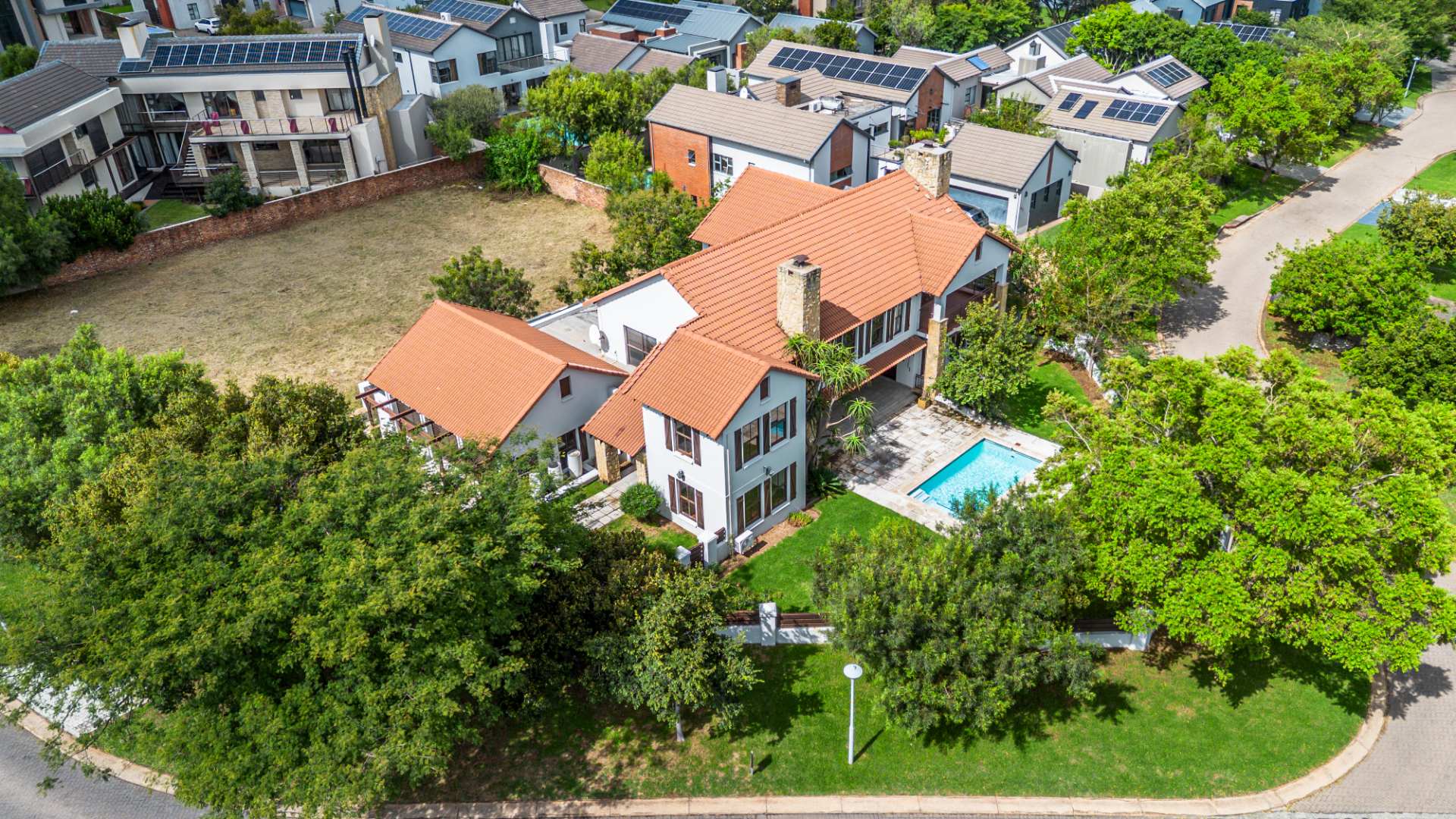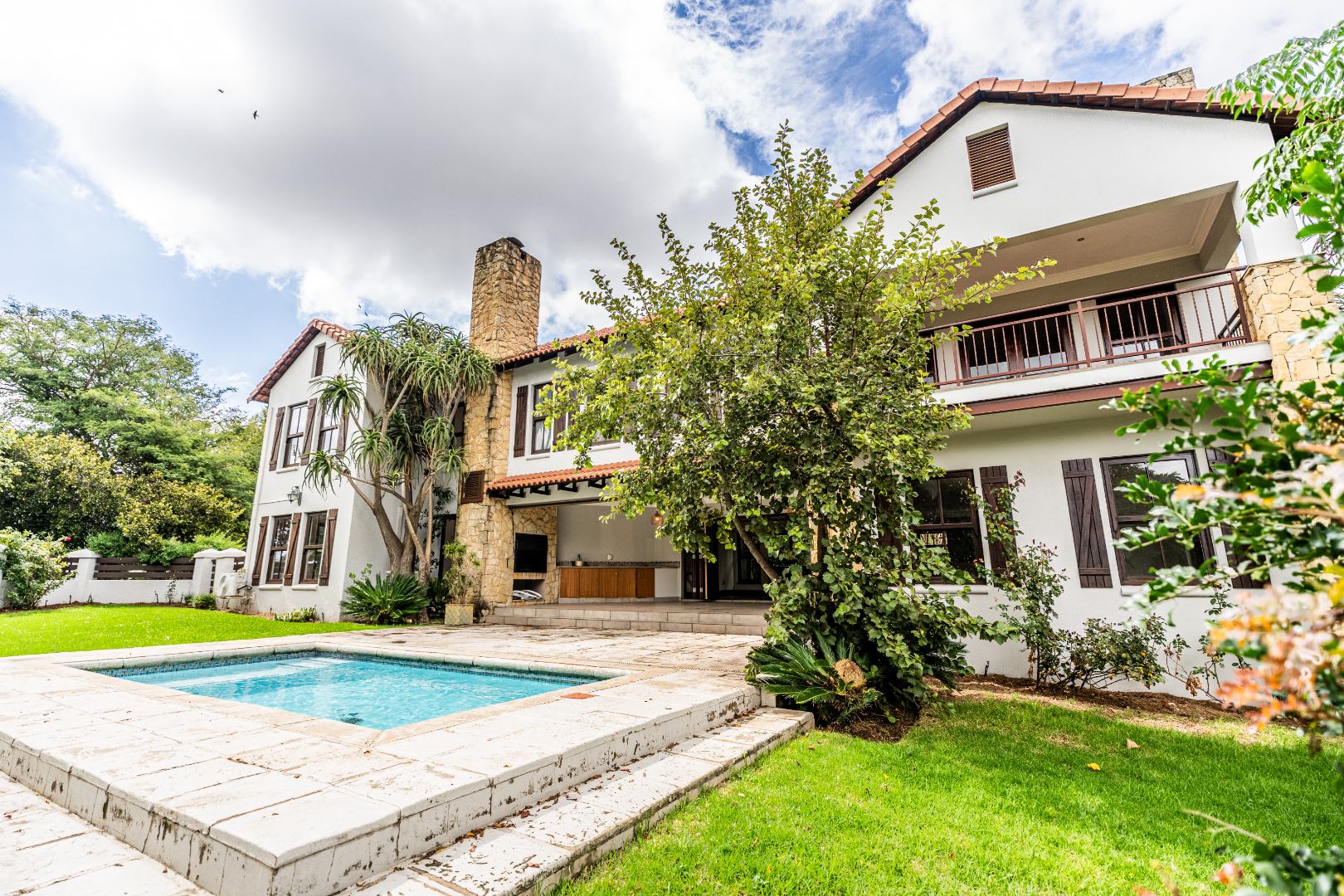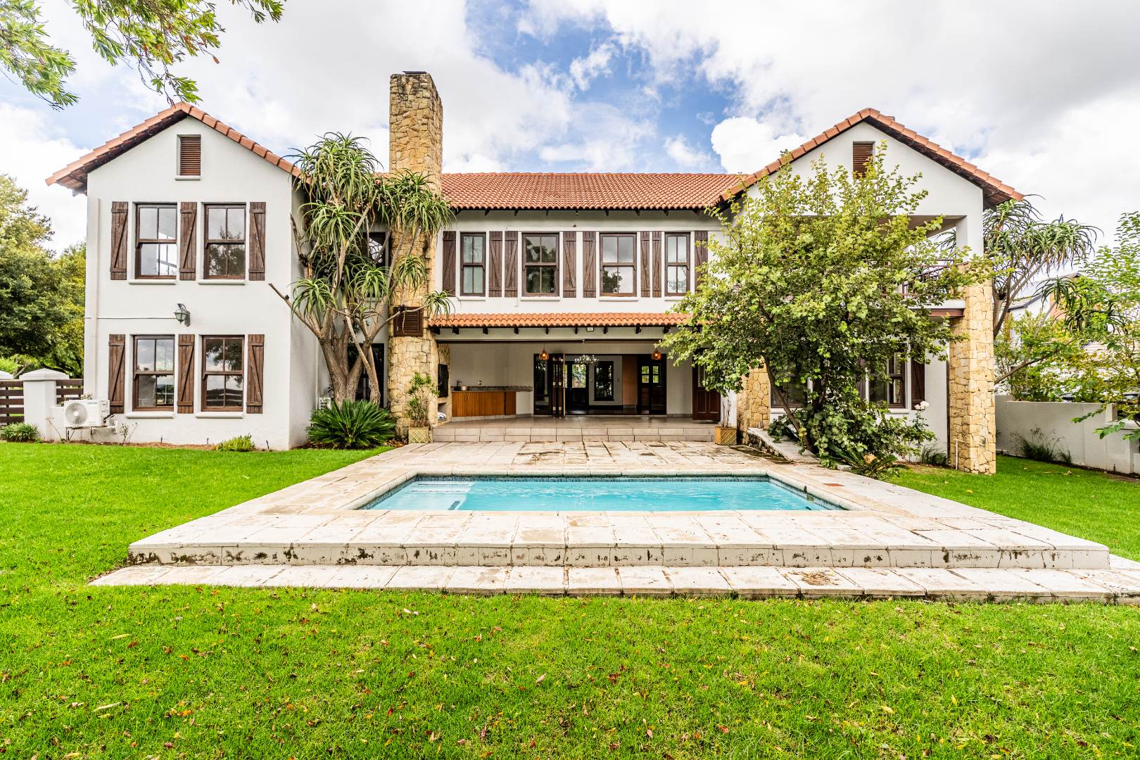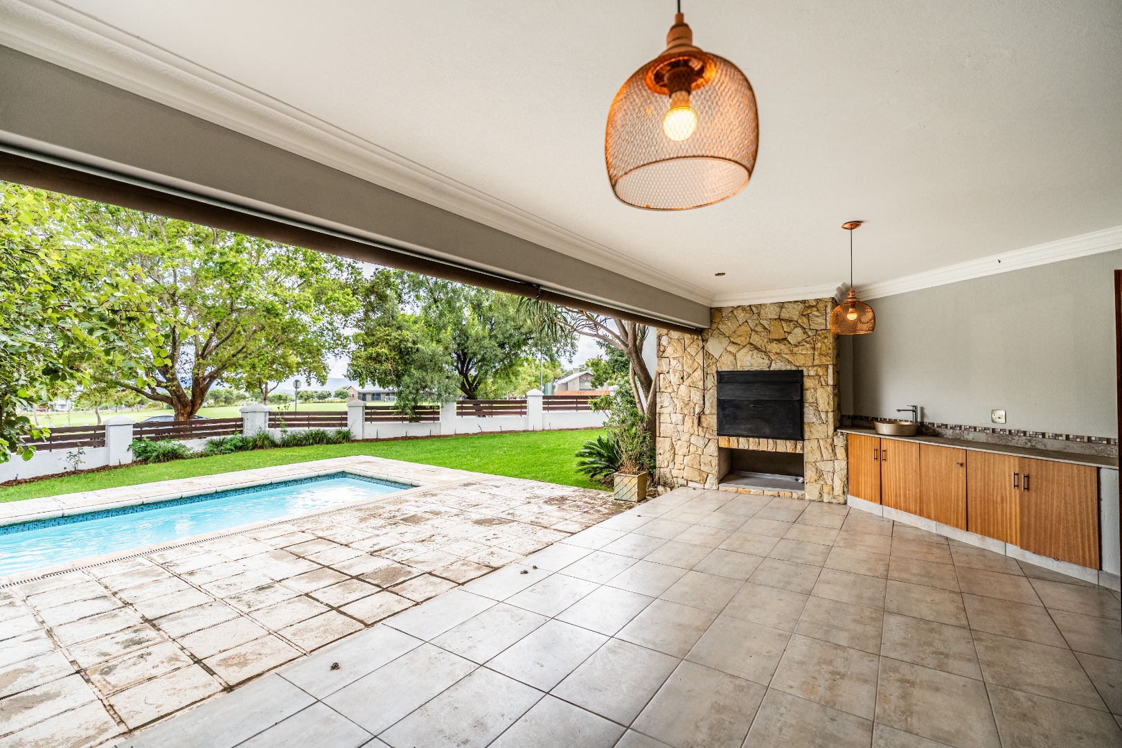 Situated on a prominent corner stand, the home immediately impresses with its rare combination of space and prime positioning within the estate. The open-plan living area is spacious and inviting, anchored by a fireplace and complemented by air-conditioning to ensure comfort throughout all seasons. Beautiful stacking doors open onto a large covered patio where a well-designed braai area overlooks the sparkling swimming pool and garden, creating a seamless transition between indoor and outdoor living that is ideal for entertaining or relaxed family moments.