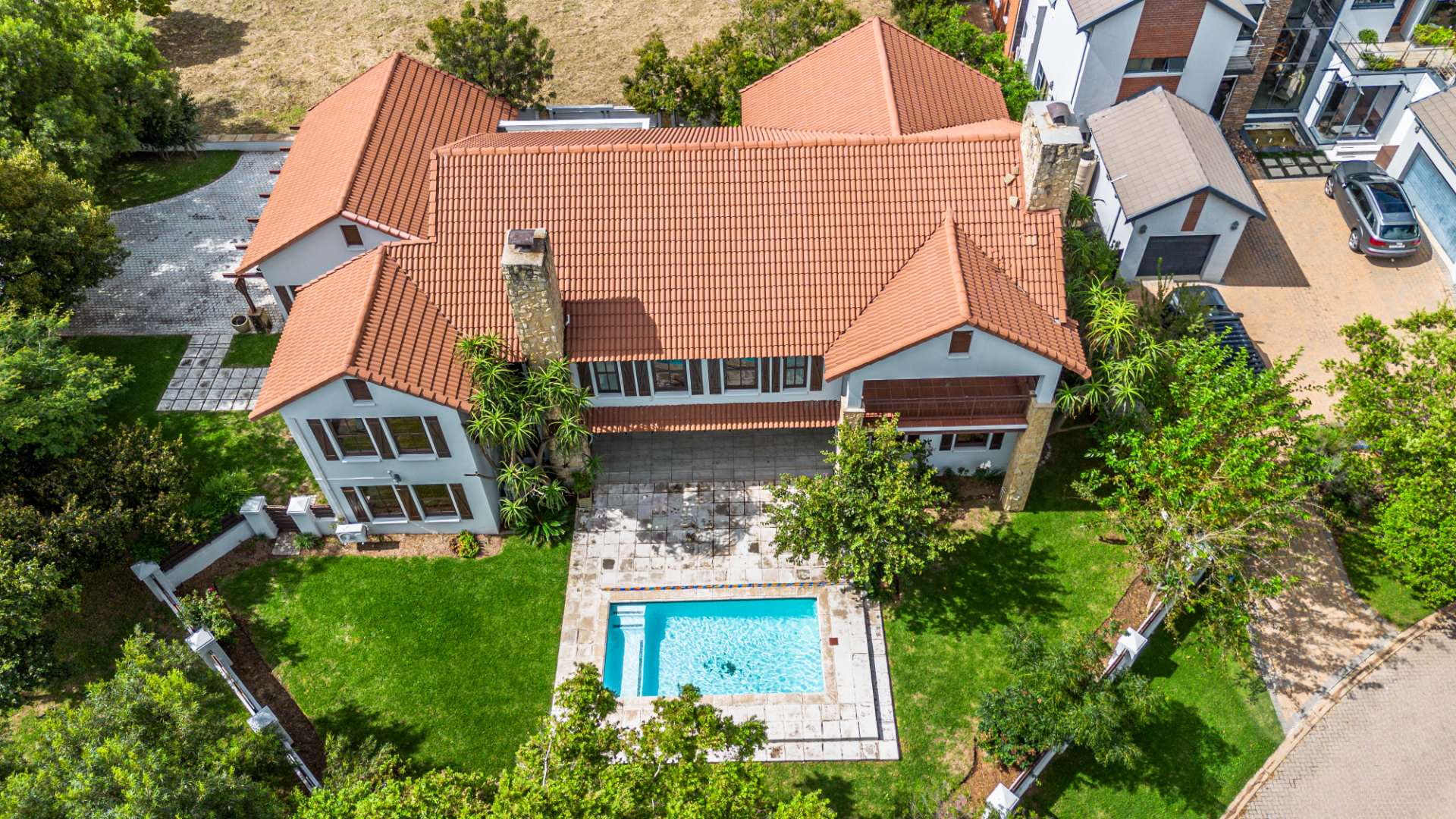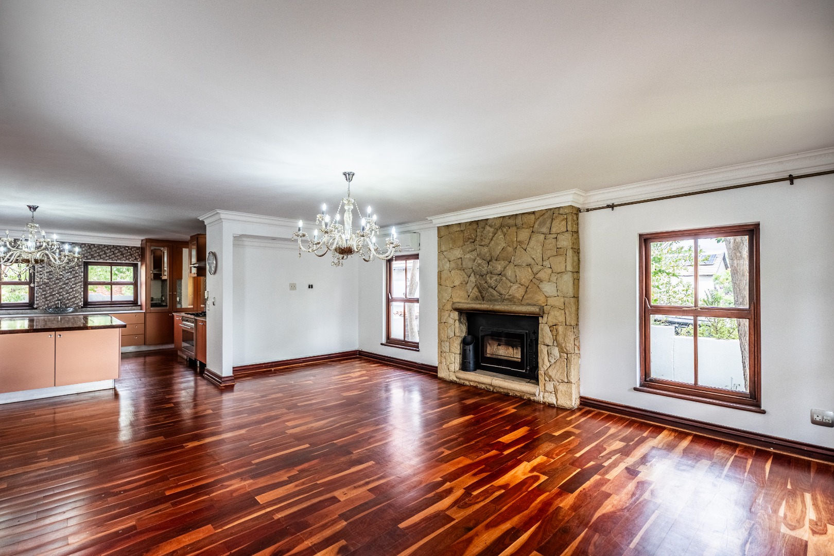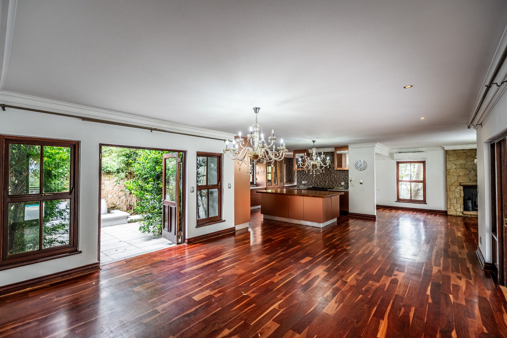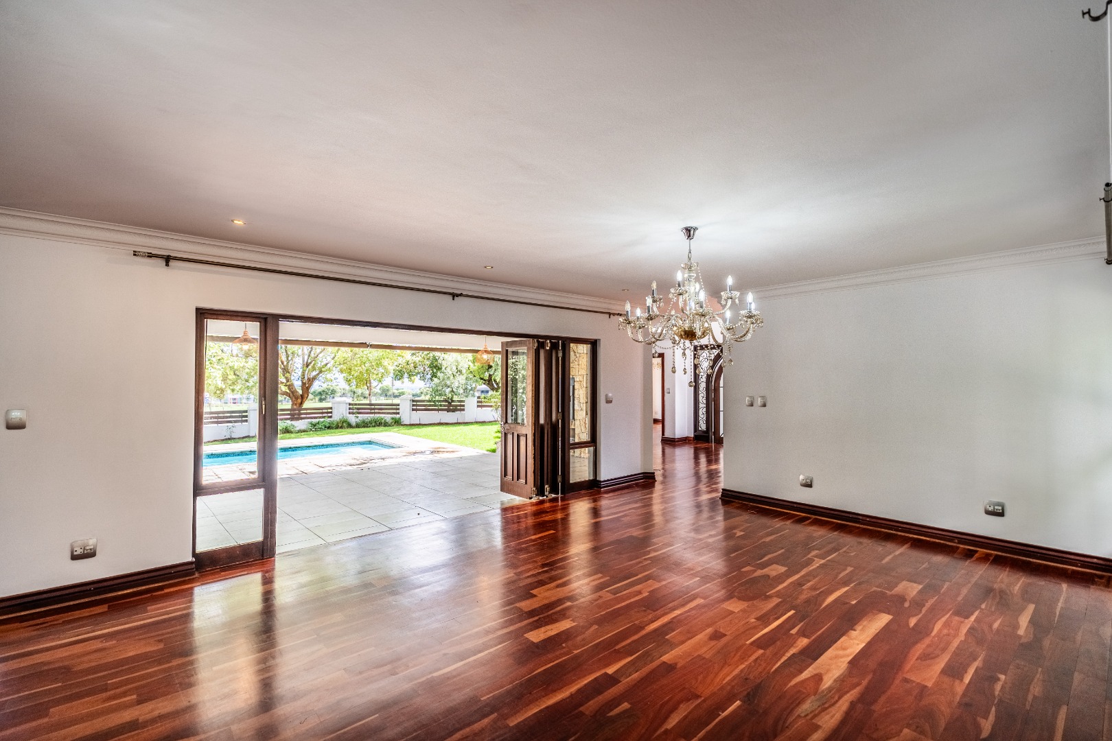 Situated on a prominent corner stand, the home immediately impresses with its rare combination of space and prime positioning within the estate. The open-plan living area is spacious and inviting, anchored by a fireplace and complemented by air-conditioning to ensure comfort throughout all seasons. Beautiful stacking doors open onto a large covered patio where a well-designed braai area overlooks the sparkling swimming pool and garden, creating a seamless transition between indoor and outdoor living that is ideal for entertaining or relaxed family moments.