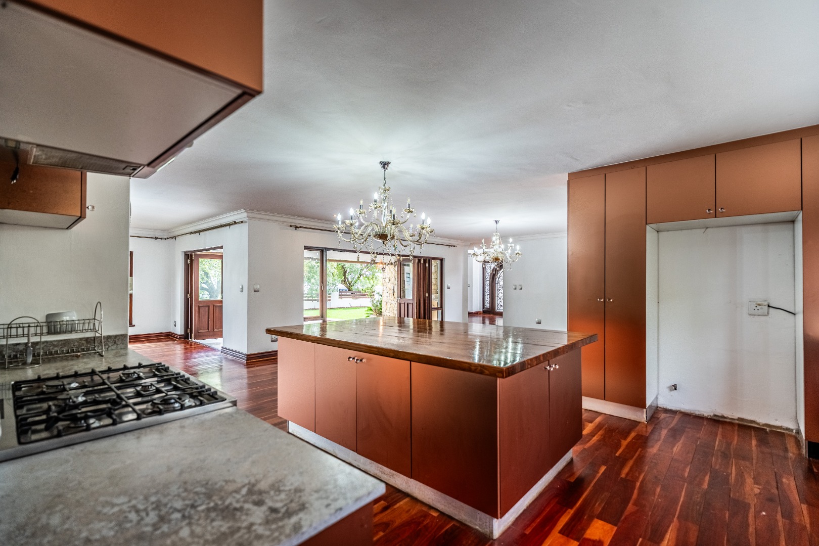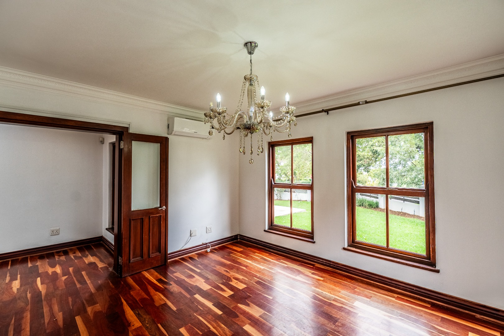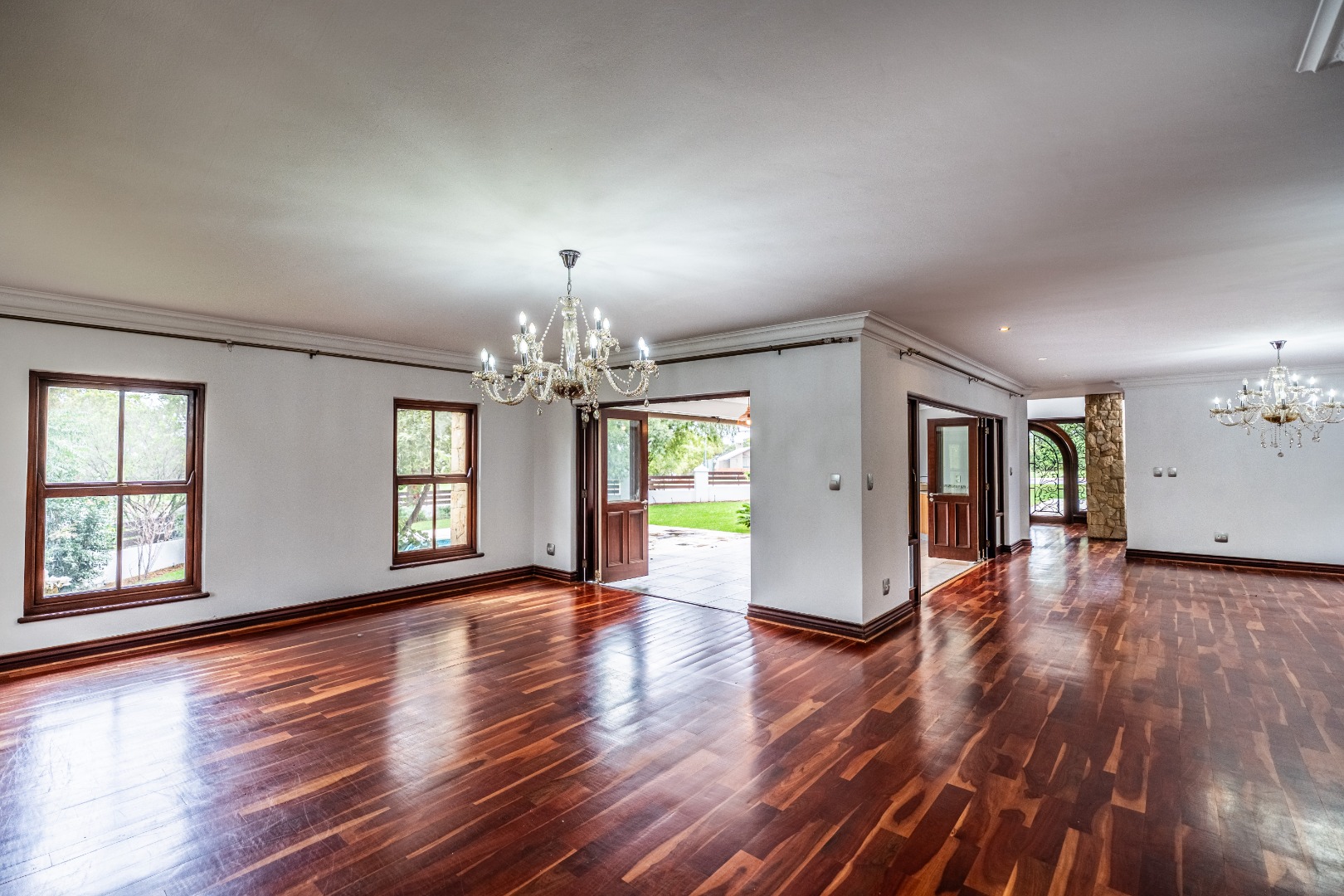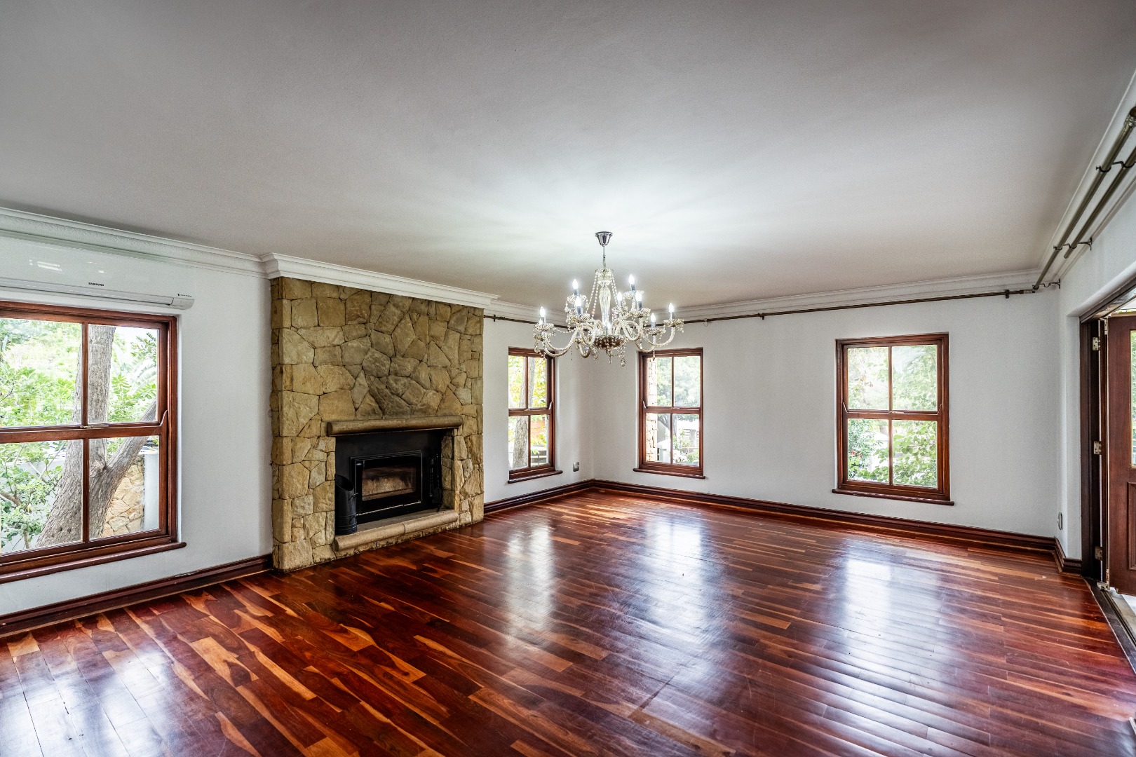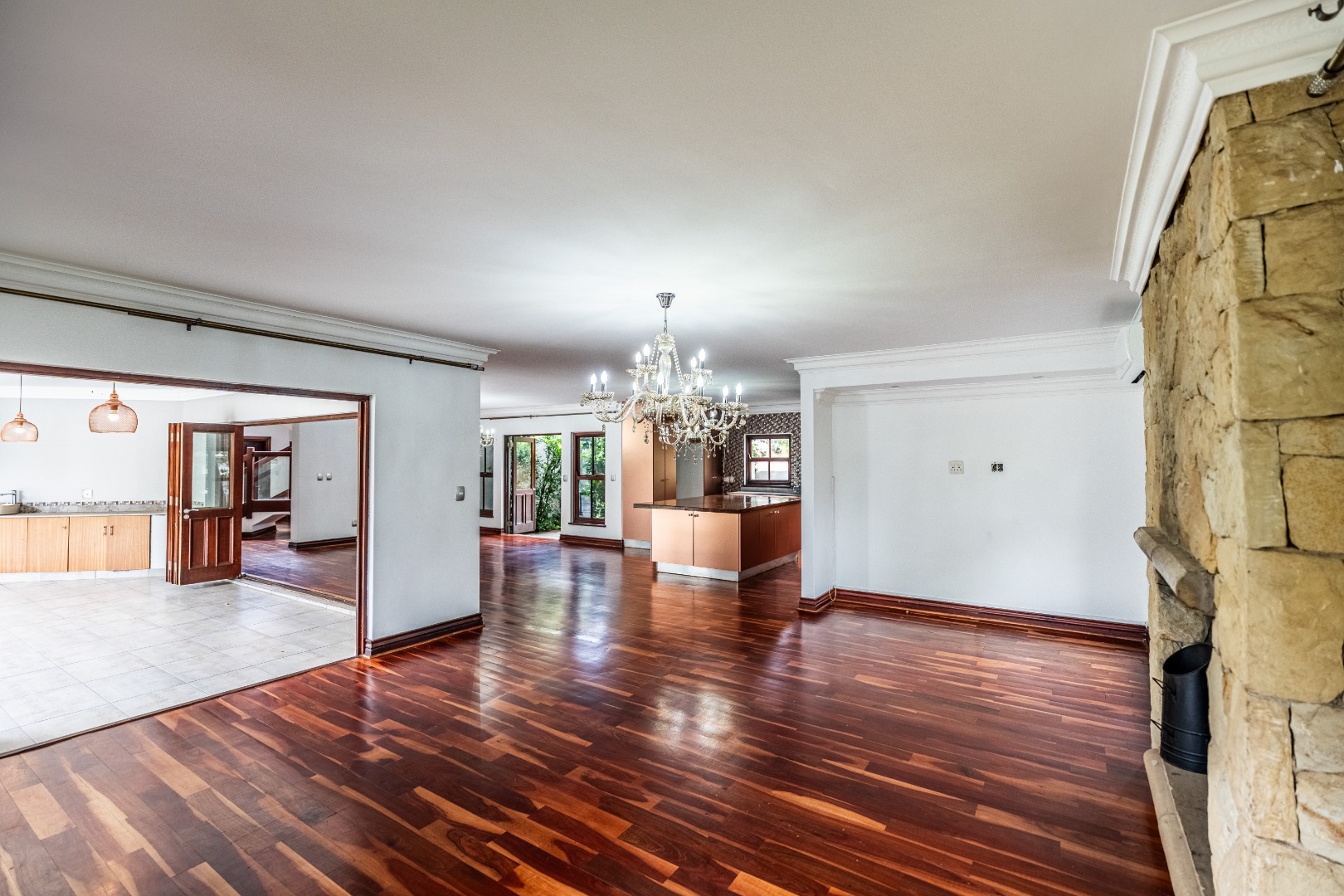 Situated on a prominent corner stand, the home immediately impresses with its rare combination of space and prime positioning within the estate. The open-plan living area is spacious and inviting, anchored by a fireplace and complemented by air-conditioning to ensure comfort throughout all seasons. Beautiful stacking doors open onto a large covered patio where a well-designed braai area overlooks the sparkling swimming pool and garden, creating a seamless transition between indoor and outdoor living that is ideal for entertaining or relaxed family moments.