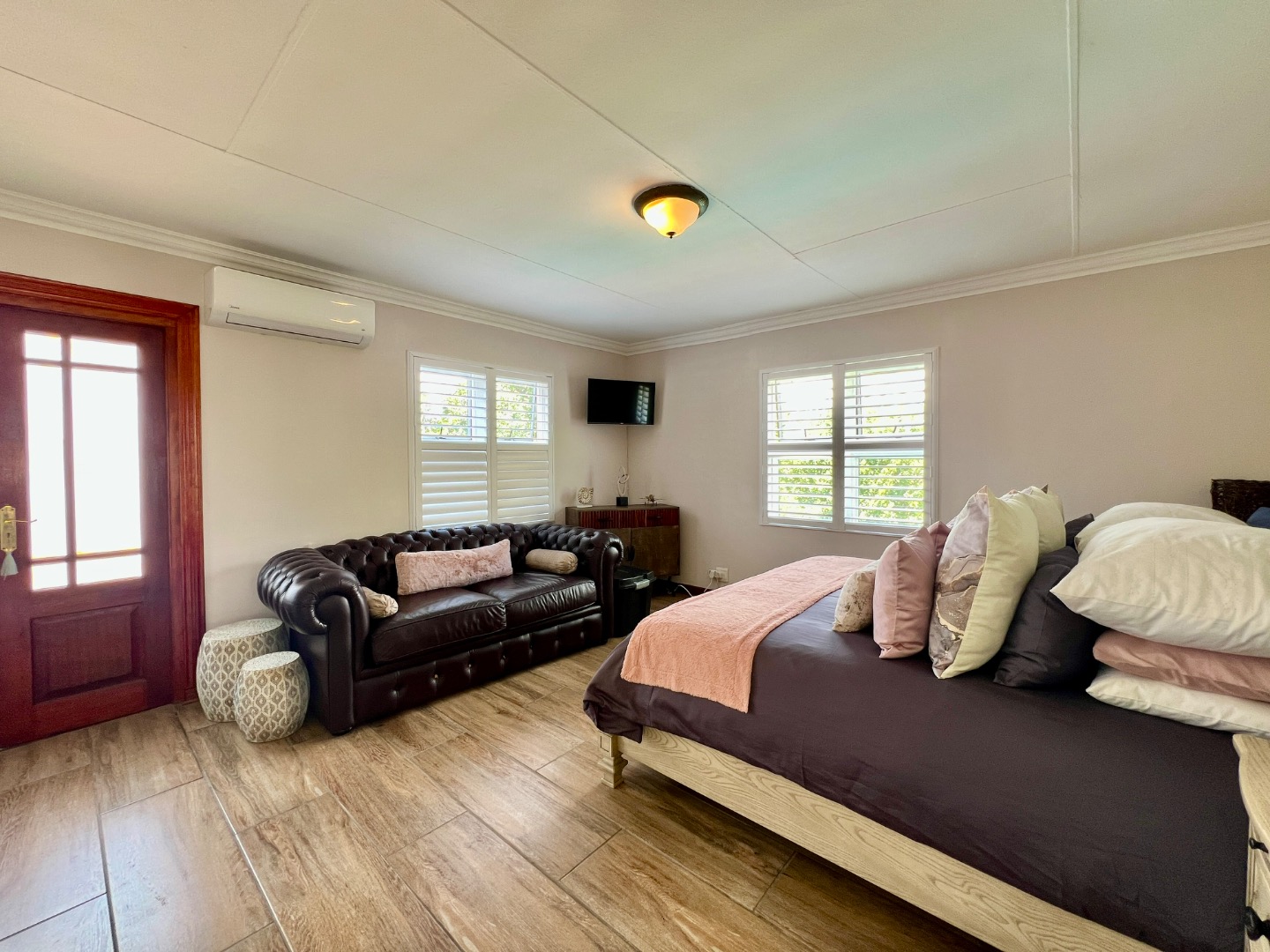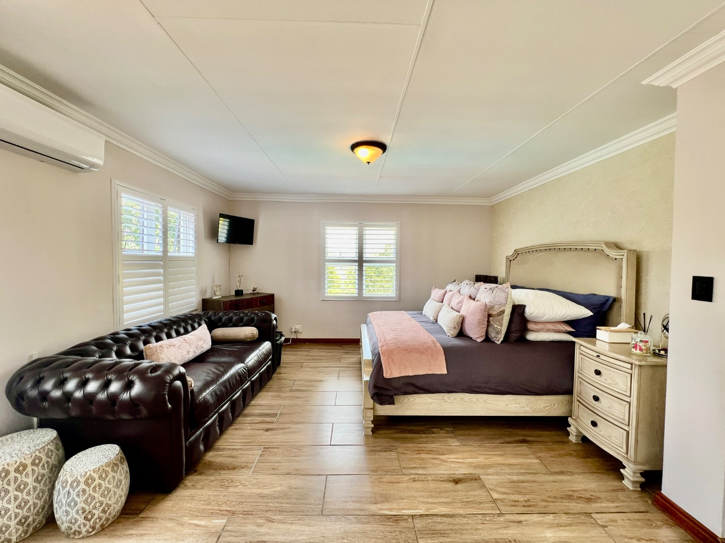 • Guest Suite (Downstairs): Conveniently located with a mix of tile and wooden flooring, air conditioning, and a private ensuite bathroom.