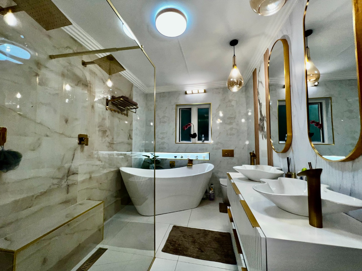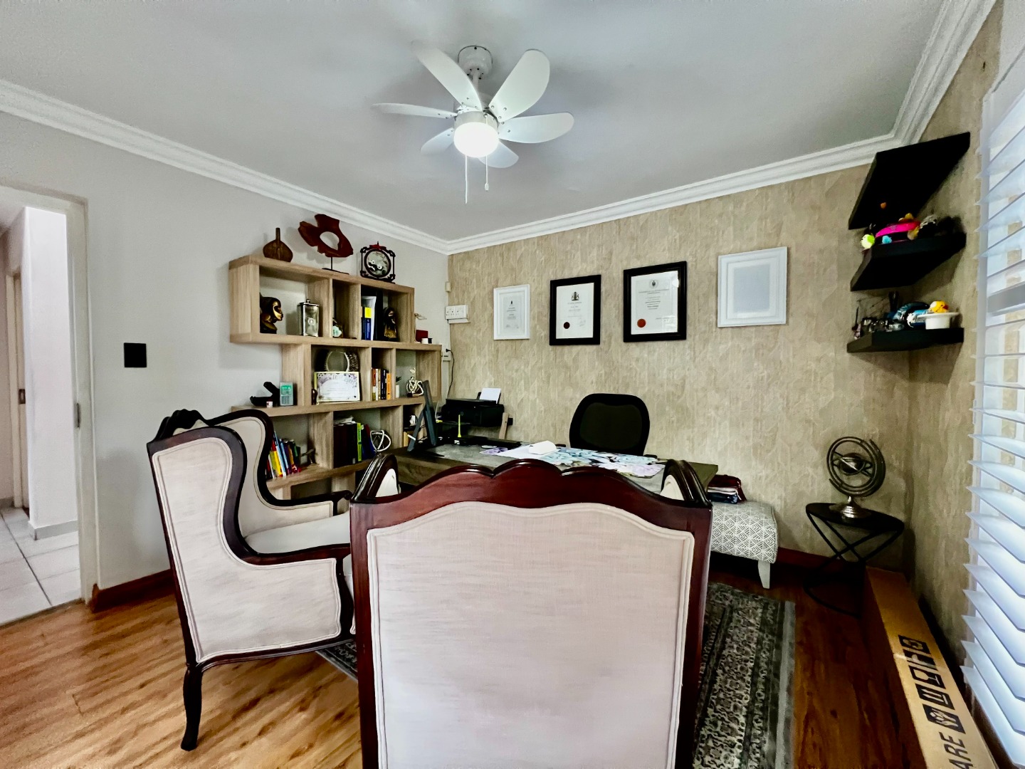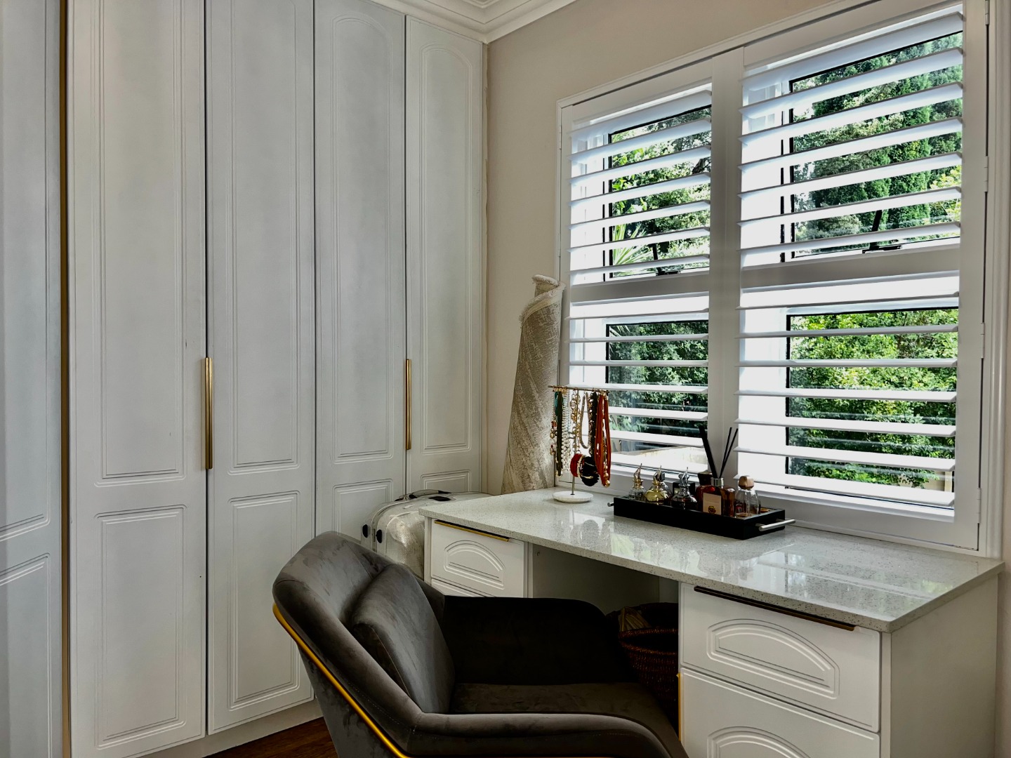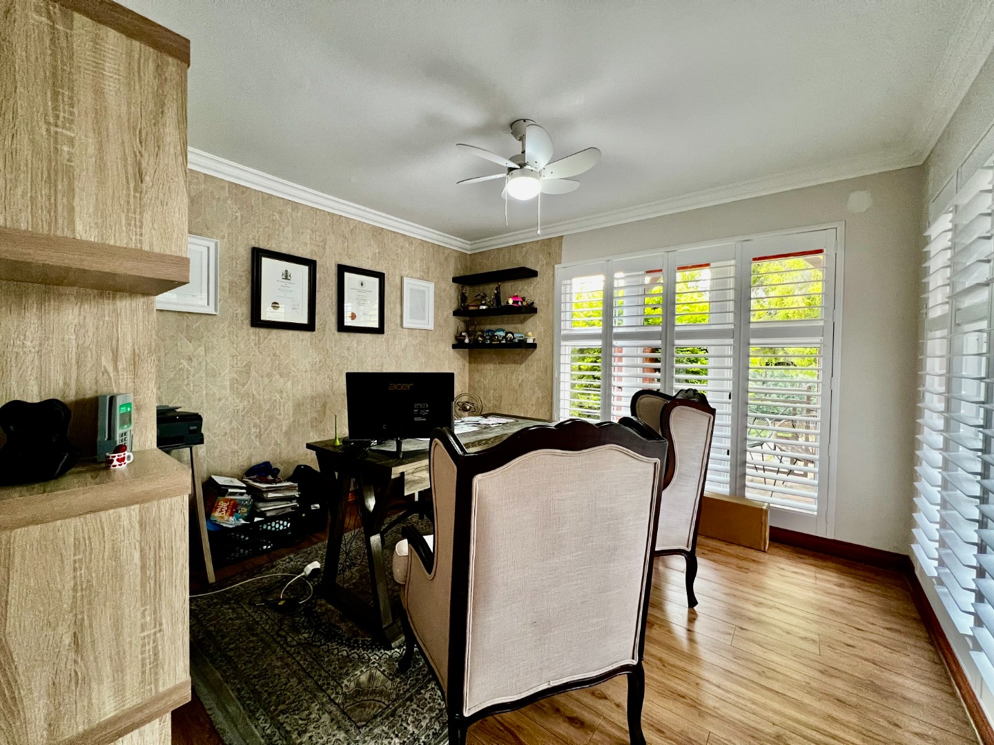 - Main Suite (Upstairs): A luxurious retreat featuring wood-look tiling, elegant wallpaper, and security shutters. It boasts a massive walk-in closet with a built-in vanity and a "signature" full ensuite bathroom with a walk-in double-head shower and a standalone bath. Private top balcony access included.