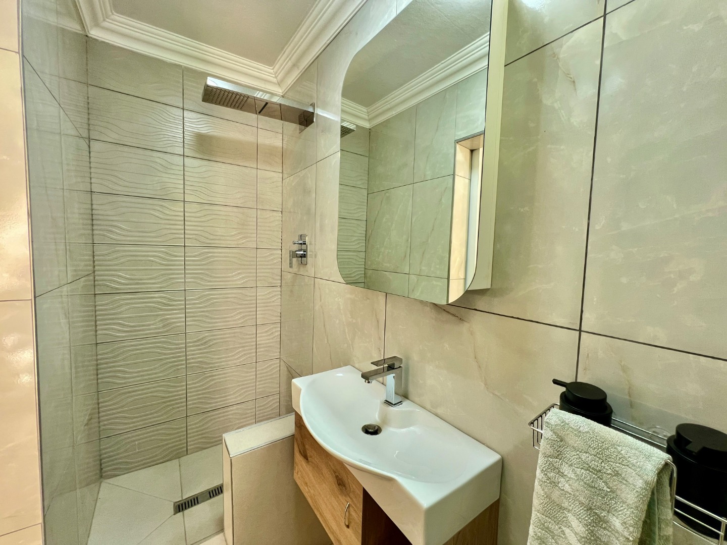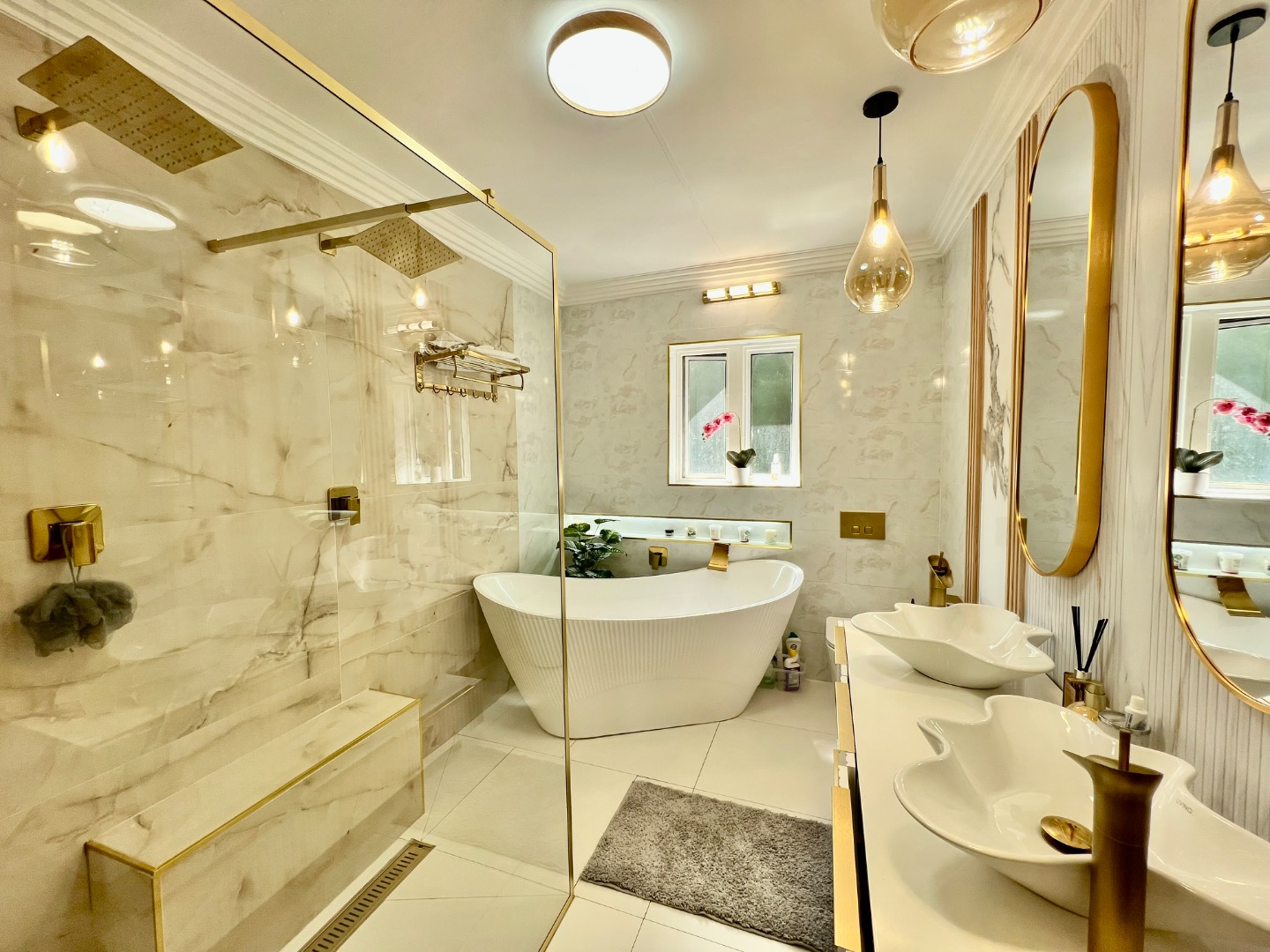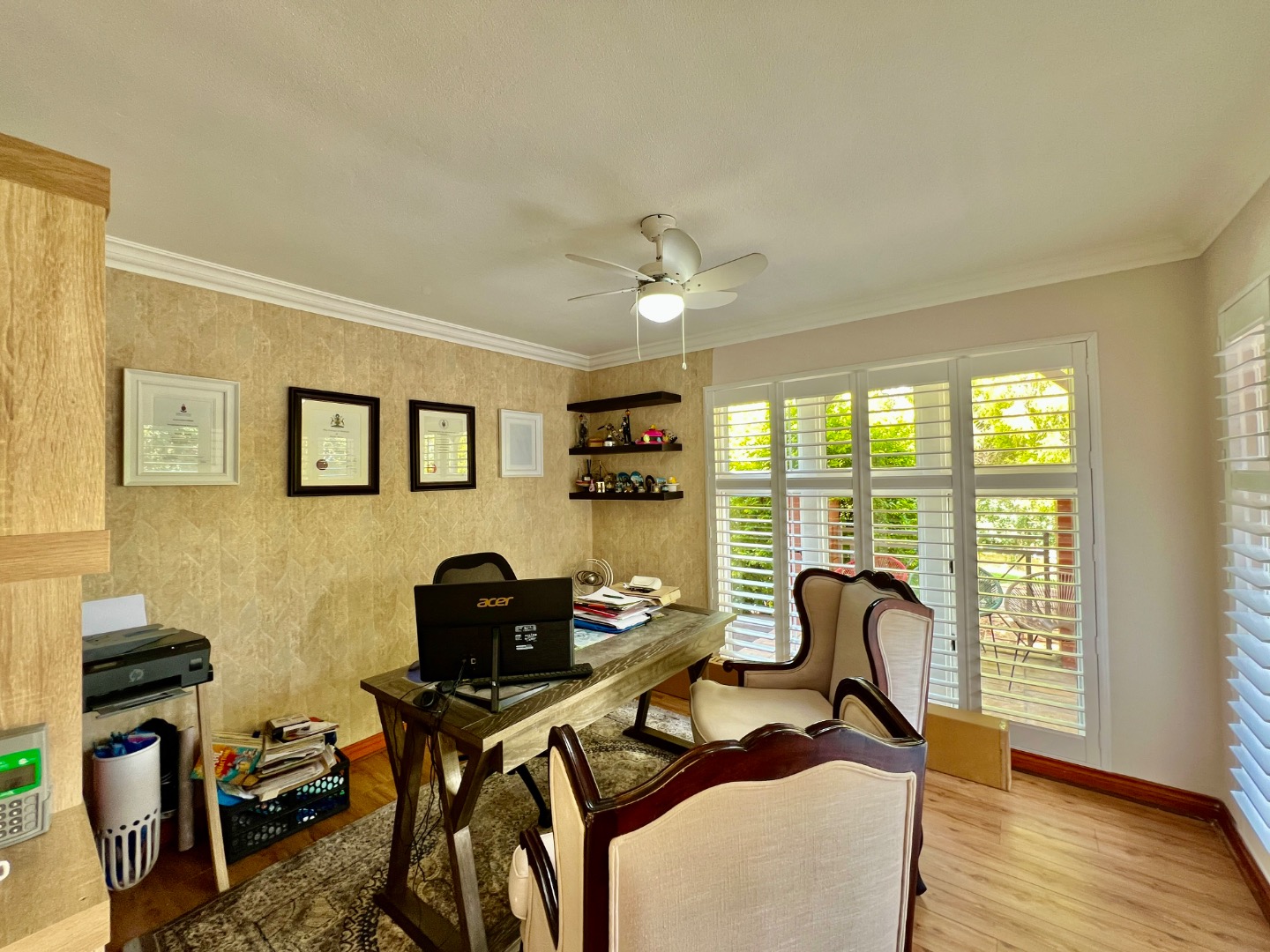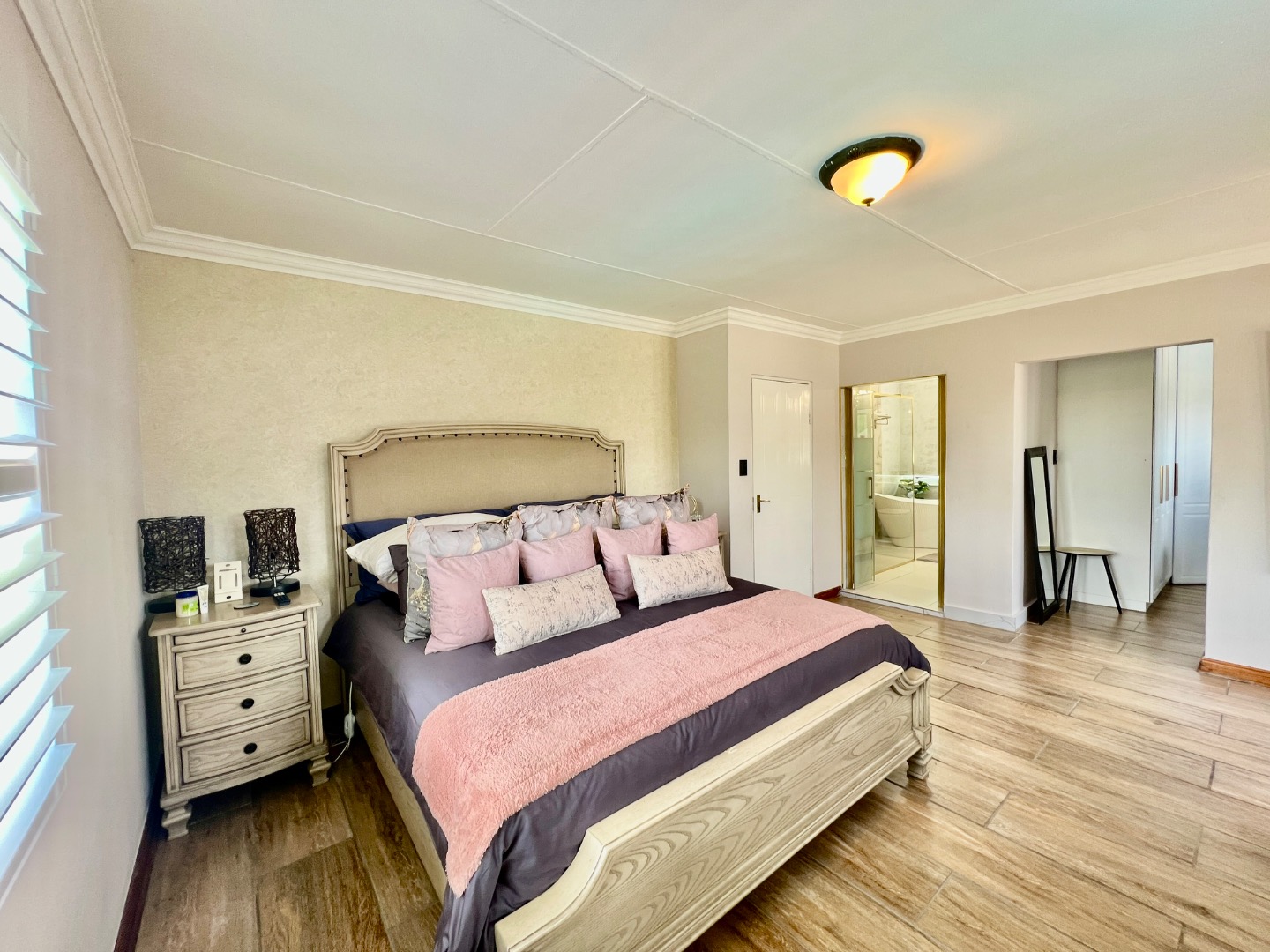 • Main Suite (Upstairs): A luxurious retreat featuring wood-look tiling, elegant wallpaper, and security shutters. It boasts a massive walk-in closet with a built-in vanity and a "signature" full ensuite bathroom with a walk-in double-head shower and a standalone bath. Private top balcony access included.
