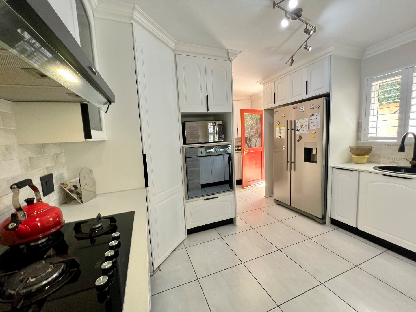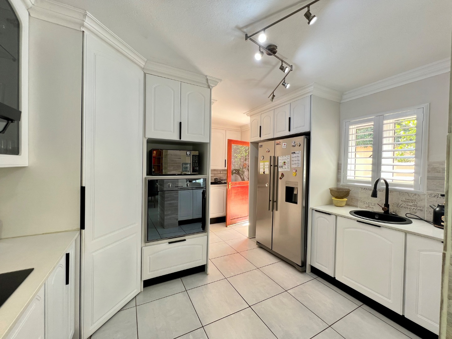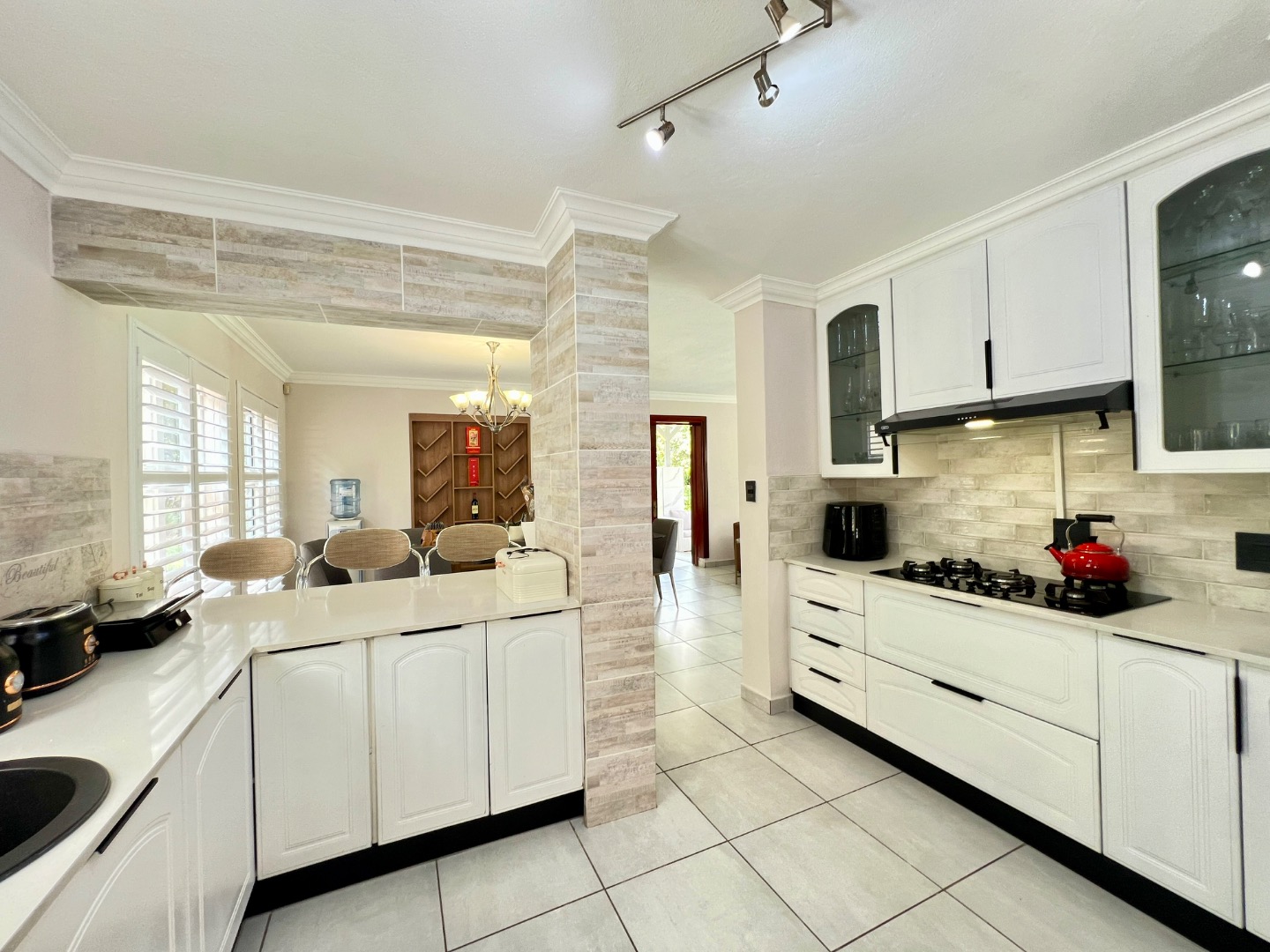 • Gourmet Kitchen: A chef’s delight featuring Caesarstone countertops, a gas hob, and a signature stone basin. It includes a prep bowl, space for a double fridge, and a separate scullery with room for two appliances.