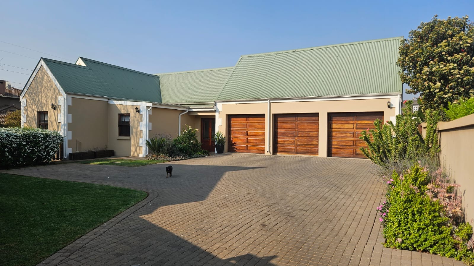 This elegant home offers 3 bedrooms with ample built-in cupboards, 2 full bathrooms (1 en-suite bathrooms). Full domestic room with en-suite bathroom and cupboard. The study is fitted with wooden cupboards, bookshelves and worktops. Living areas consist of spacious open plan lounge, dining room and kitchen. The kitchen has a separate scullery/ laundry with space for appliances. From the living areas, you have access to the garden and covered patio with build in braai. Ample parking space, 3 garage that is interleaving the house. The garden is established with trees.
