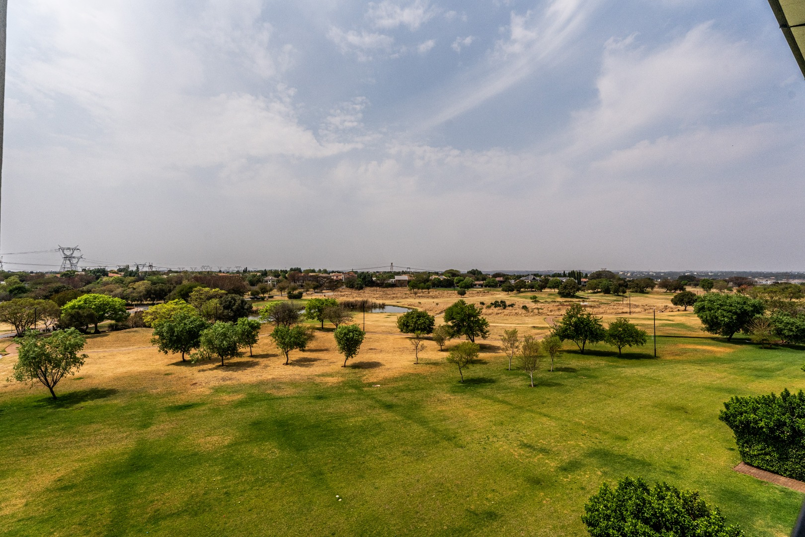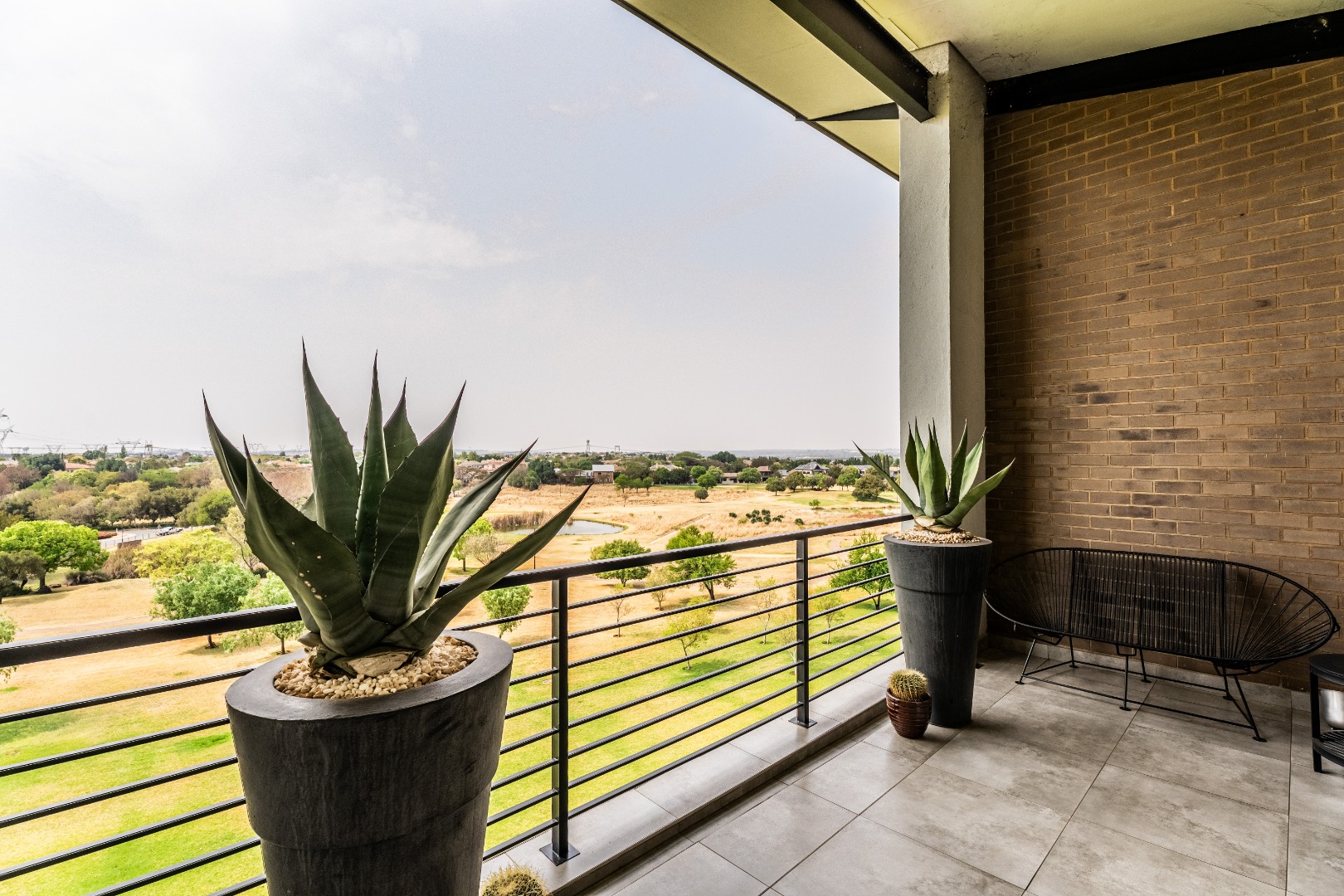 Cozy lounge opens onto a balcony with uninterrupted golf course views