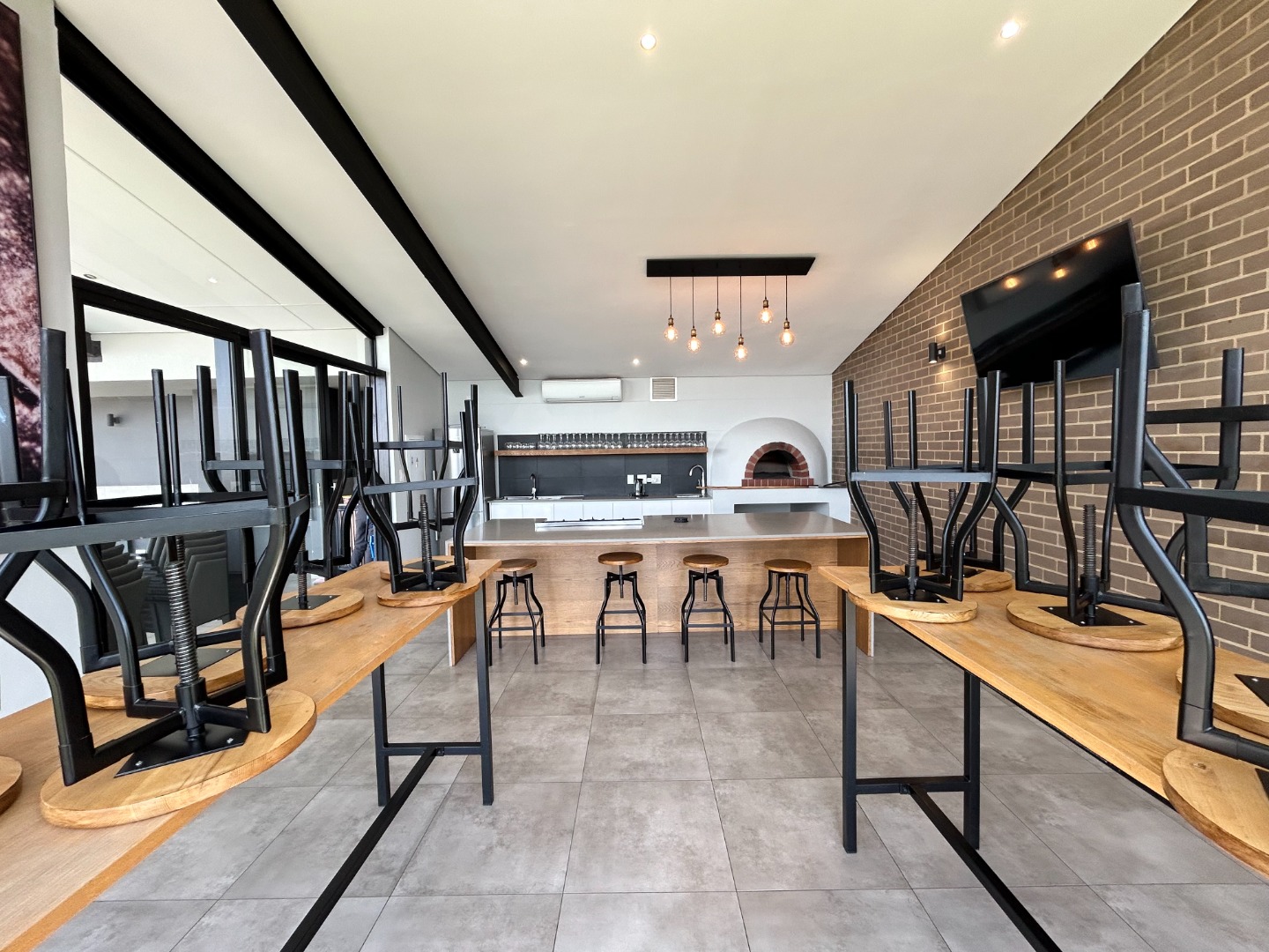 The dining area features stylish built-in cupboards and a wine display unit, creating a sophisticated yet functional space for entertaining or family meals. Large glass sliding doors flood the home with natural light and open onto the outdoor area, perfect for effortless indoor-outdoor living.