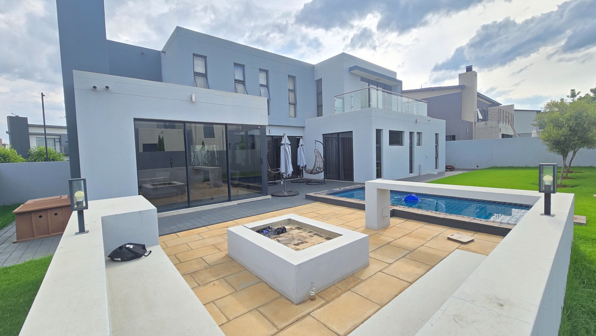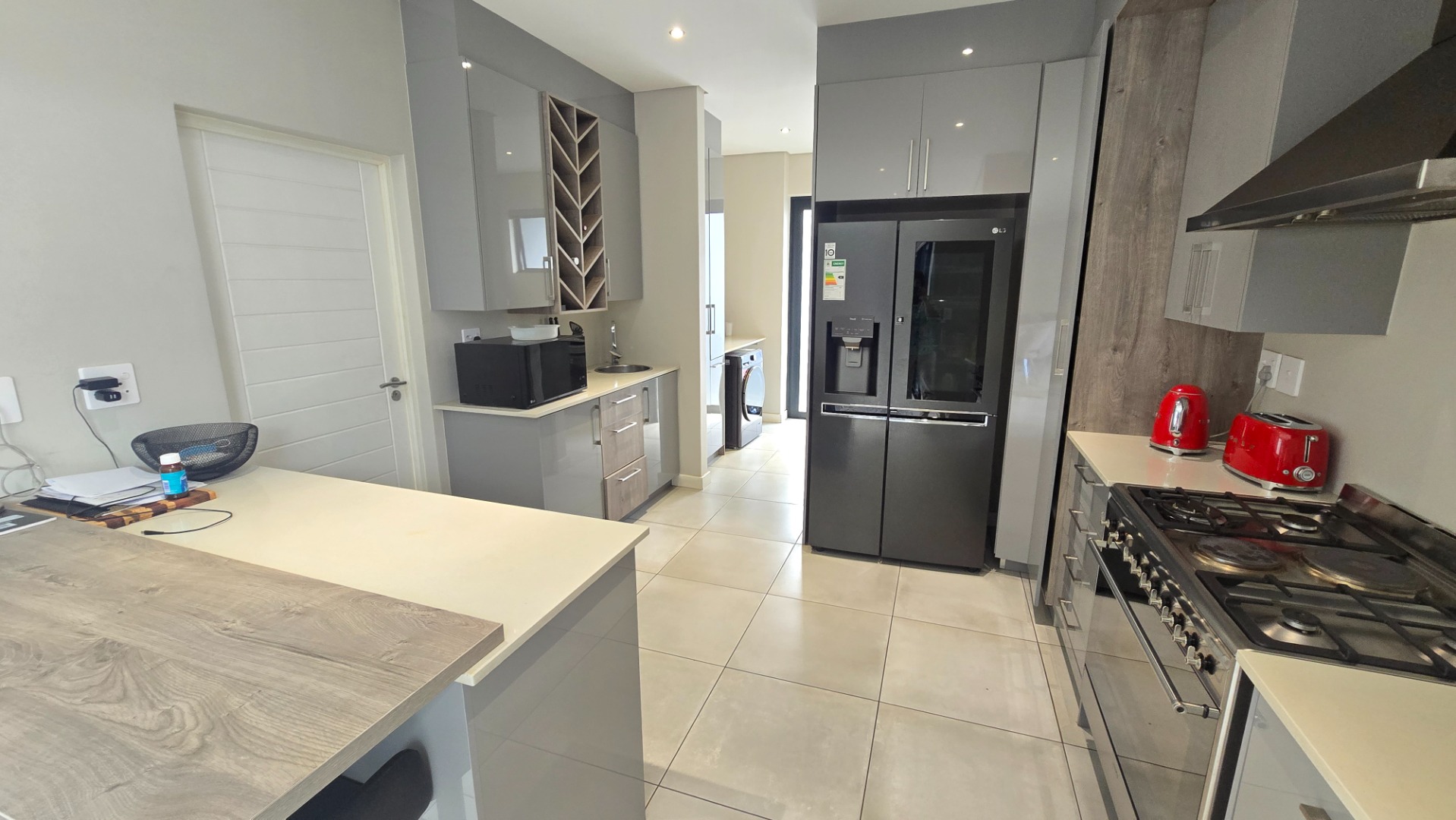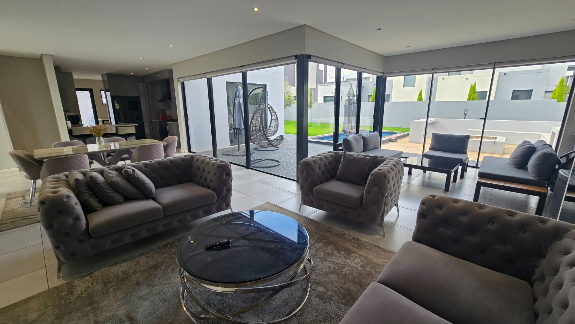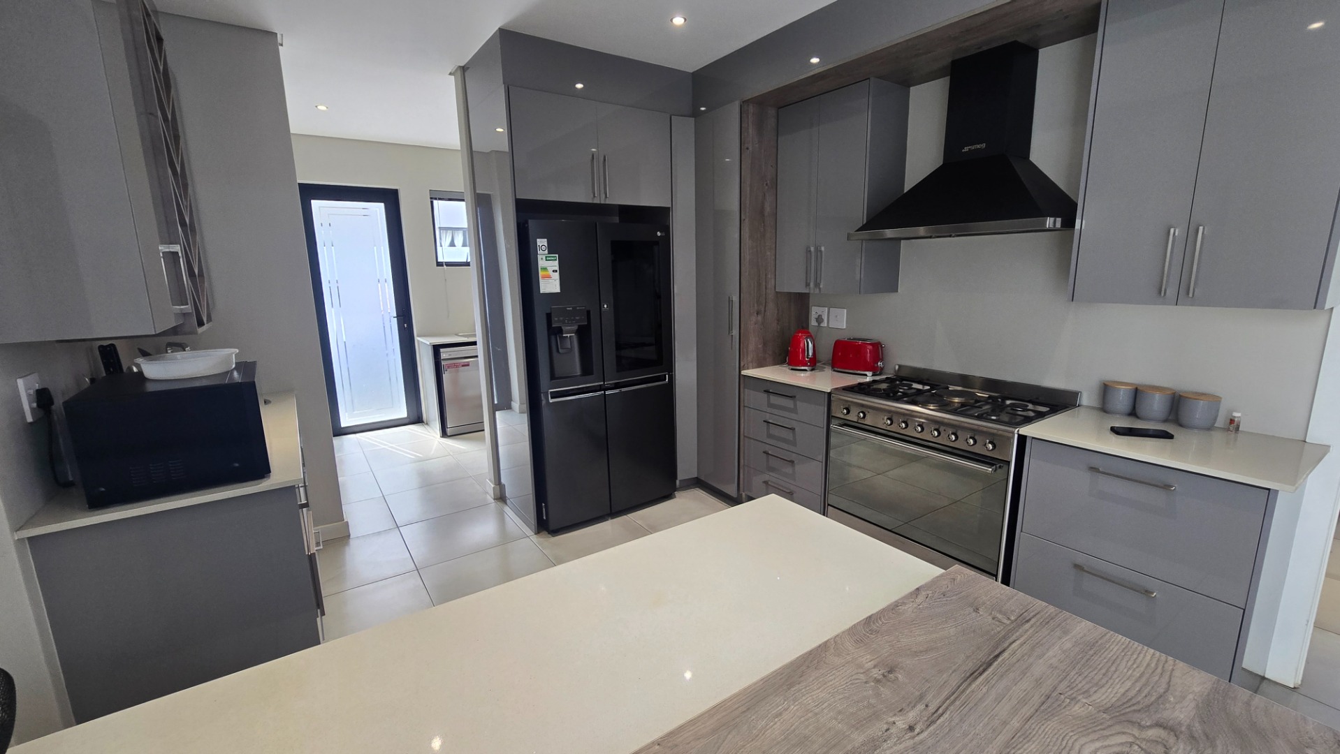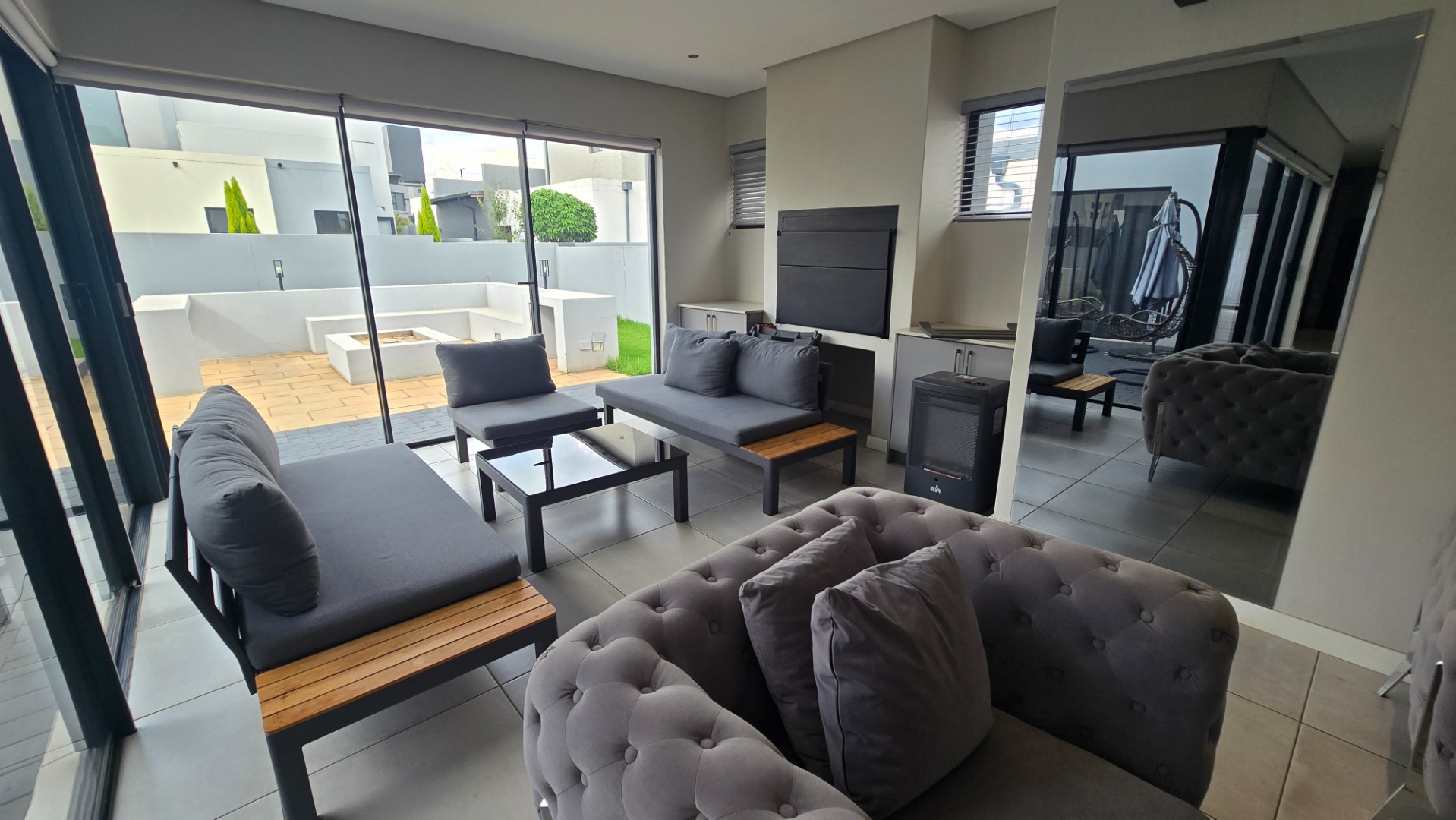 Discover modern estate living in this exquisite 4-bedroom, 3.5-bathroom rental home, perfectly situated within the sought-after Midstream Ridge Estate in Centurion, South Africa. This contemporary residence boasts an open-plan design, seamlessly integrating the lounge, dining area, and entertainment area, all bathed in natural light from expansive sliding glass doors. The sleek, high-gloss grey kitchen is a culinary delight, featuring a practical island, white countertops, and high-end appliances including a gas range and a SMEG extractor. A dedicated scullery and laundry area enhance functionality.