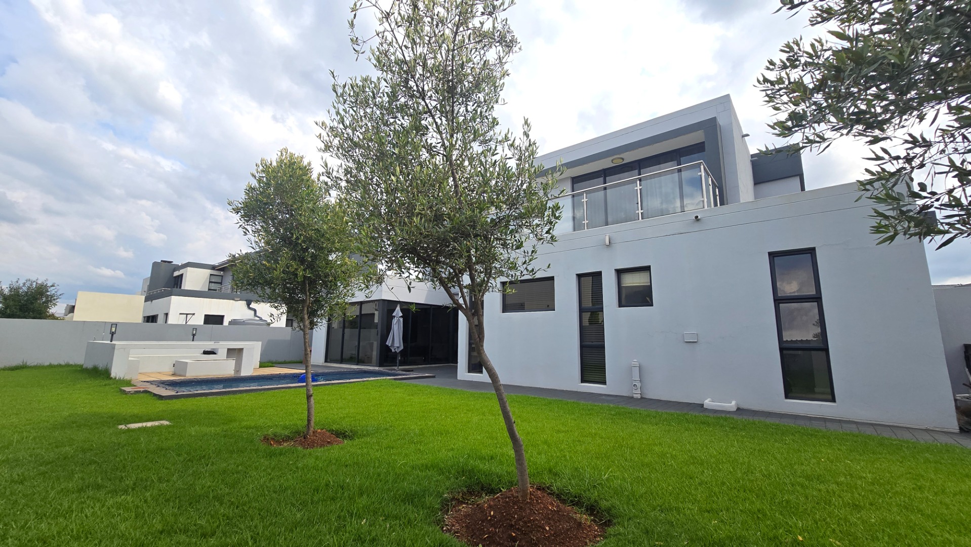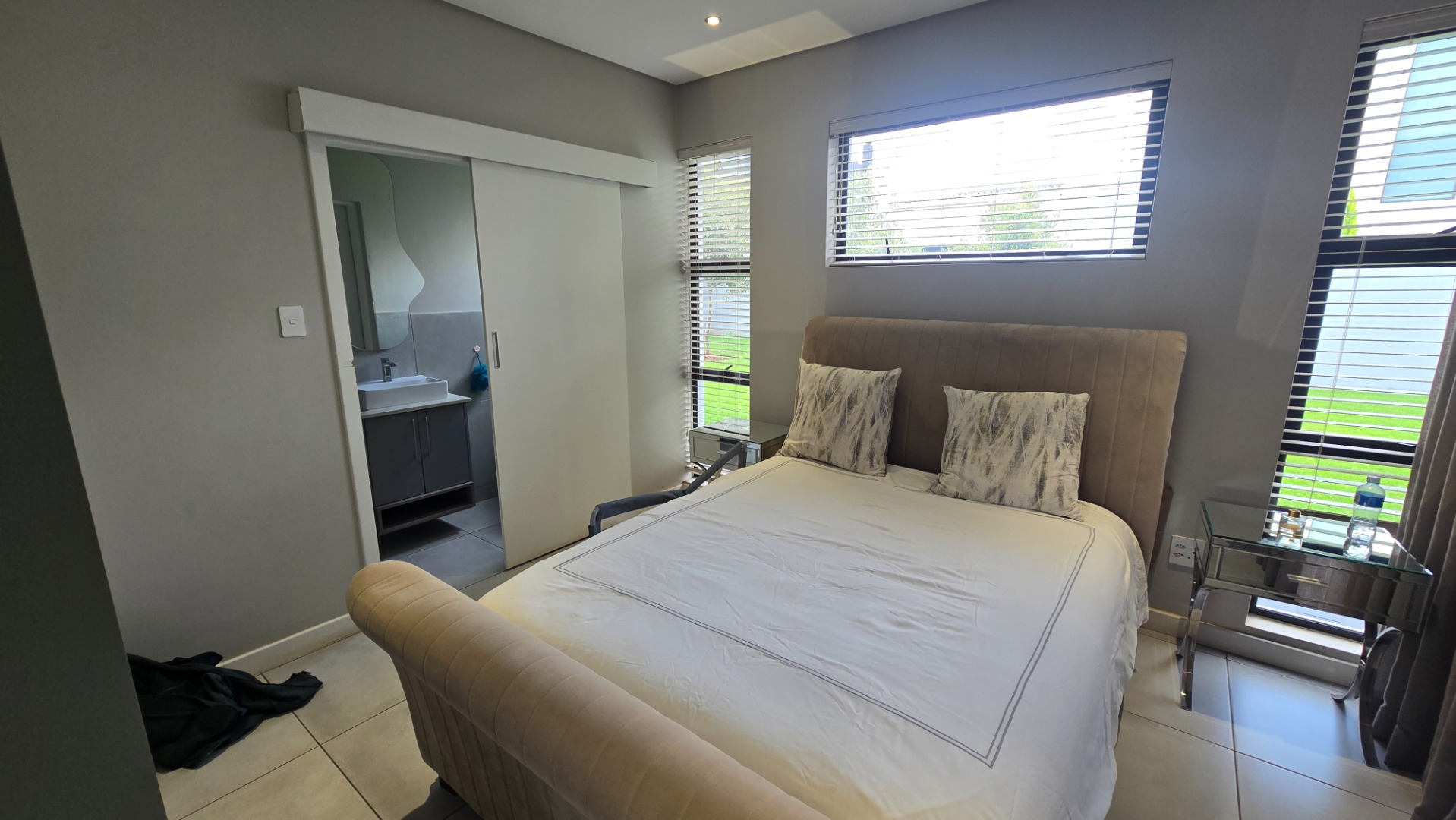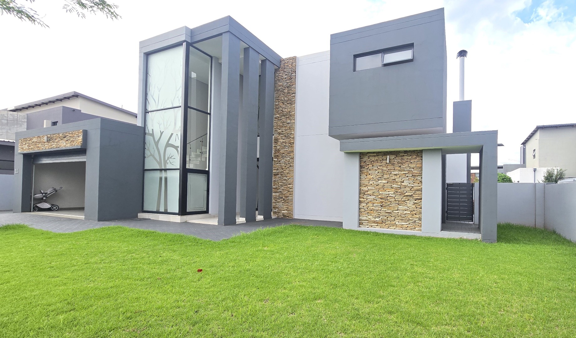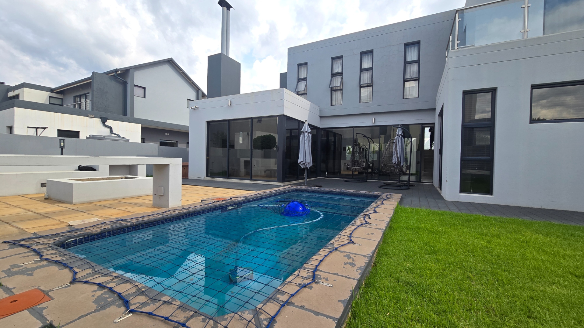 Discover modern estate living in this exquisite 4-bedroom, 3.5-bathroom rental home, perfectly situated within the sought-after Midstream Ridge Estate in Centurion, South Africa. This contemporary residence boasts an open-plan design, seamlessly integrating the lounge, dining area, and entertainment area, all bathed in natural light from expansive sliding glass doors. The sleek, high-gloss grey kitchen is a culinary delight, featuring a practical island, white countertops, and high-end appliances including a gas range and a SMEG extractor. A dedicated scullery and laundry area enhance functionality.