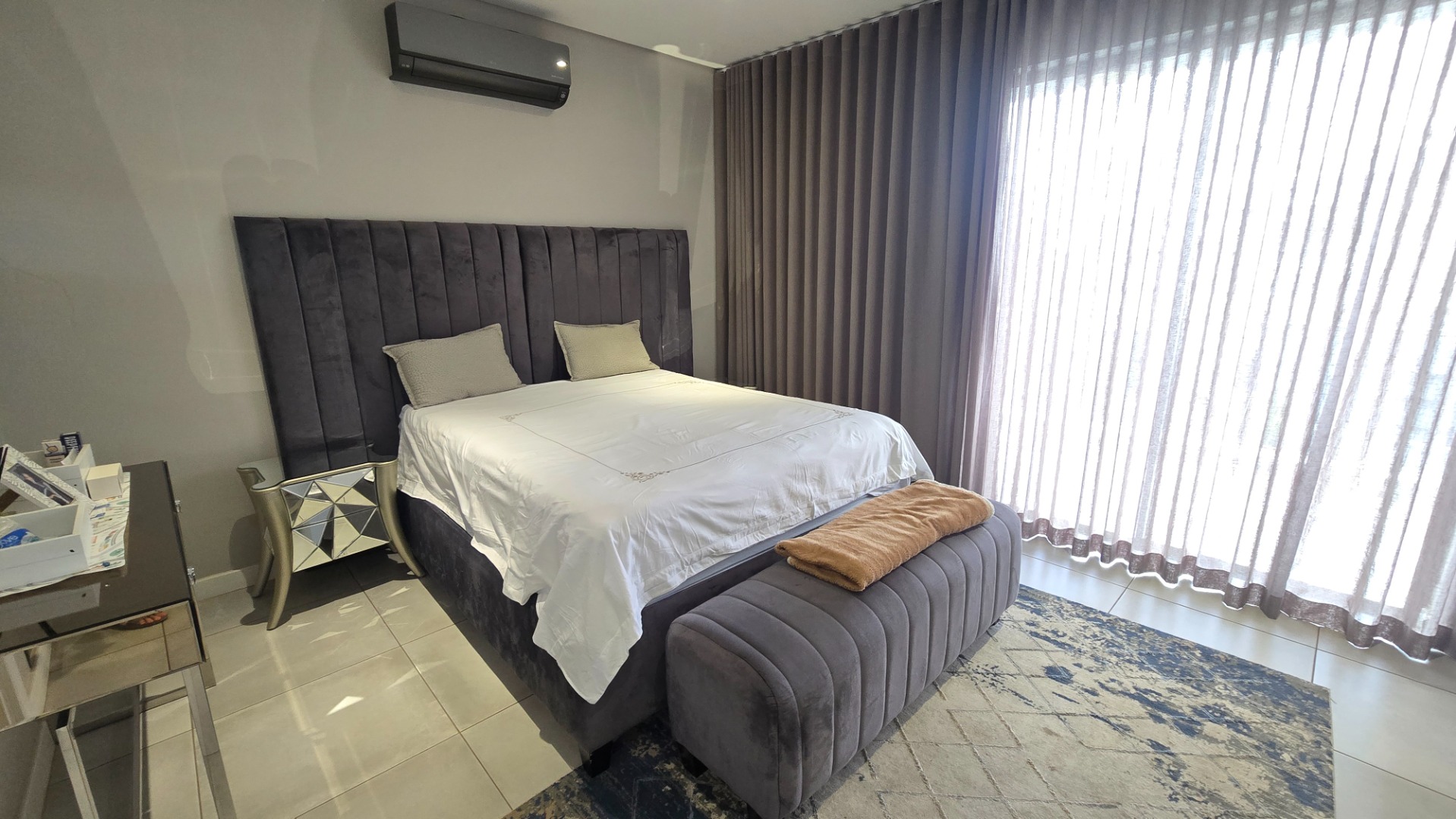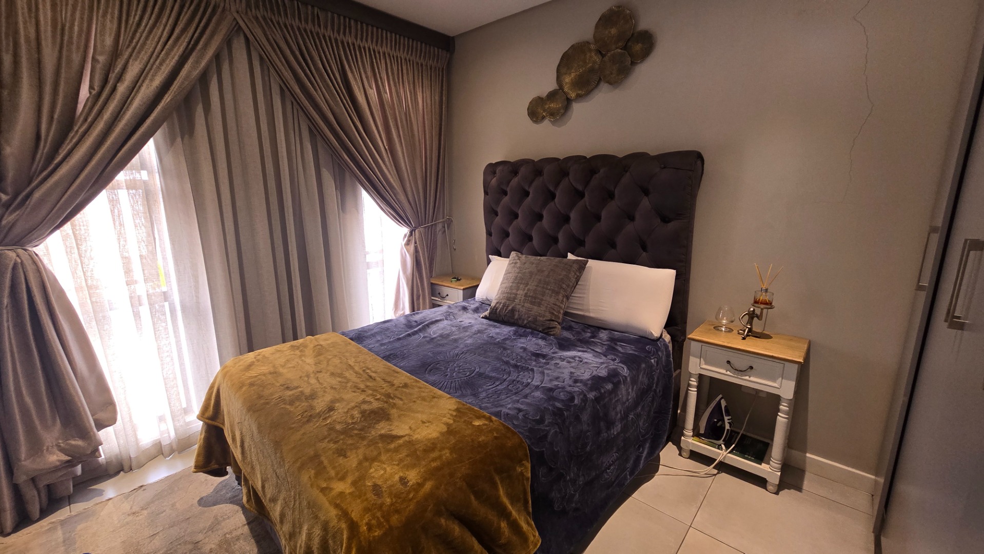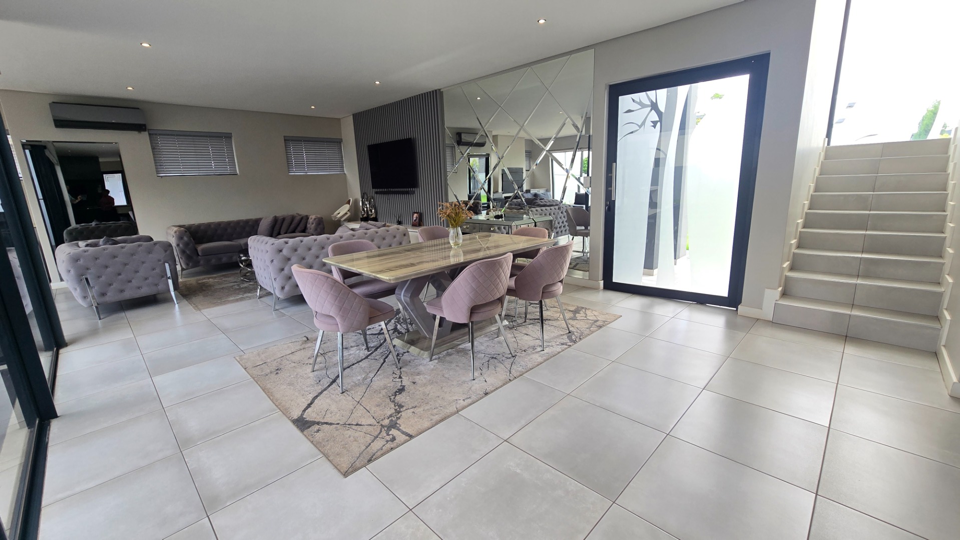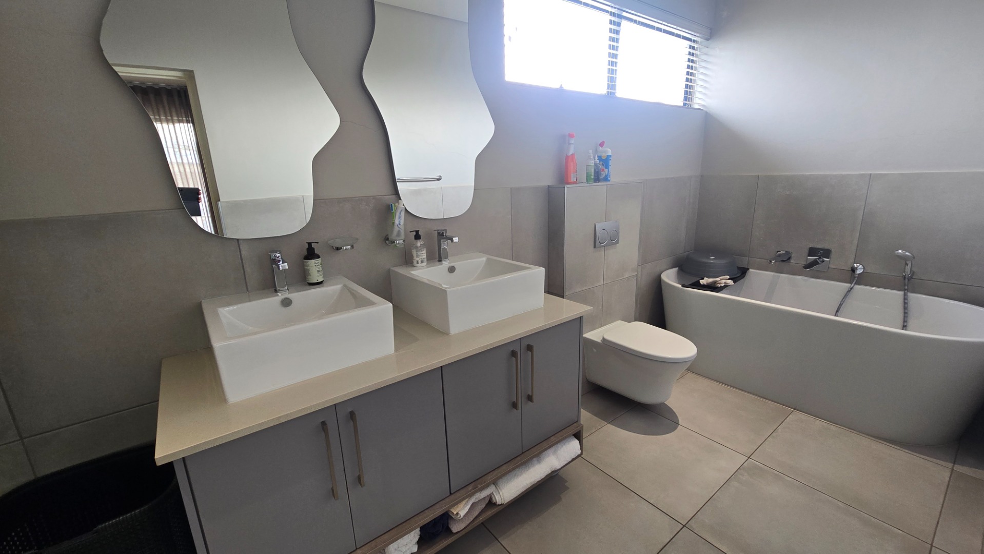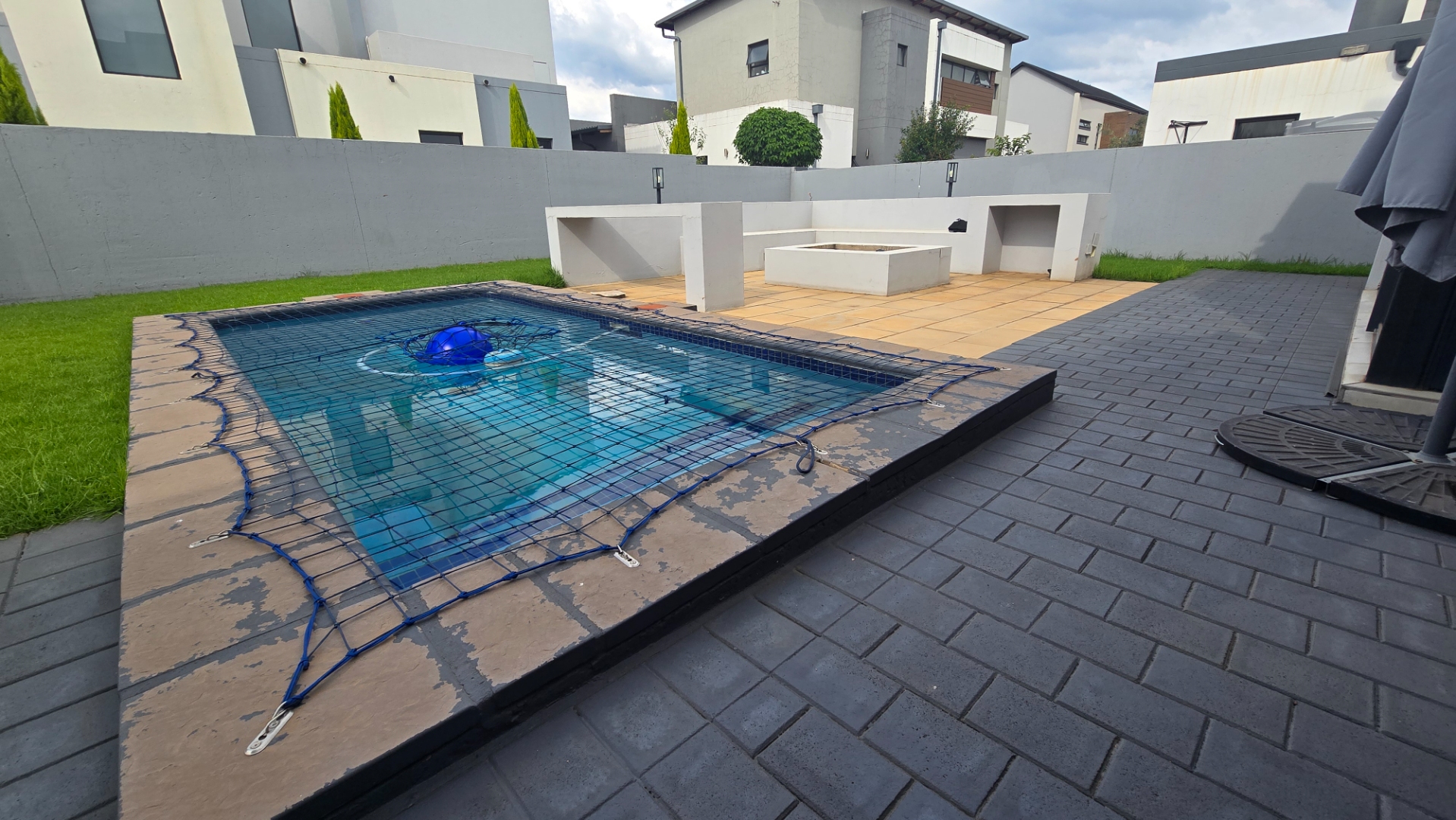 Discover modern estate living in this exquisite 4-bedroom, 3.5-bathroom rental home, perfectly situated within the sought-after Midstream Ridge Estate in Centurion, South Africa. This contemporary residence boasts an open-plan design, seamlessly integrating the lounge, dining area, and entertainment area, all bathed in natural light from expansive sliding glass doors. The sleek, high-gloss grey kitchen is a culinary delight, featuring a practical island, white countertops, and high-end appliances including a gas range and a SMEG extractor. A dedicated scullery and laundry area enhance functionality.
