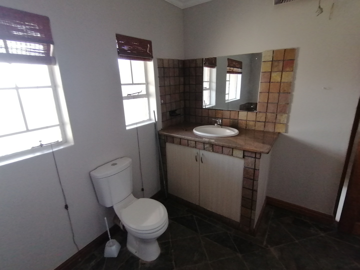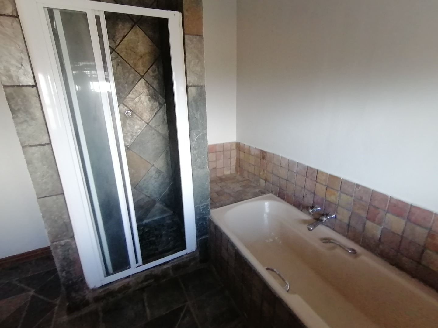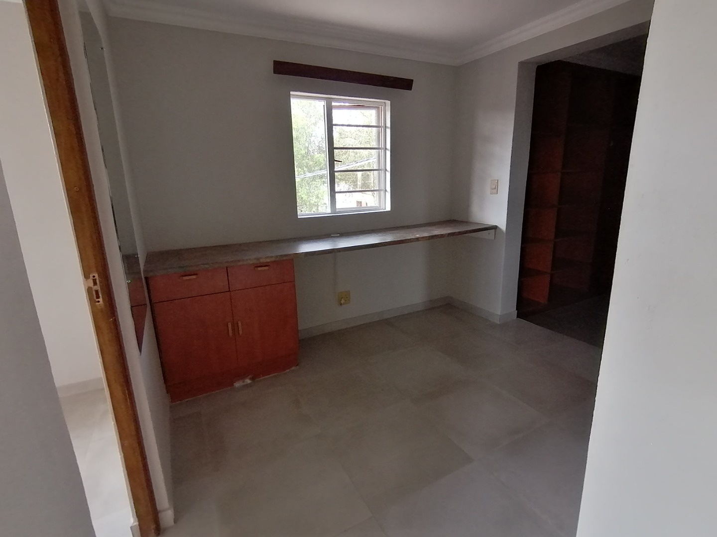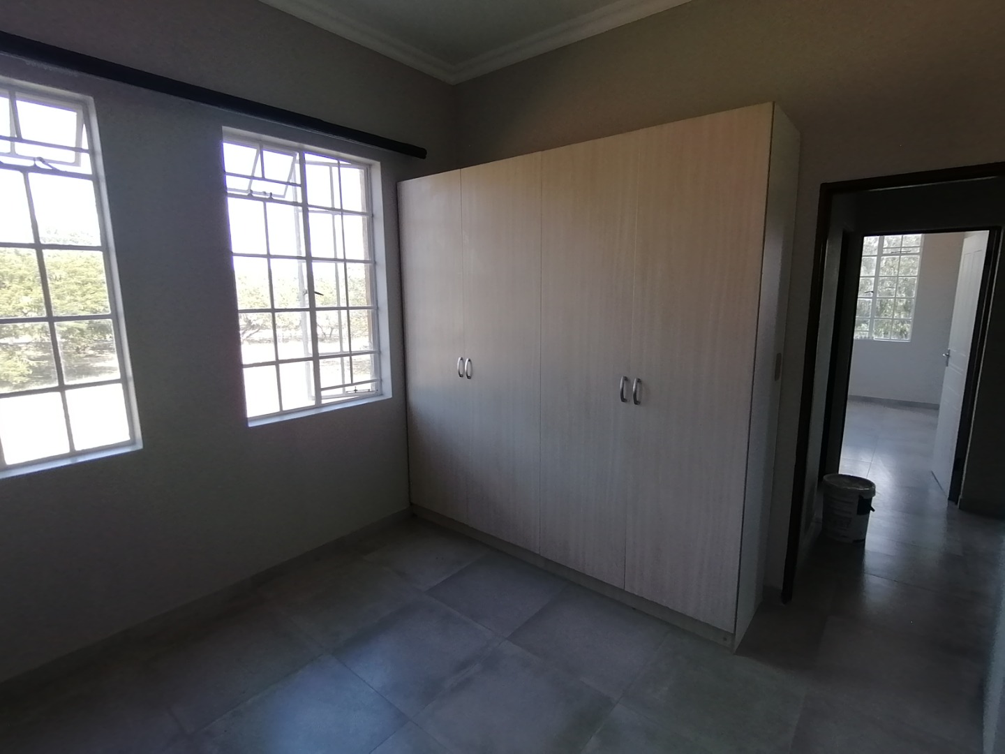 The House was renovated recently with new floor tiles and cupboards in the kitchen. The whole house was repainted inside. You enter the house at the kitchen. It is spacious open plan with gas stove and oven and cupboards. Next to the kitchen is a room which can be utilized as a pantry. The open plan kitchen flows into a large living area for a dining room and lounge and with a closed veranda off lounge. Here there are 3 bedrooms serviced by a bathroom with a shower, basin, and toilet. One room has installed cupboards. On the other side of the living area are 2 bedrooms serviced by a bathroom with a bath, shower, basin and toilet. Both rooms have built-in cupboards. A small passage with a small entrance area and adjacent room (could be used as extra bedroom or study) leads to the spacious main bedroom. It has a walk-through cupboard leading to a bathroom with a bath, shower, basins and toilet. The main bedroom also walks out onto a small balcony.
