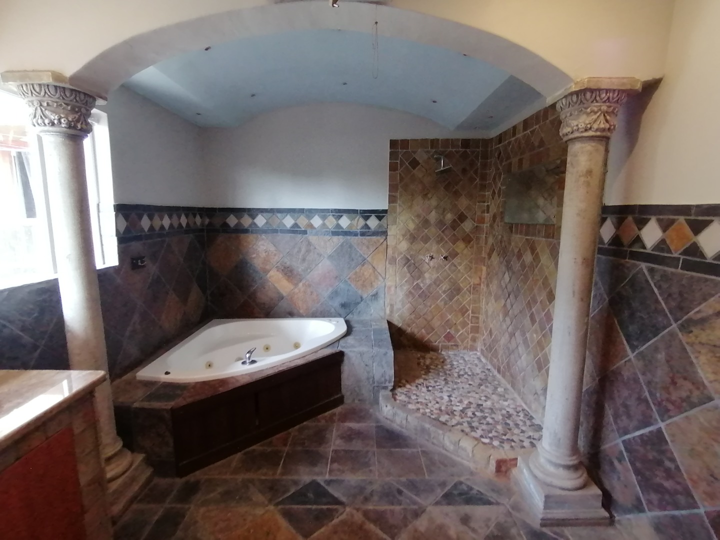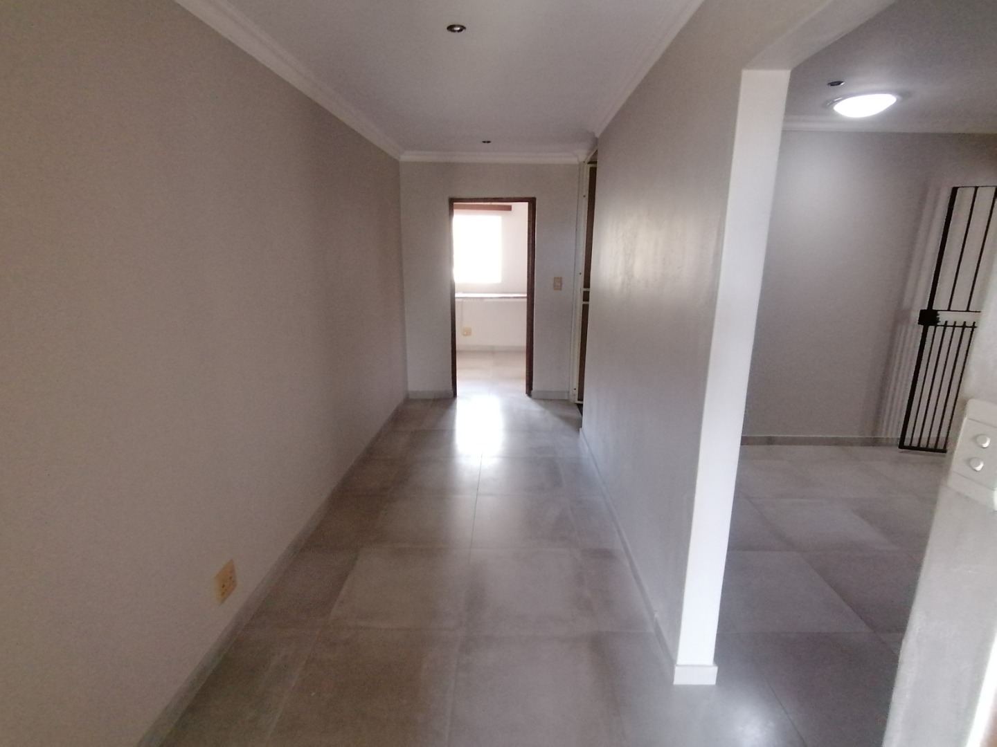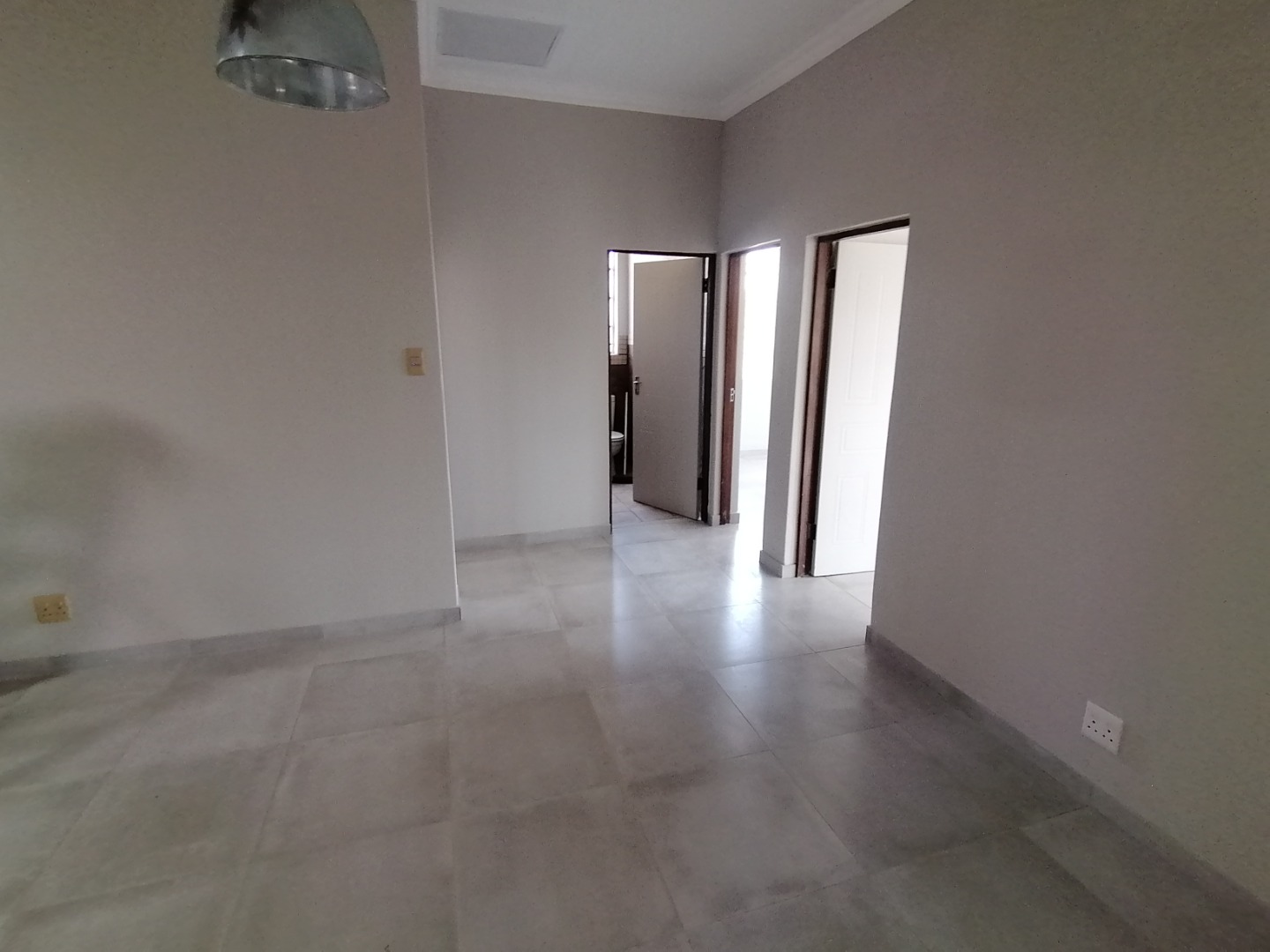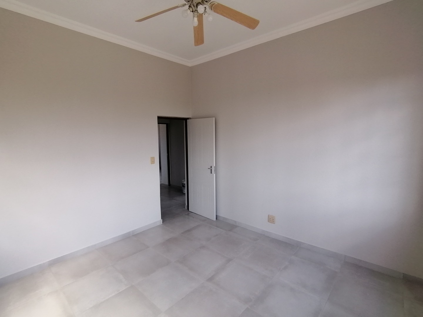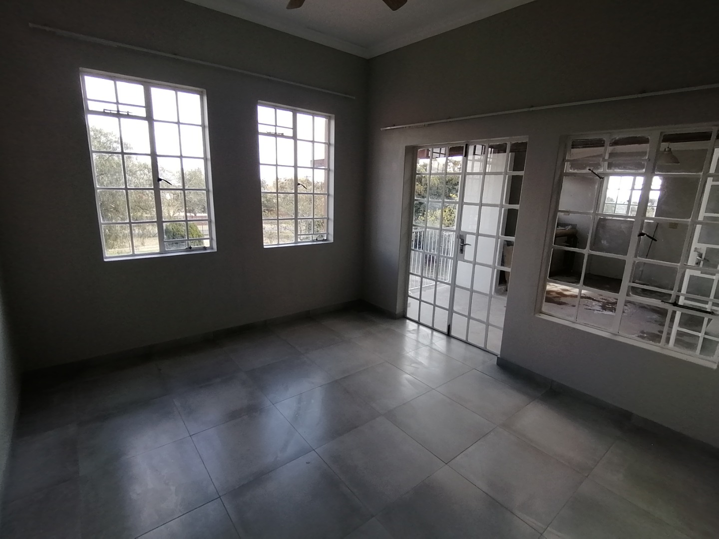The House was renovated recently with new floor tiles and cupboards in the kitchen. The whole house was repainted inside. You enter the house at the kitchen. It is spacious open plan with gas stove and oven and cupboards. Next to the kitchen is a room which can be utilized as a pantry. The open plan kitchen flows into a large living area for a dining room and lounge and with a closed veranda off lounge. Here there are 3 bedrooms serviced by a bathroom with a shower, basin, and toilet. One room has installed cupboards. On the other side of the living area are 2 bedrooms serviced by a bathroom with a bath, shower, basin and toilet. Both rooms have built-in cupboards. A small passage with a small entrance area and adjacent room (could be used as extra bedroom or study) leads to the spacious main bedroom. It has a walk-through cupboard leading to a bathroom with a bath, shower, basins and toilet. The main bedroom also walks out onto a small balcony.