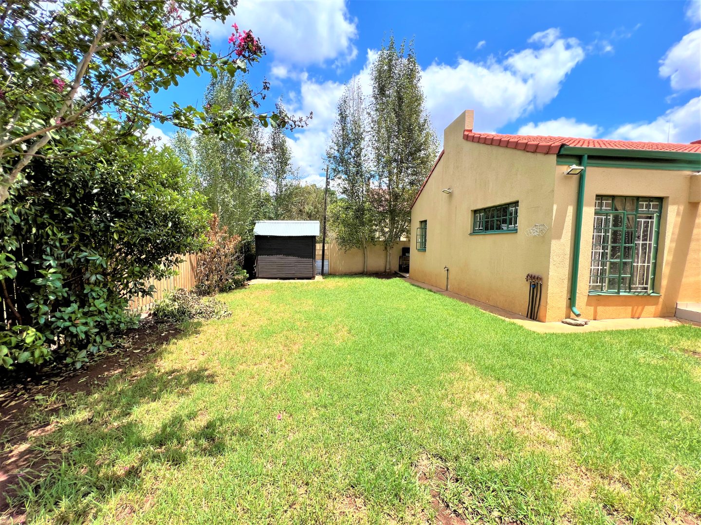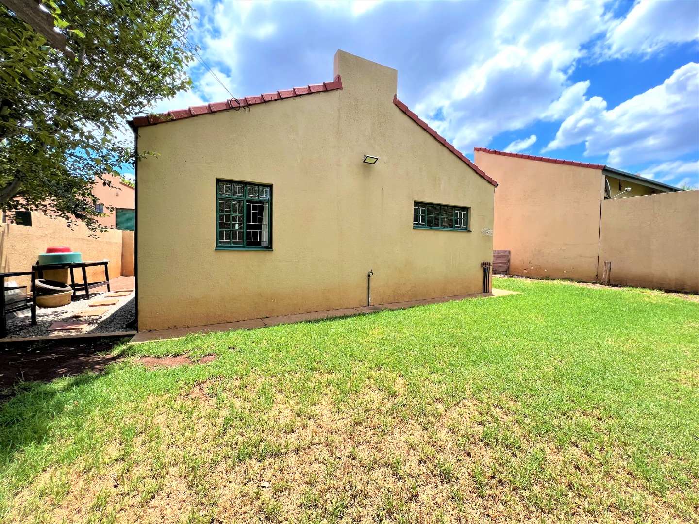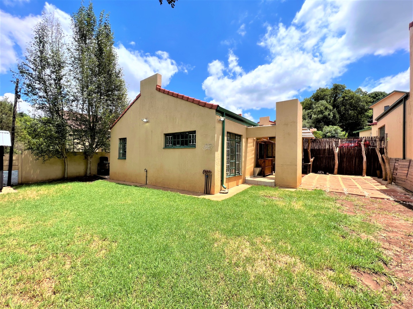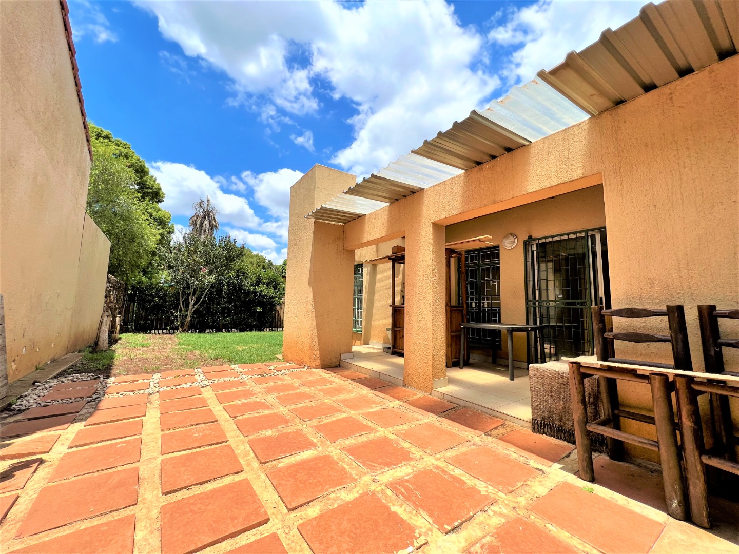 This stunning modern 2 Bedroom Town House is ideal for a young couple or lock up and go, nestled in the ever sunny historic Valhalla. As you enter the front door you will find a spacious lounge with an open plan kitchen and dining area with modern finishes, beautifully tiled and well lit with downlights and a washing machine connection. Just outside through the lounge sliding door is a patio with a build in braai and a low maintenance spacious garden. The main bedroom is sunny, spacious and has sun throughout the day, both bedrooms have built in cupboards, are beautiful tiled and has down lights. There is one bathroom with a bath and a shower attachment with a separate toilet. This stunning complex is very private as their are only 5 units and there is also a shared borehole and prepaid electricity.