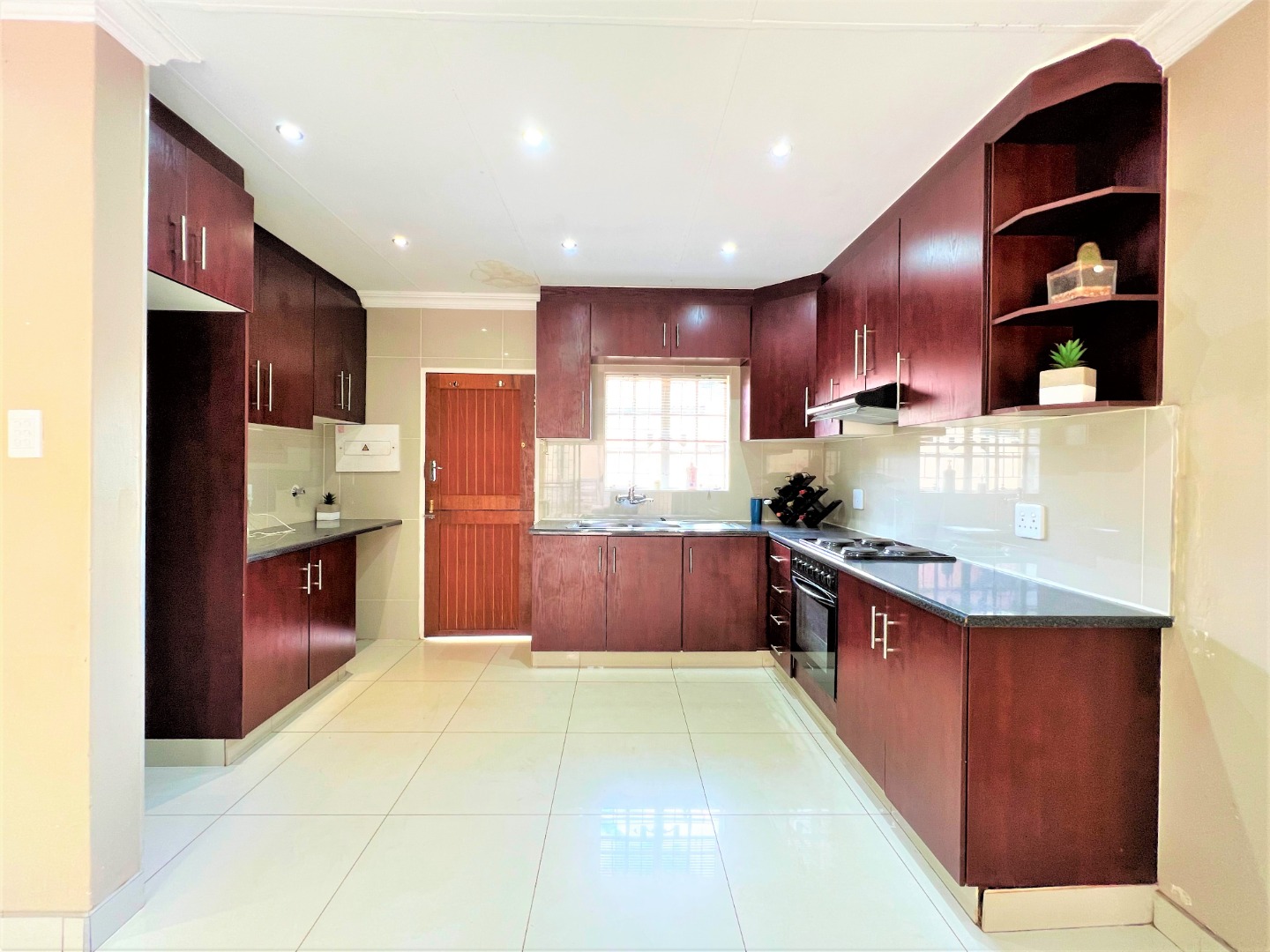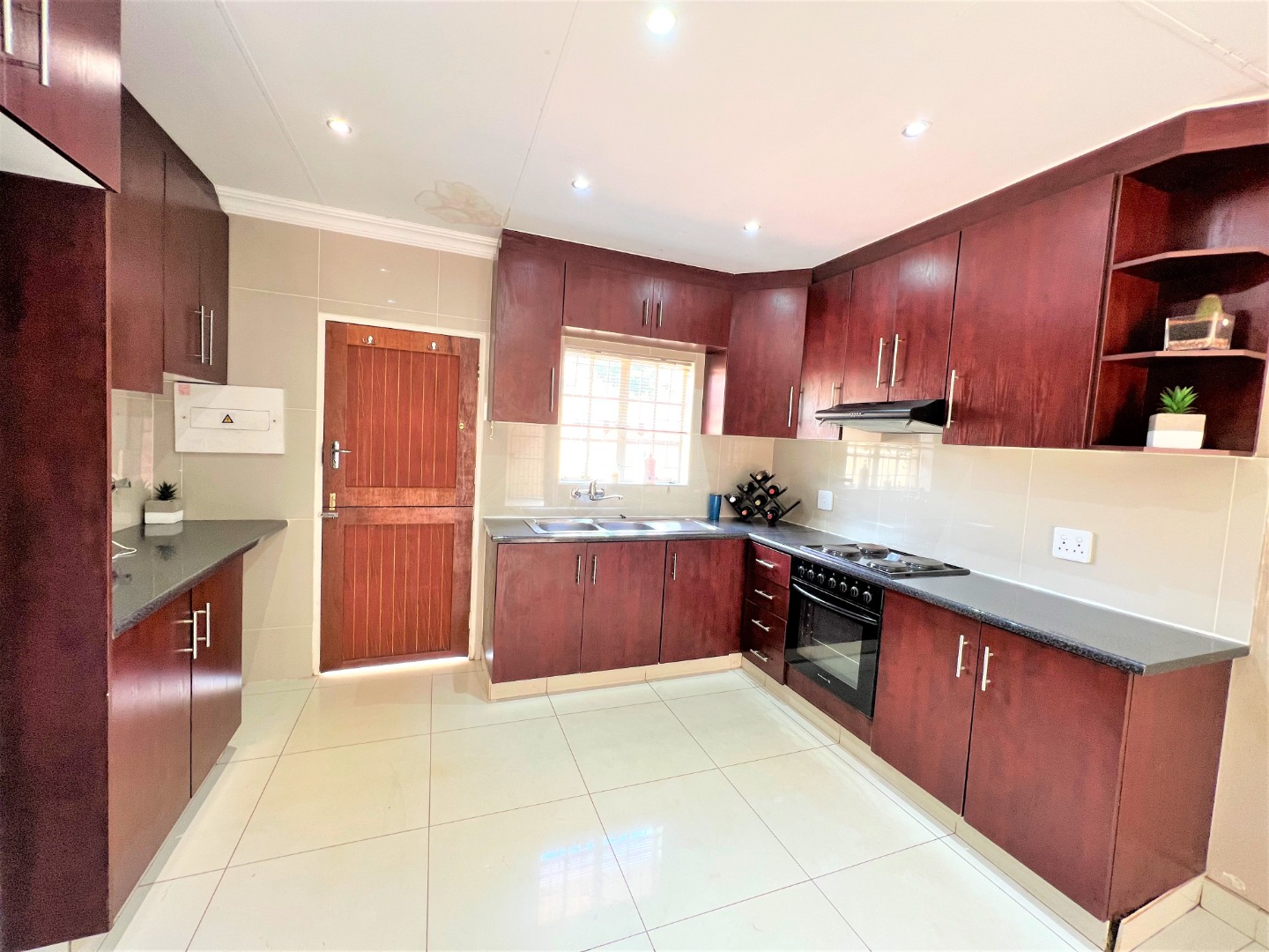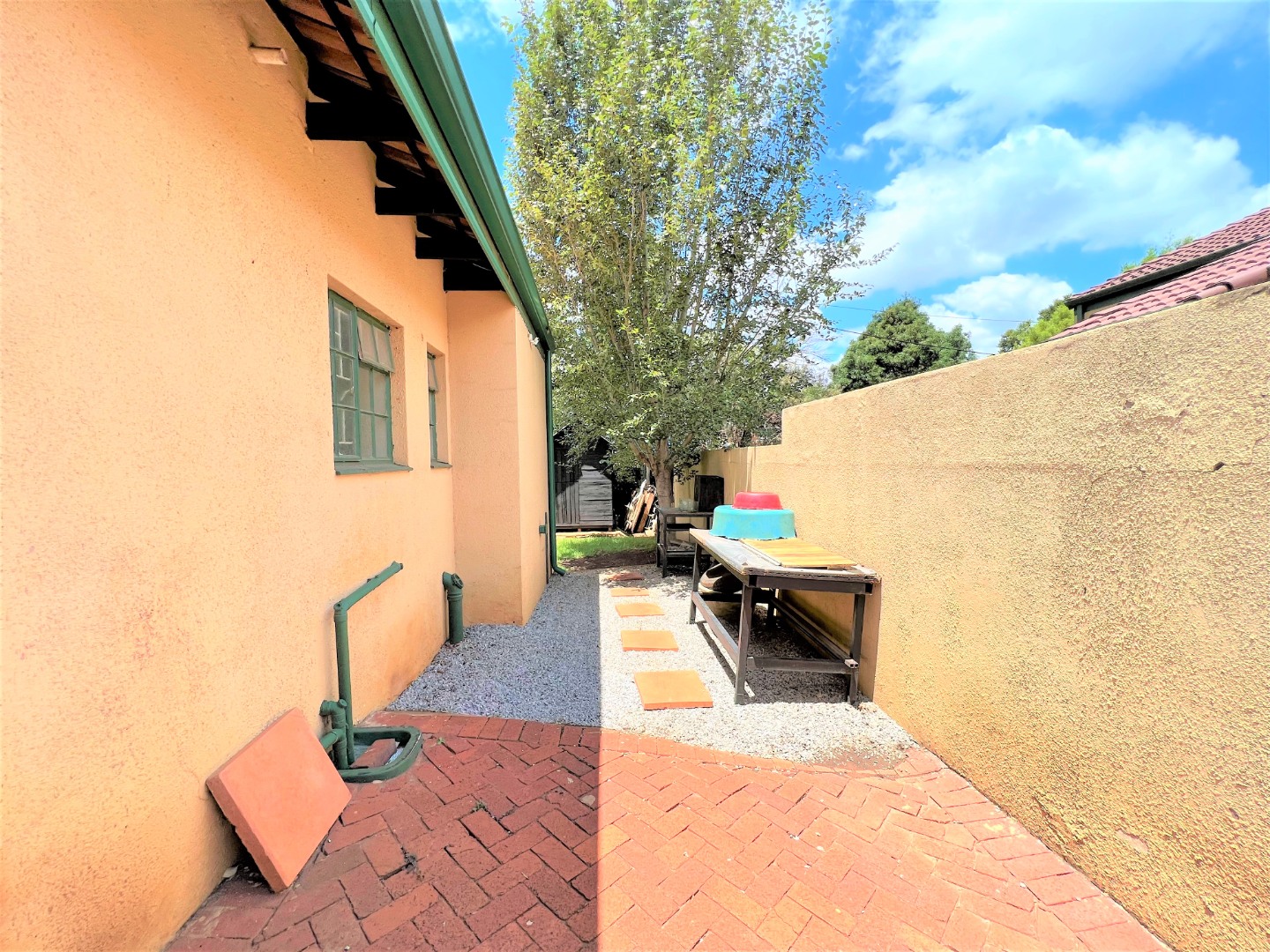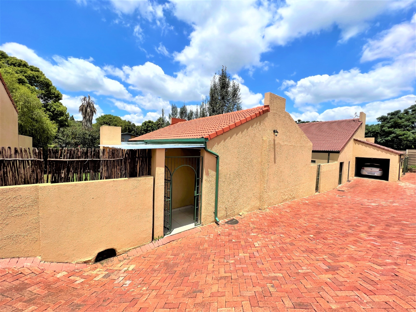 This stunning modern 2 Bedroom Town House is ideal for a young couple or lock up and go, nestled in the ever sunny historic Valhalla. As you enter the front door you will find a spacious lounge with an open plan kitchen and dining area with modern finishes, beautifully tiled and well lit with downlights and a washing machine connection. Just outside through the lounge sliding door is a patio with a build in braai and a low maintenance spacious garden. The main bedroom is sunny, spacious and has sun throughout the day, both bedrooms have built in cupboards, are beautiful tiled and has down lights. There is one bathroom with a bath and a shower attachment with a separate toilet. This stunning complex is very private as their are only 5 units and there is also a shared borehole and prepaid electricity.