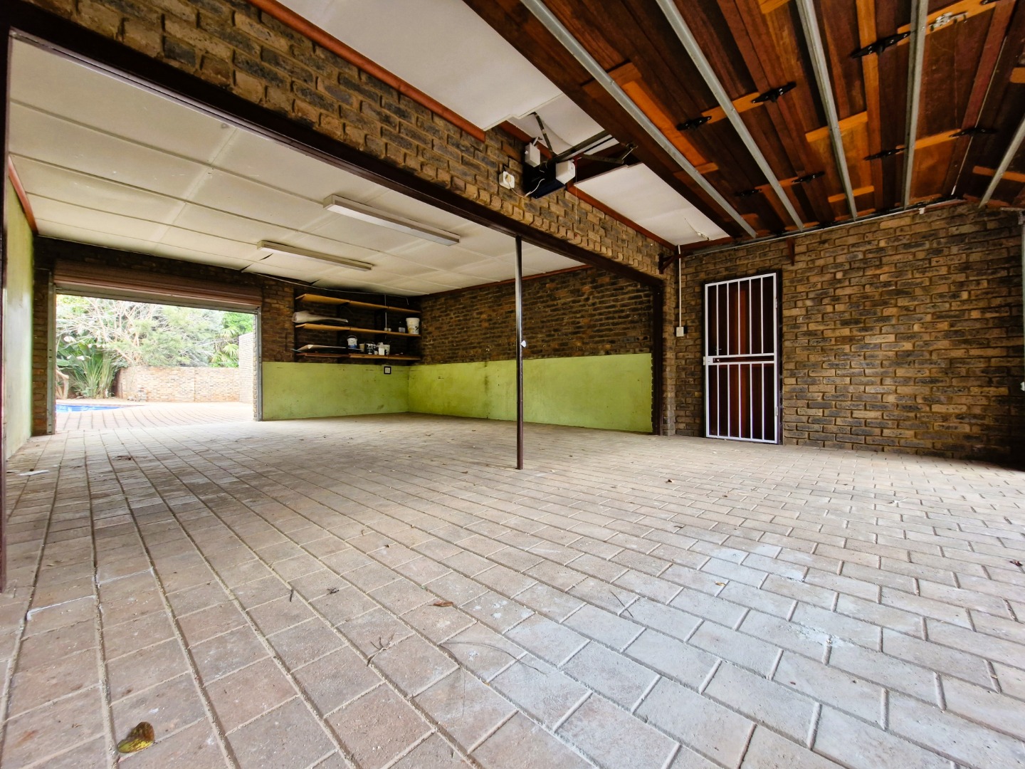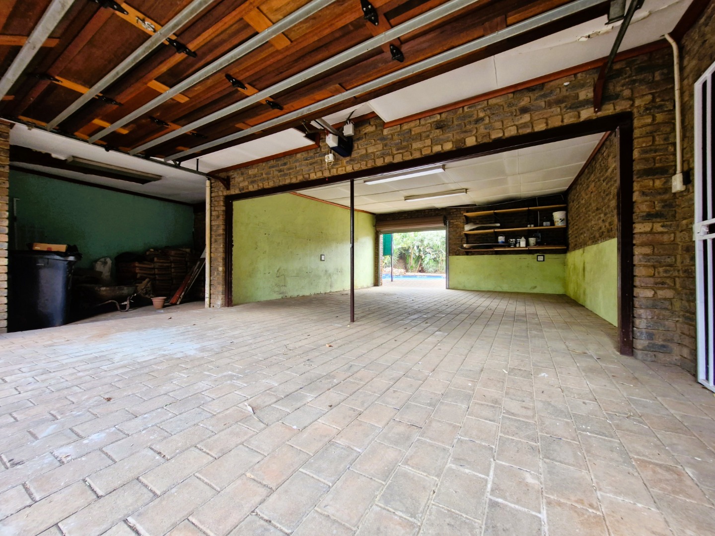 Outdoors, enjoy a sparkling pool, braai area, and spacious front and back gardens. The property also boasts four garages, fibre internet access, and prepaid electricity for convenience.