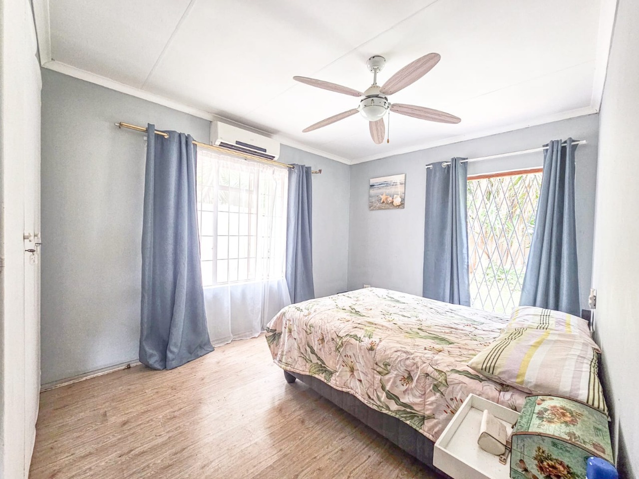 The home offers two comfortable bedrooms, each fitted with practical built-in wardrobes. The main bedroom benefits from both a ceiling fan and an air conditioning unit, ensuring year-round comfort. A well-appointed bathroom serves the household.