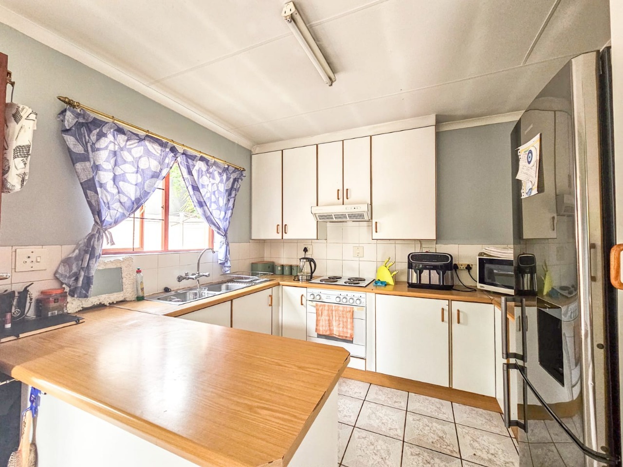 Step inside to find a thoughtfully designed interior spanning 176.00 sqm, featuring an open-plan layout that seamlessly connects the living and dining areas. Durable tiled flooring extends throughout, paired with neutral walls, offering a versatile canvas. The functional kitchen is equipped with white cabinetry, light wood-look countertops, a double sink, a built-in stove with an extractor fan, and a convenient breakfast bar, providing ample storage and preparation space.