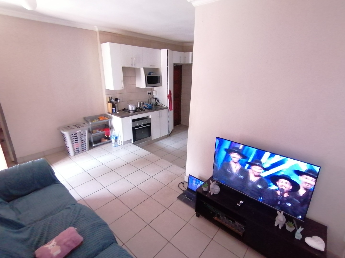 There is an open plan living area with an open patio at the front door. The open plan kitchen has lots of cupboards, an undercounter oven, gas hob, and single basin sink.