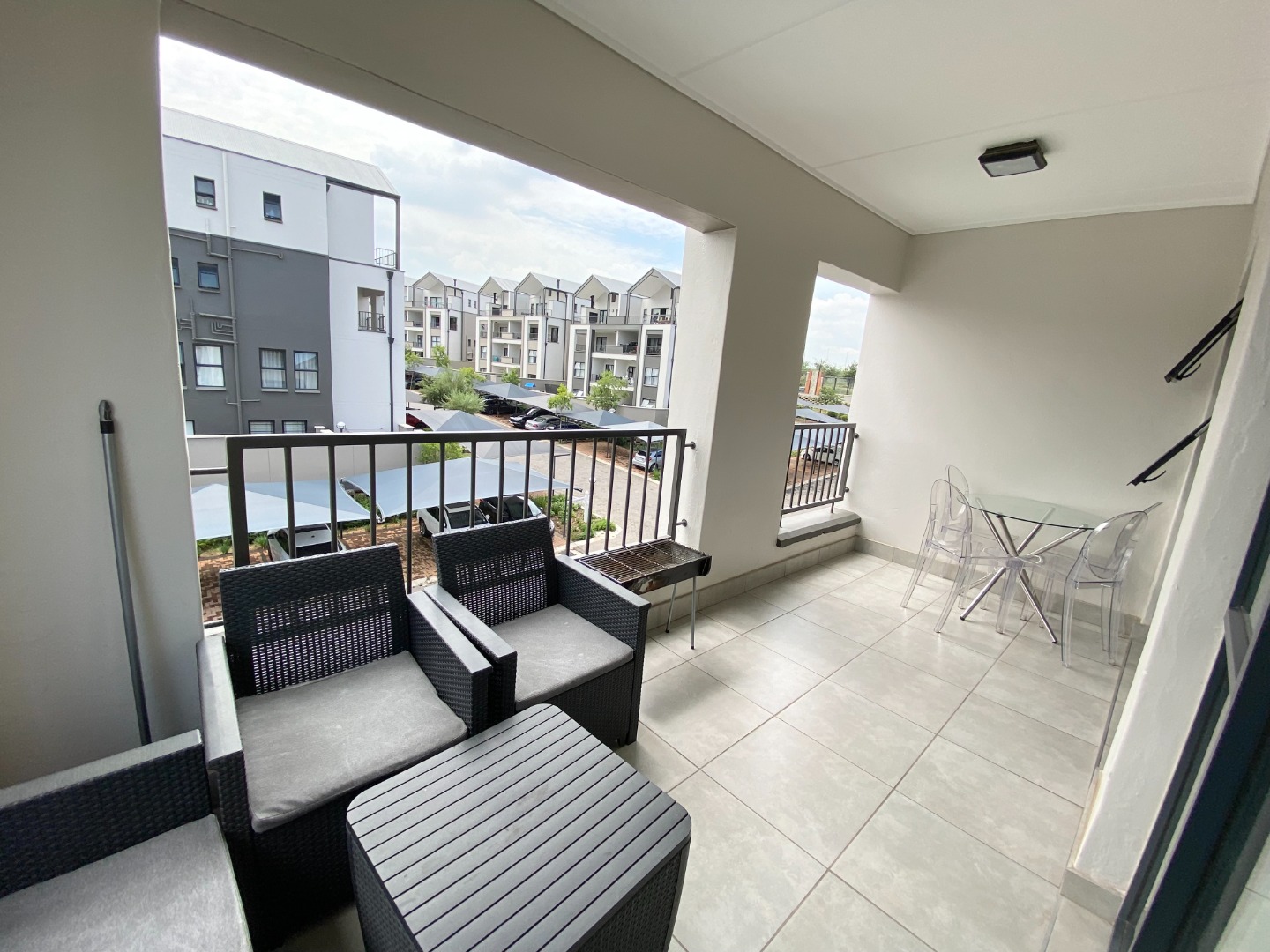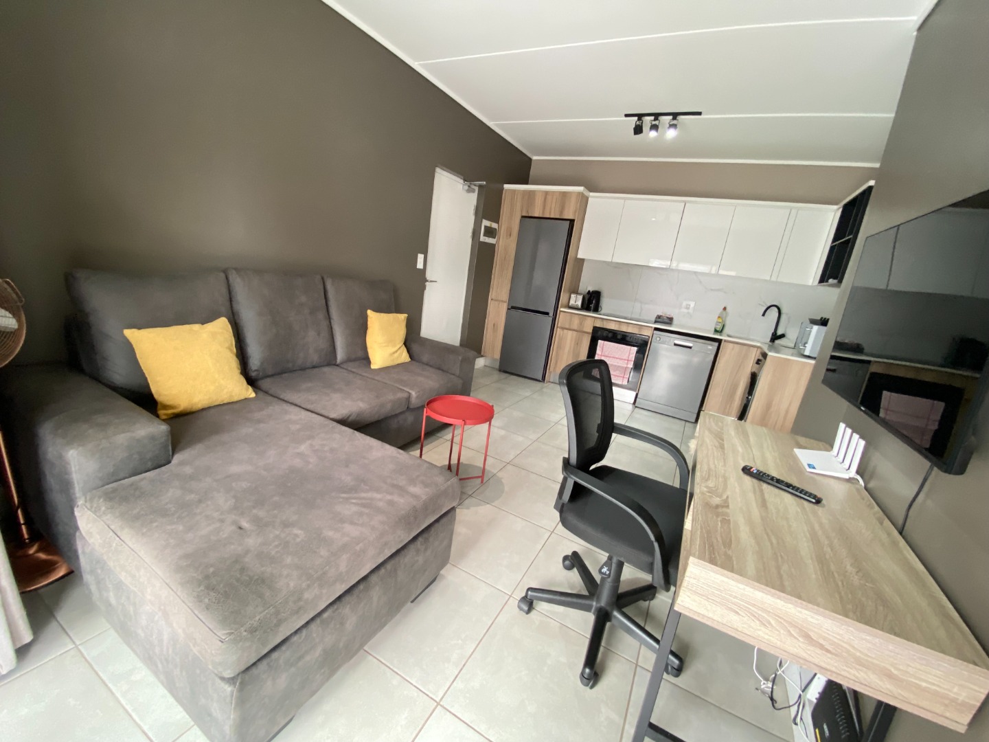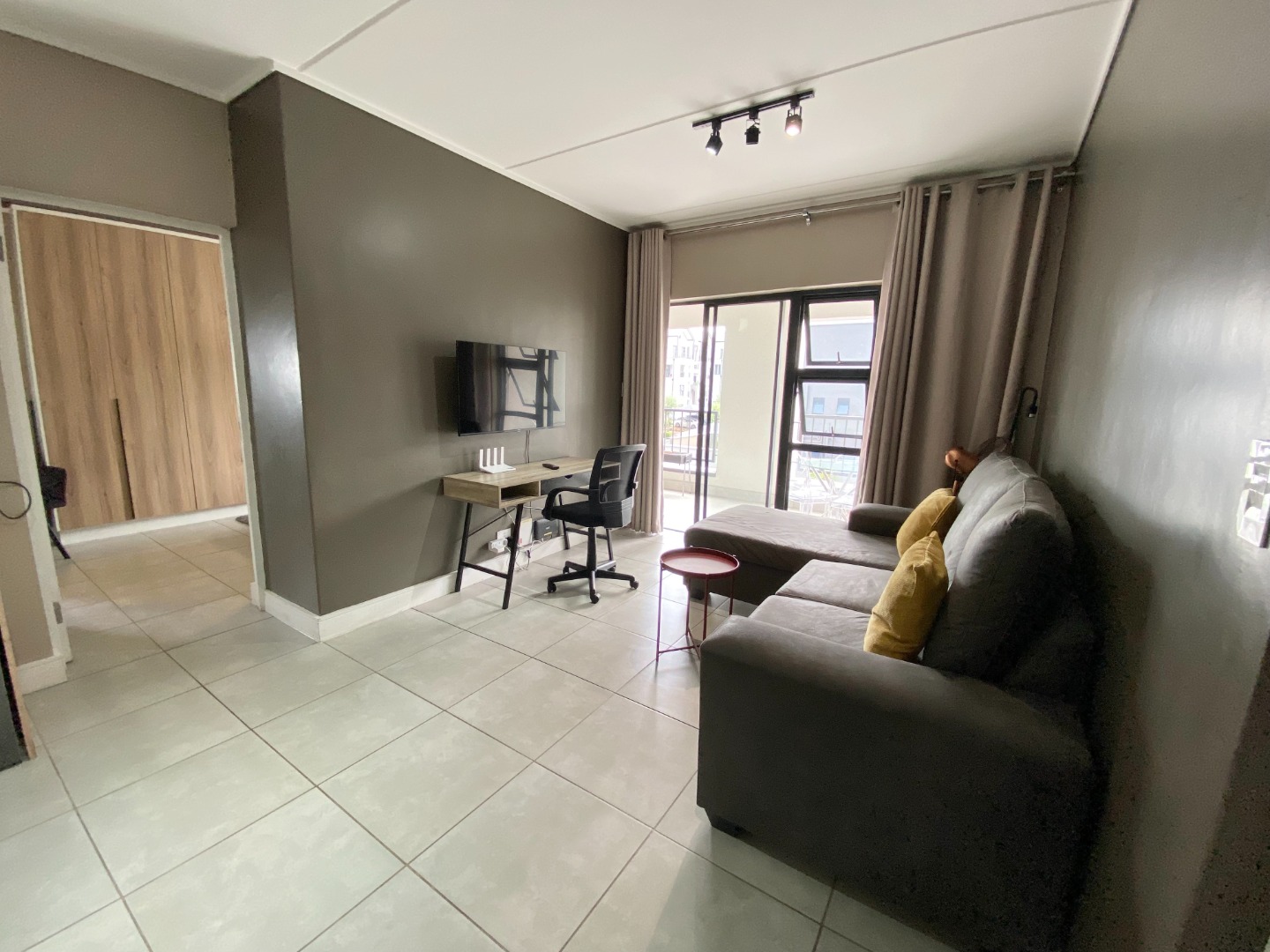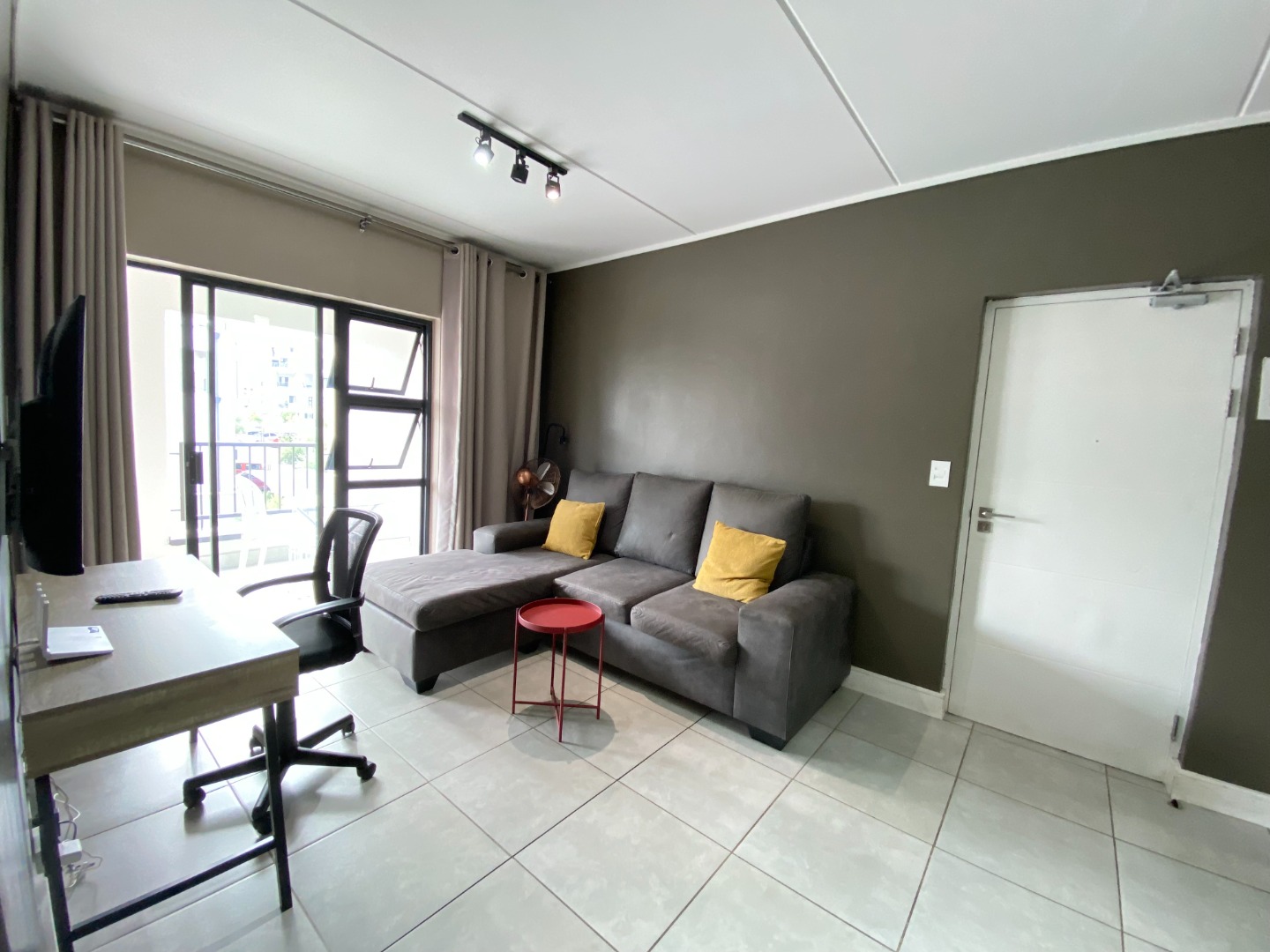 Discover an unparalleled lifestyle within this exquisite furnished apartment, nestled in the prestigious Waterfall suburb of Midrand. Upon entering the esteemed development, a grand, modern entrance with multi-lane controlled access and a serene water feature sets a tone of sophisticated security and meticulous design. This one-bedroom, one-bathroom residence epitomizes contemporary elegance, featuring an open-plan living area bathed in natural light, seamlessly extending to a private balcony for an effortless indoor-outdoor flow. The integrated workspace offers a dedicated area for productivity, complemented by stylish track lighting and a comfortable L-shaped sofa.