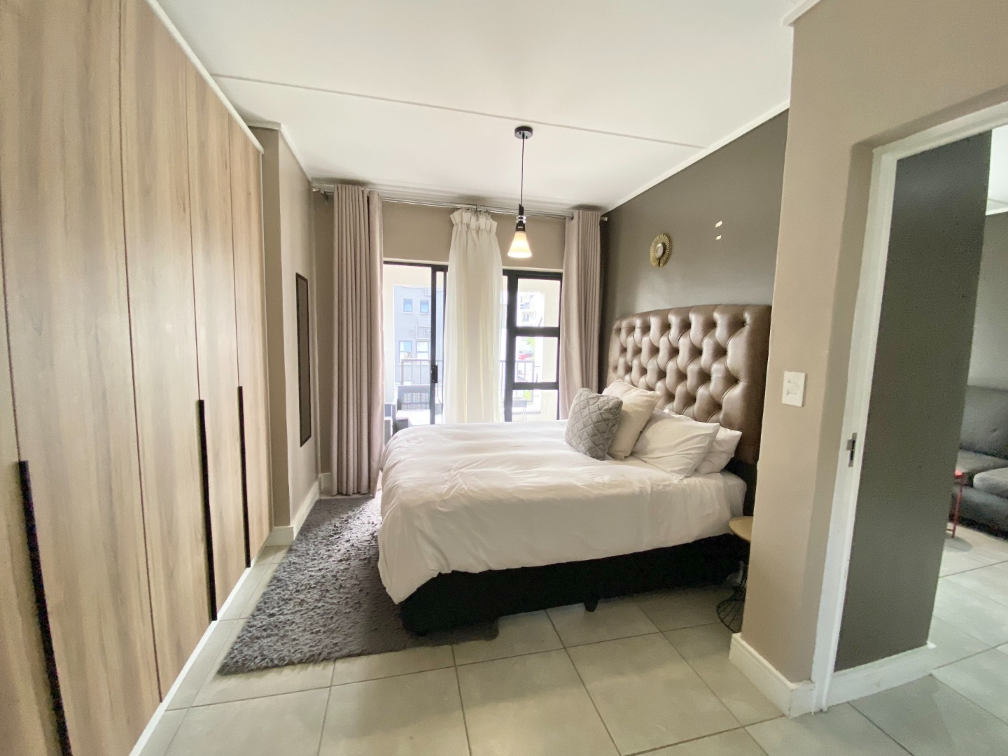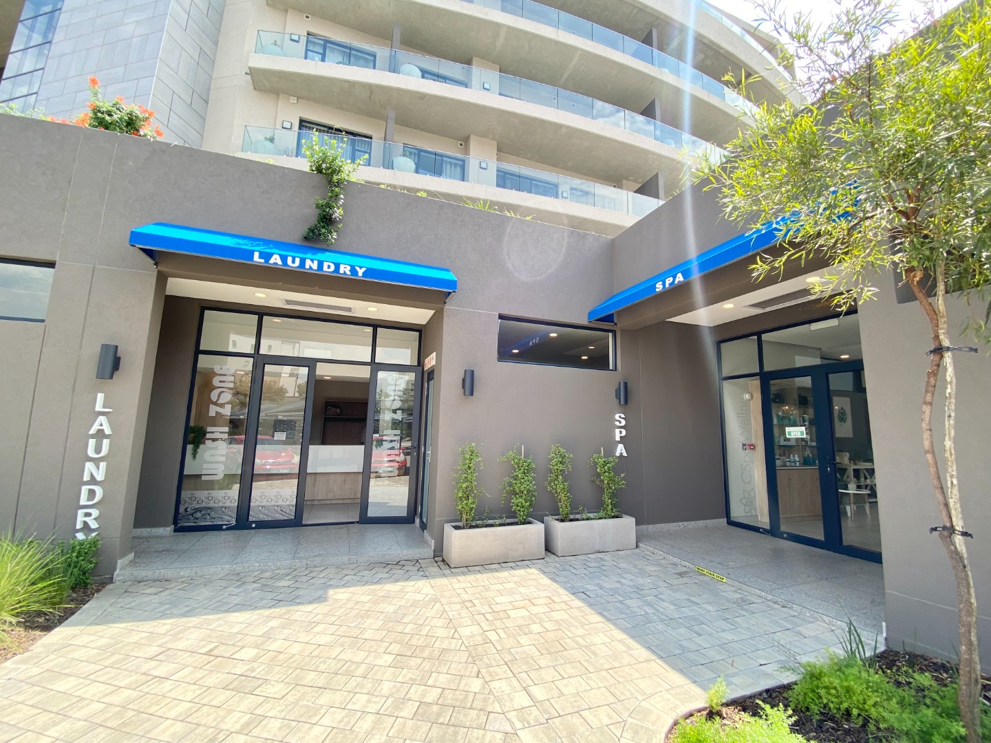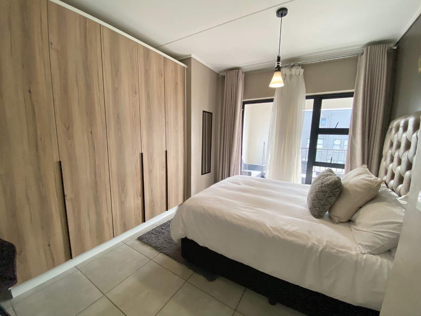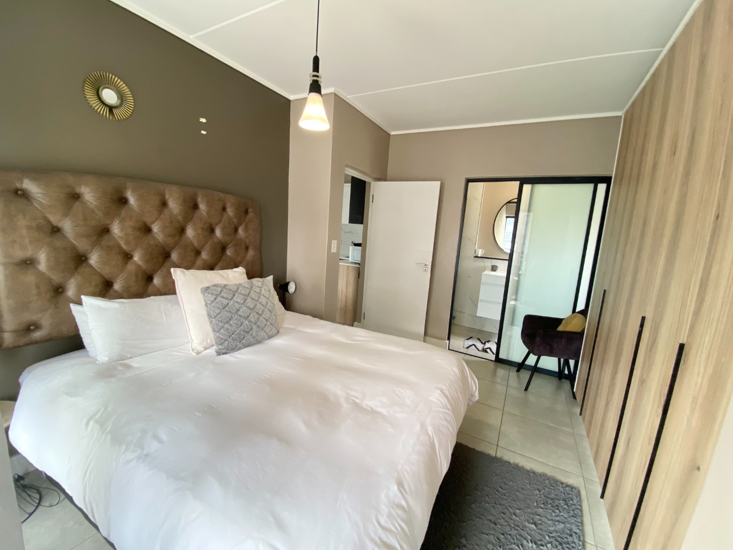 Discover an unparalleled lifestyle within this exquisite furnished apartment, nestled in the prestigious Waterfall suburb of Midrand. Upon entering the esteemed development, a grand, modern entrance with multi-lane controlled access and a serene water feature sets a tone of sophisticated security and meticulous design. This one-bedroom, one-bathroom residence epitomizes contemporary elegance, featuring an open-plan living area bathed in natural light, seamlessly extending to a private balcony for an effortless indoor-outdoor flow. The integrated workspace offers a dedicated area for productivity, complemented by stylish track lighting and a comfortable L-shaped sofa.