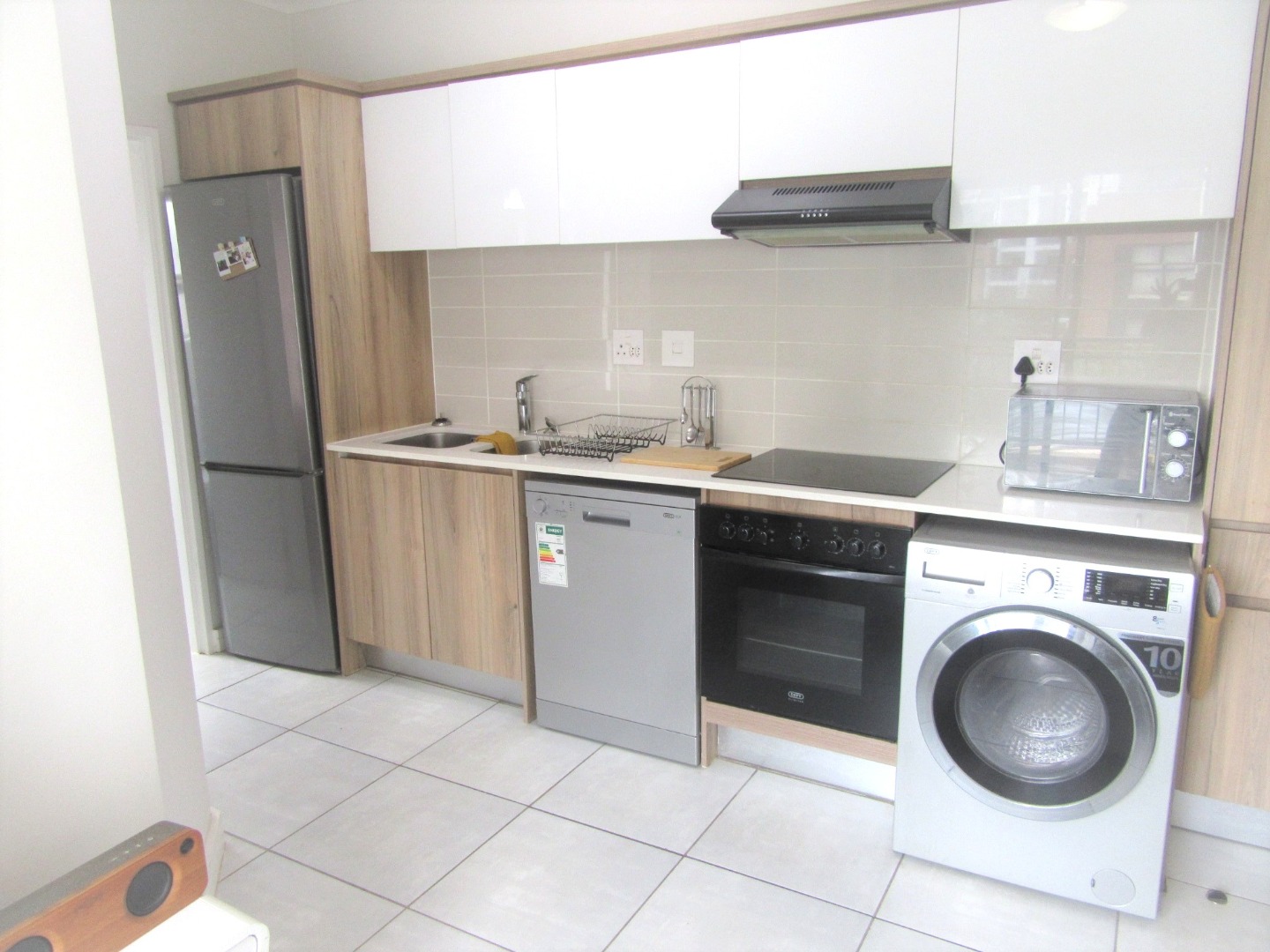 Modern open-plan kitchen with high-end appliances: fridge, washing machine, and dishwasher