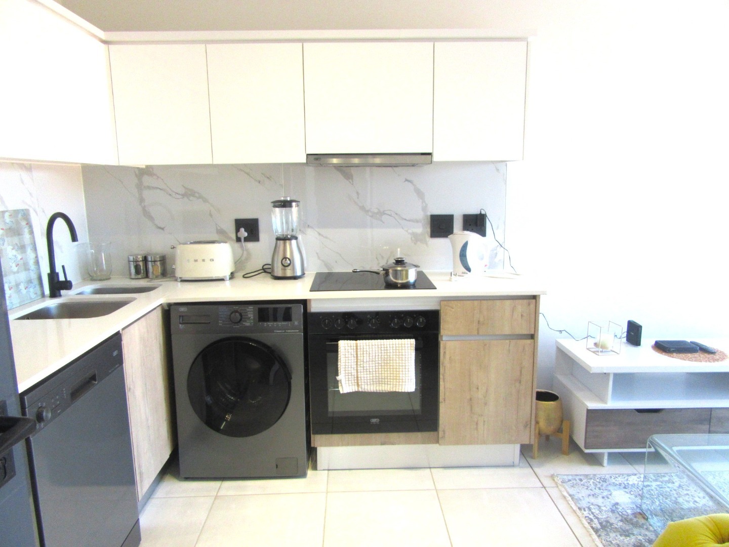 Modern open-plan kitchen with high-end appliances: fridge, washing machine, and dishwasher