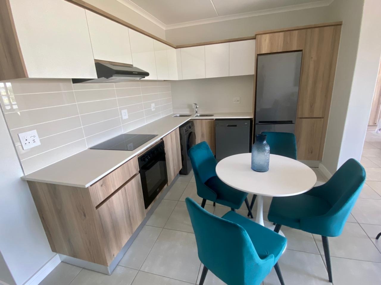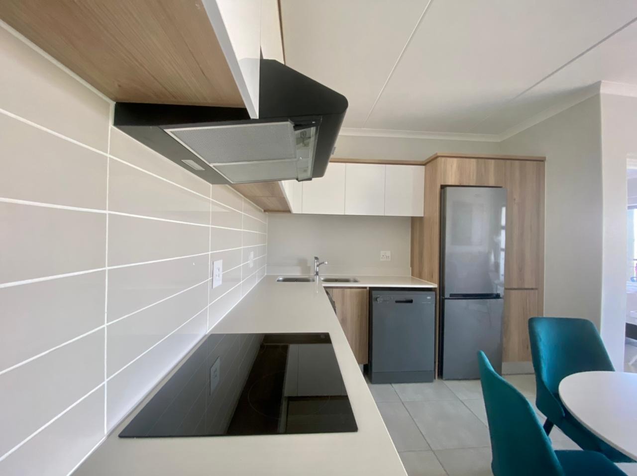 Modern open-plan kitchen with high-end appliances: fridge,washing machine, and dishwasher