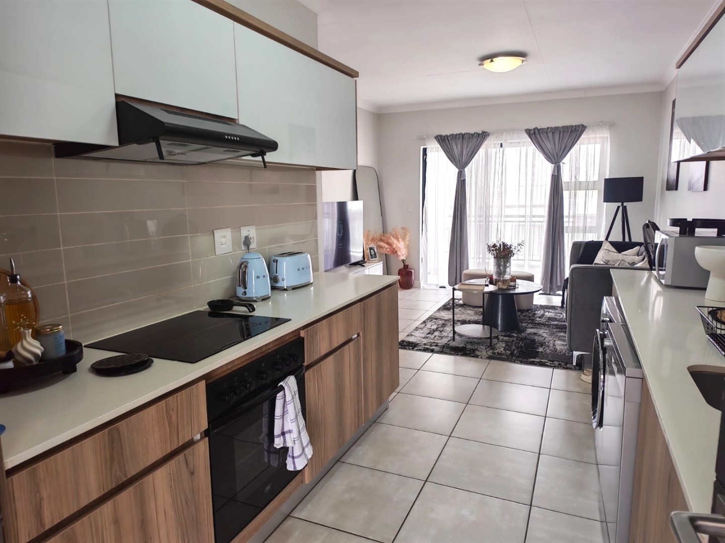 Modern open-plan kitchen with high-end appliances: fridge,