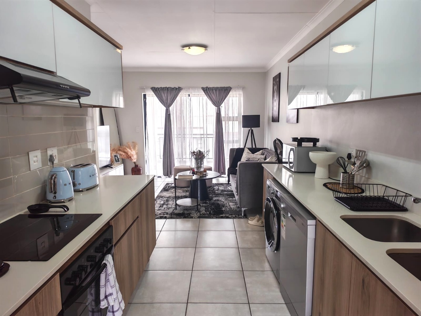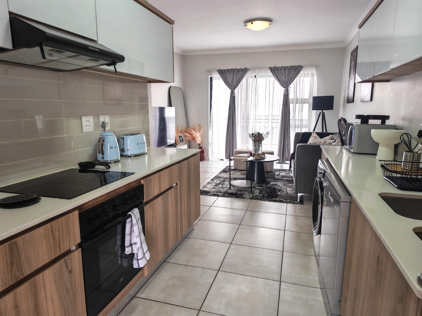 Modern open-plan kitchen with high-end appliances: fridge,