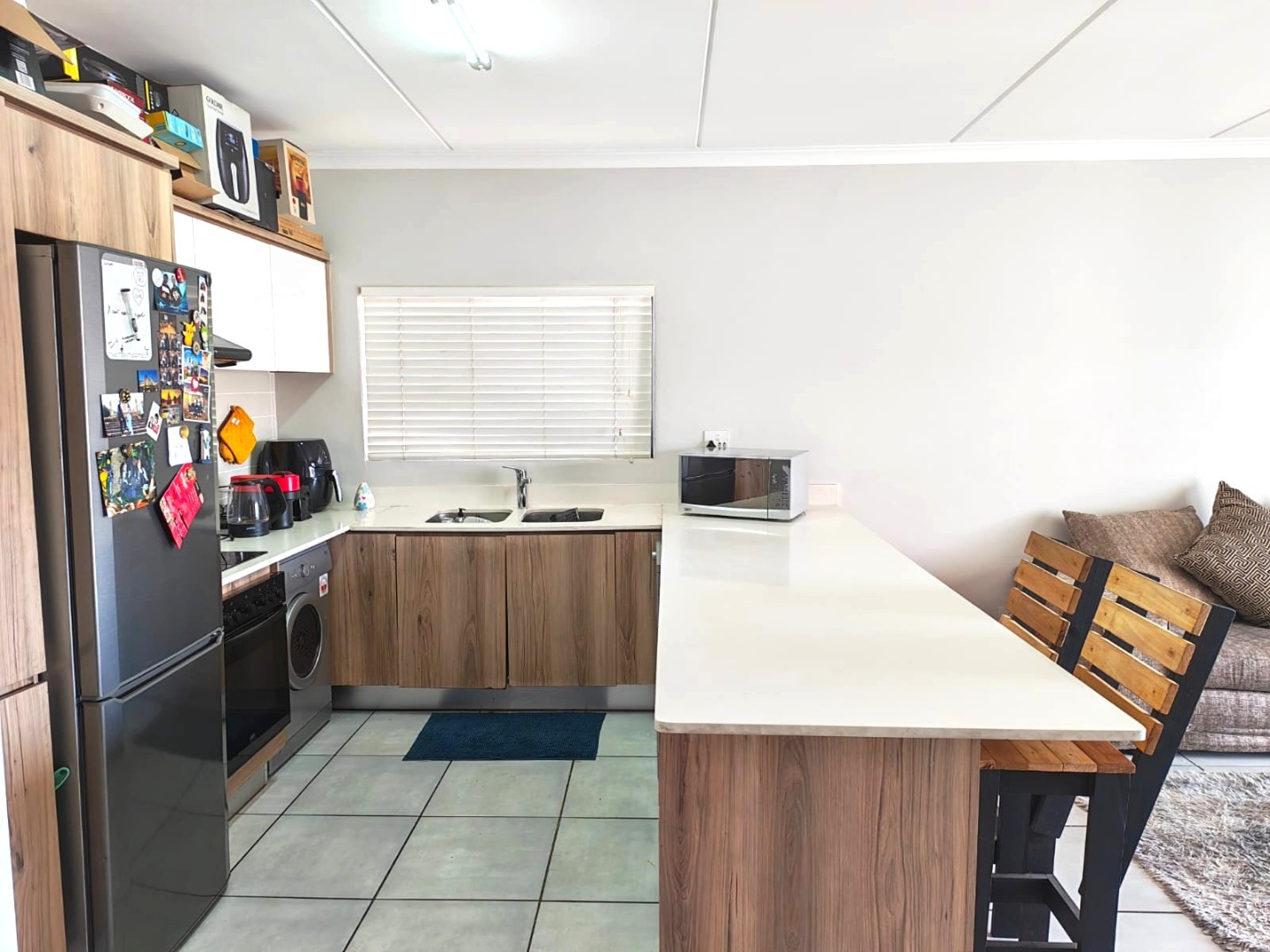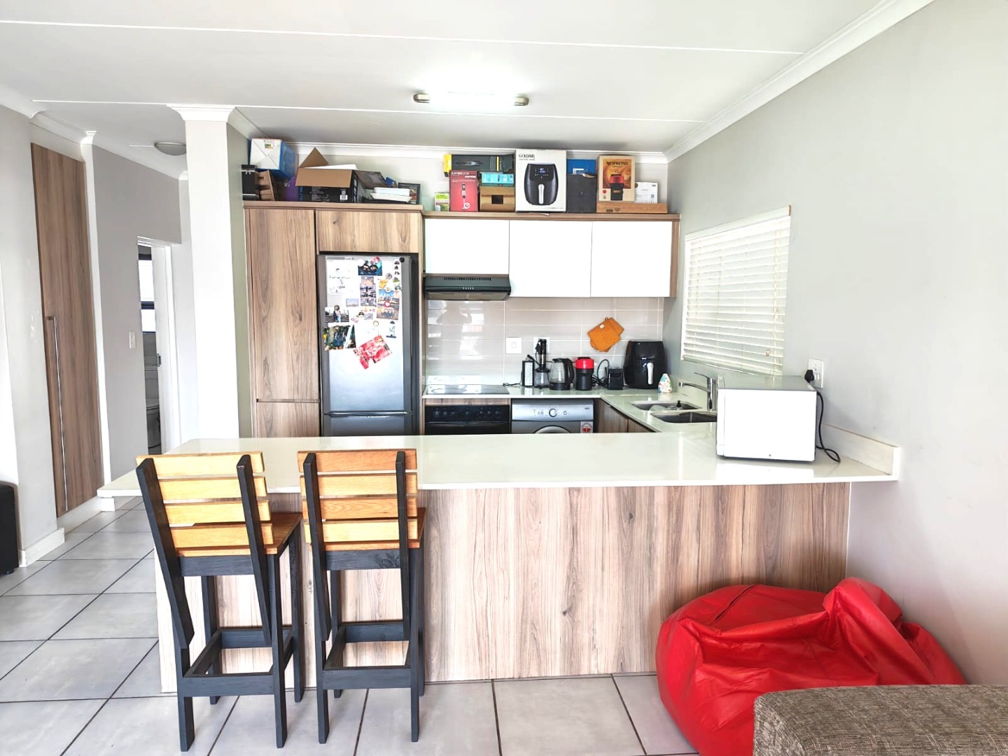 Modern open-plan kitchen with high-end appliances: fridge, washing machine, and dishwasher