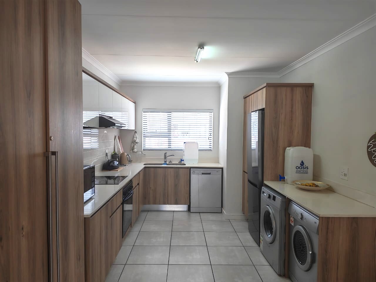 Modern open-plan kitchen with high-end appliances: fridge, washing machine, and dishwasher