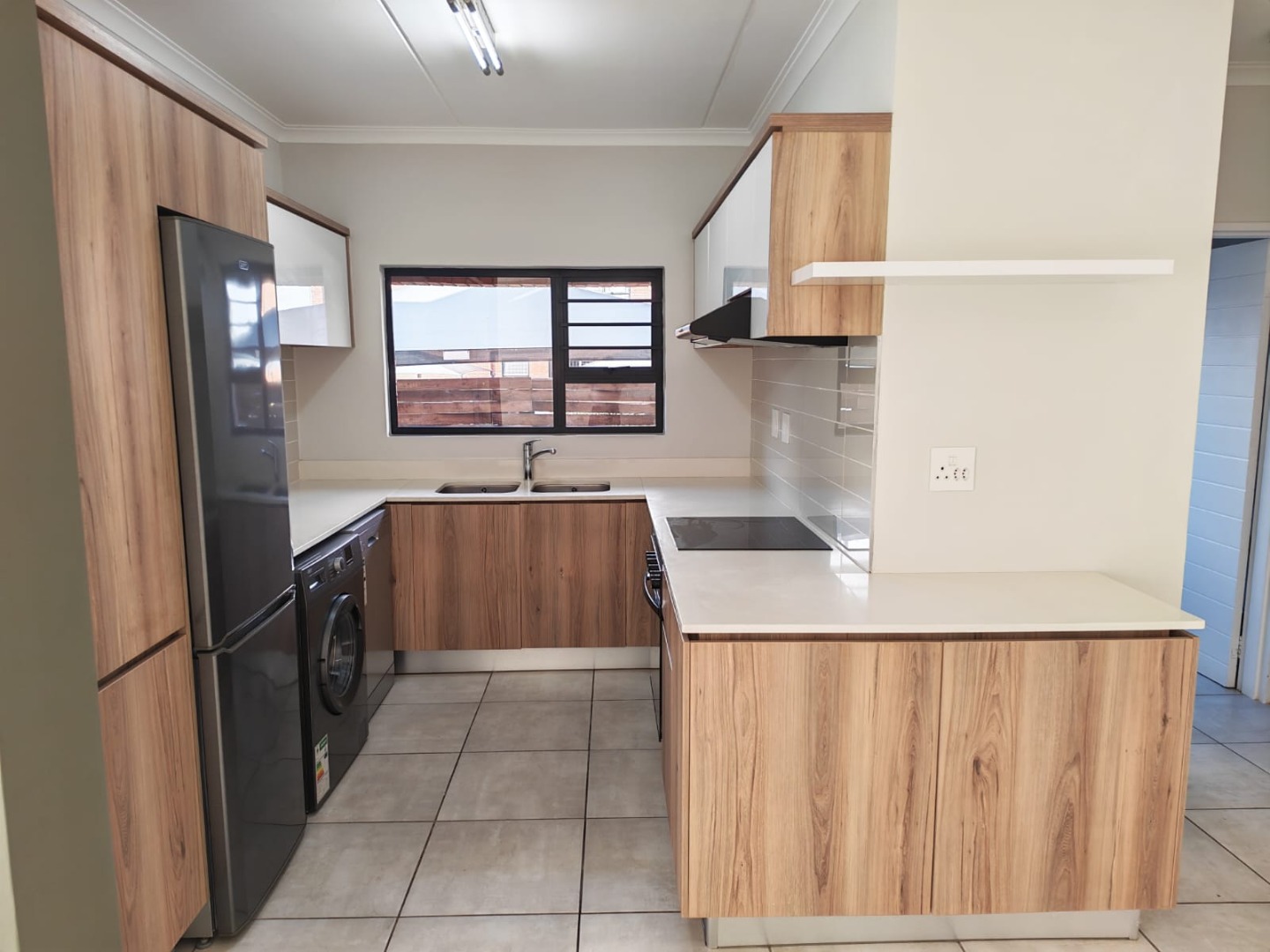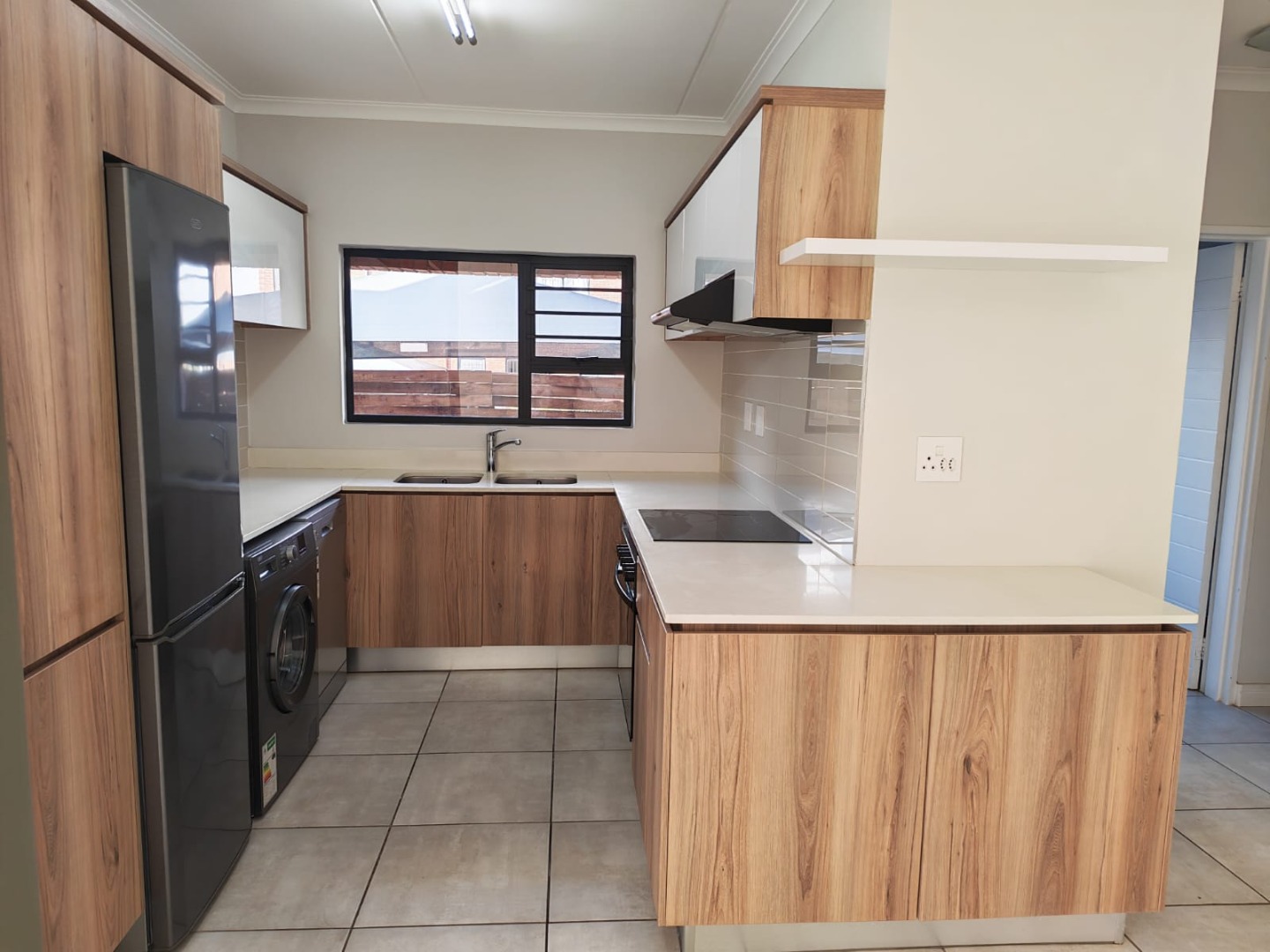 Modern open-plan kitchen with high-end appliances: fridge, washing machine, and dishwasher