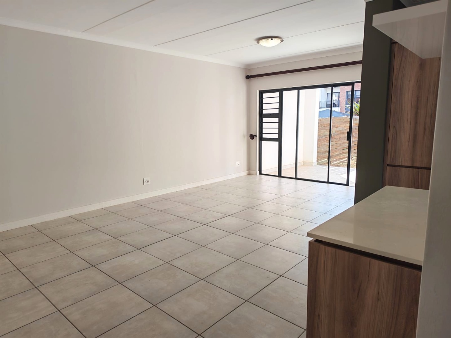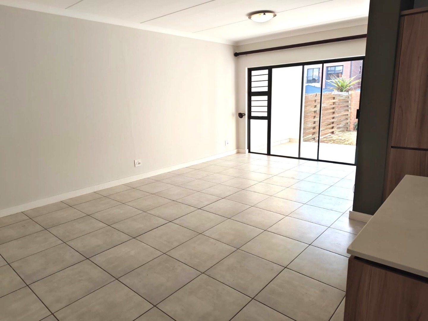 Spacious living area opens up onto a patio with a garden