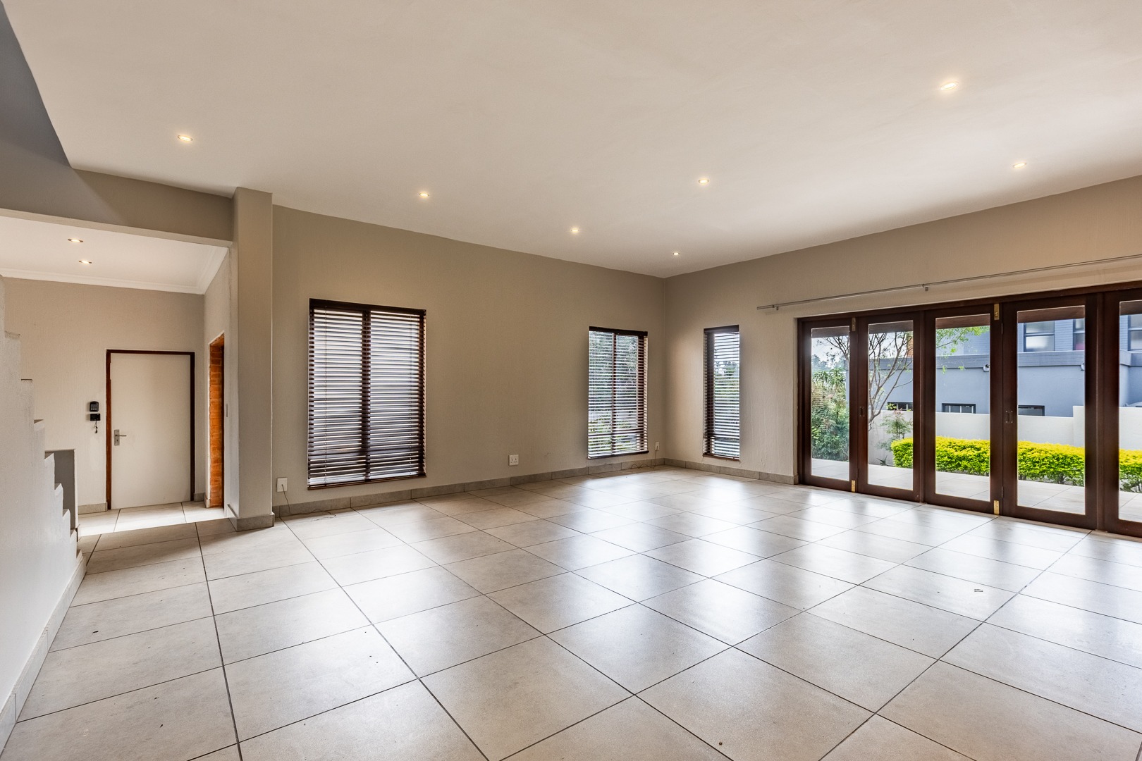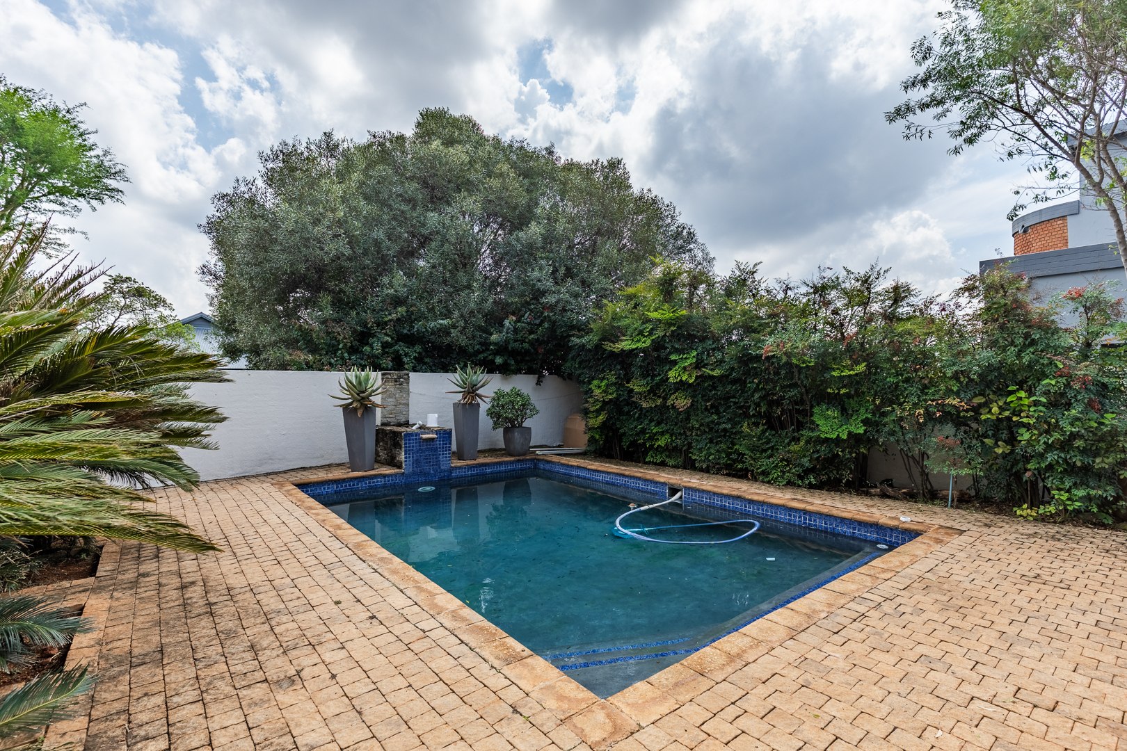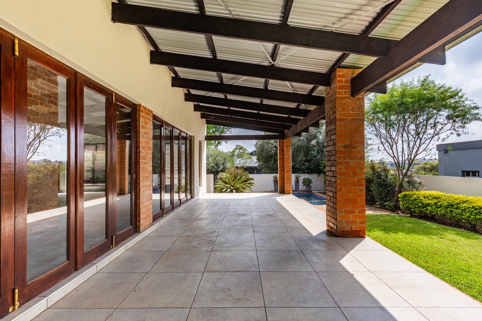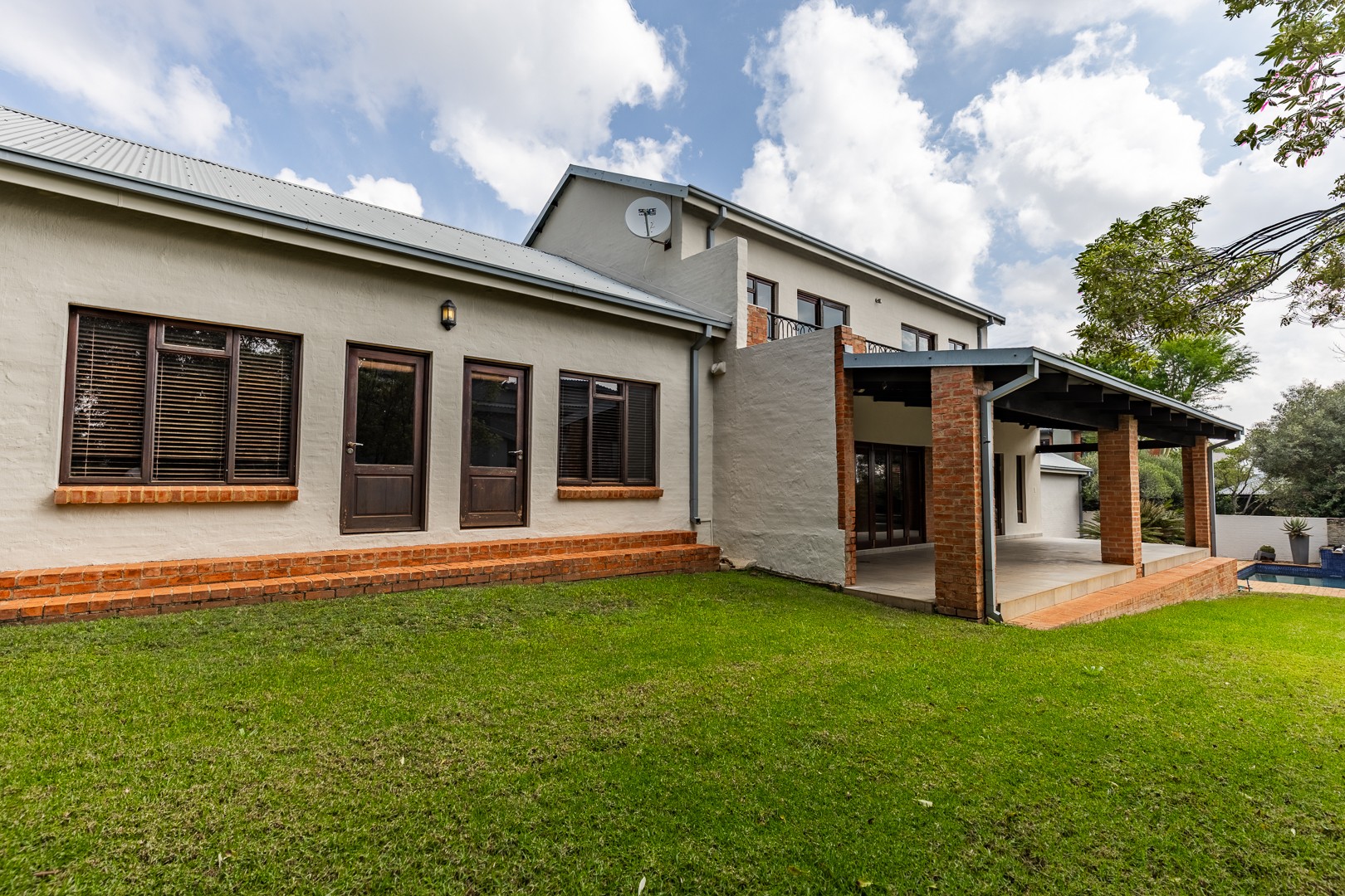 As you enter the home, you are welcomed into a light-filled open-plan lounge and dining area, seamlessly connected to a modern kitchen that overlooks the living space. The lounge and dining area open out through stacker doors to a well-maintained garden, creating an effortless indoor-outdoor flow. The outdoor space features a covered patio, ideal for entertaining, overlooking a sparkling swimming pool. The kitchen is stylish and functional, offering ample cupboard space and a separate scullery for added convenience. Downstairs, the home offers two well-sized bedrooms, a guest bathroom, and a separate toilet—ideal for family living or accommodating visitors. The spacious main bedroom is a true retreat, complete with a walk-in cupboard and a large full en-suite bathroom. Upstairs, you will find two additional generously sized bedrooms, both opening onto a balcony. One of these bedrooms includes its own en-suite bathroom with a shower.